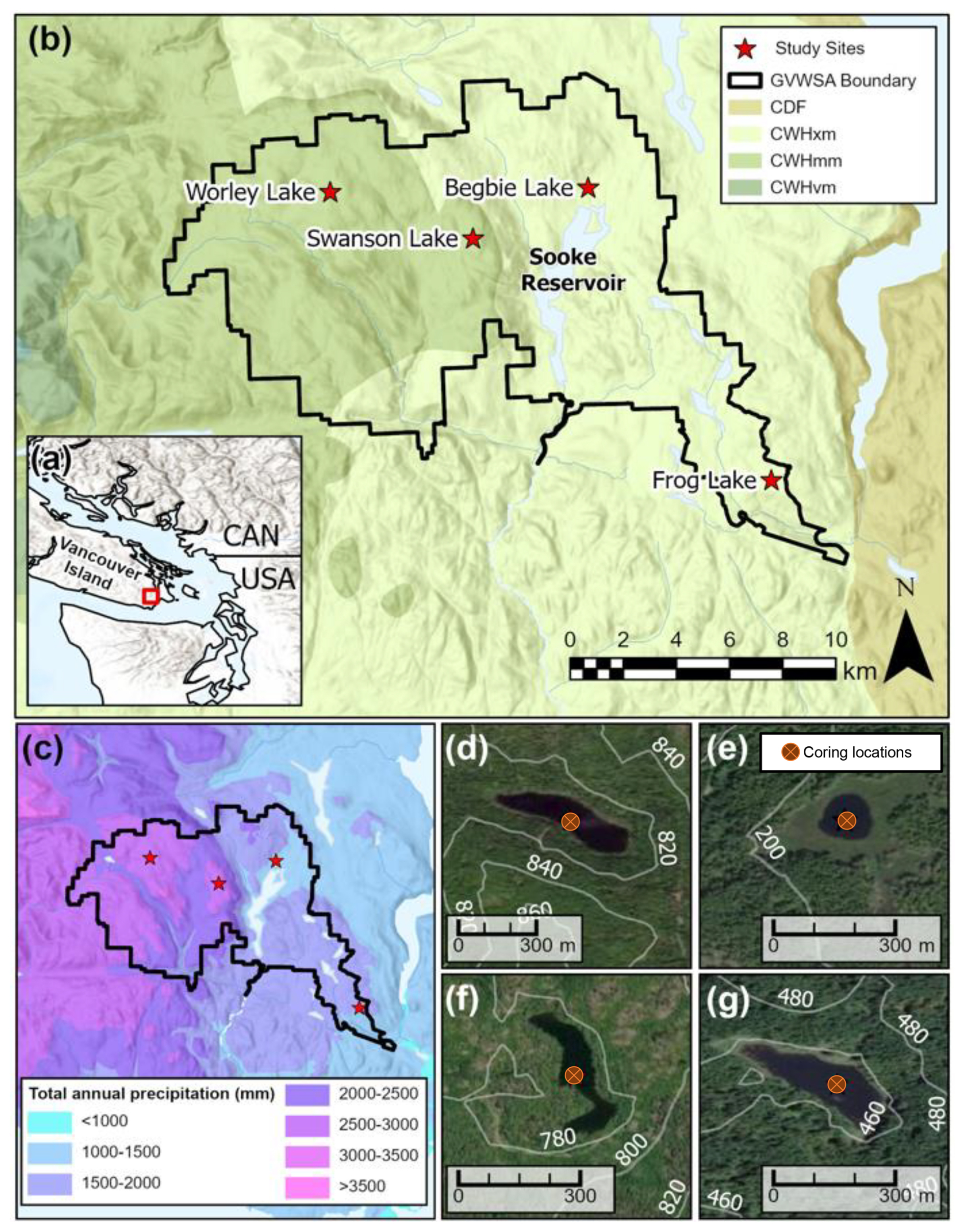 Figure 1Study area map of the Greater Victoria Water Supply Area (GVWSA). (a) Regional overview and study area (inset red box) with world hill shade topography (Esri, 2024a: Esri, Maxar, Airbus DS, USGS, NGA, NASA, CGIAR, N Robinson, NCEAS, NLS, OS, NMA, Geodatastyrelsen, Rijkswaterstaat, GSA, Geoland, FEMA, Intermap, and the GIS user community | Powered by Esri). (b) The GVWSA with site locations and biogeoclimatic ecological classification (BEC) zones and subzones (BC Forest Analysis and Inventory Branch, 2024). (c) Average total annual precipitation, 1991–2020 (Wang et al., 2016a). (d–g) Worley Lake, Begbie Lake, Swanson Lake, and Frog Lake respectively, showing coring locations, surrounding topography (20 m contours, white lines) and scale (0–300 m), world imagery (Esri, 2024b: Esri, Maxar, Earthstar Geographics, and the GIS User Community | Powered by Esri).
