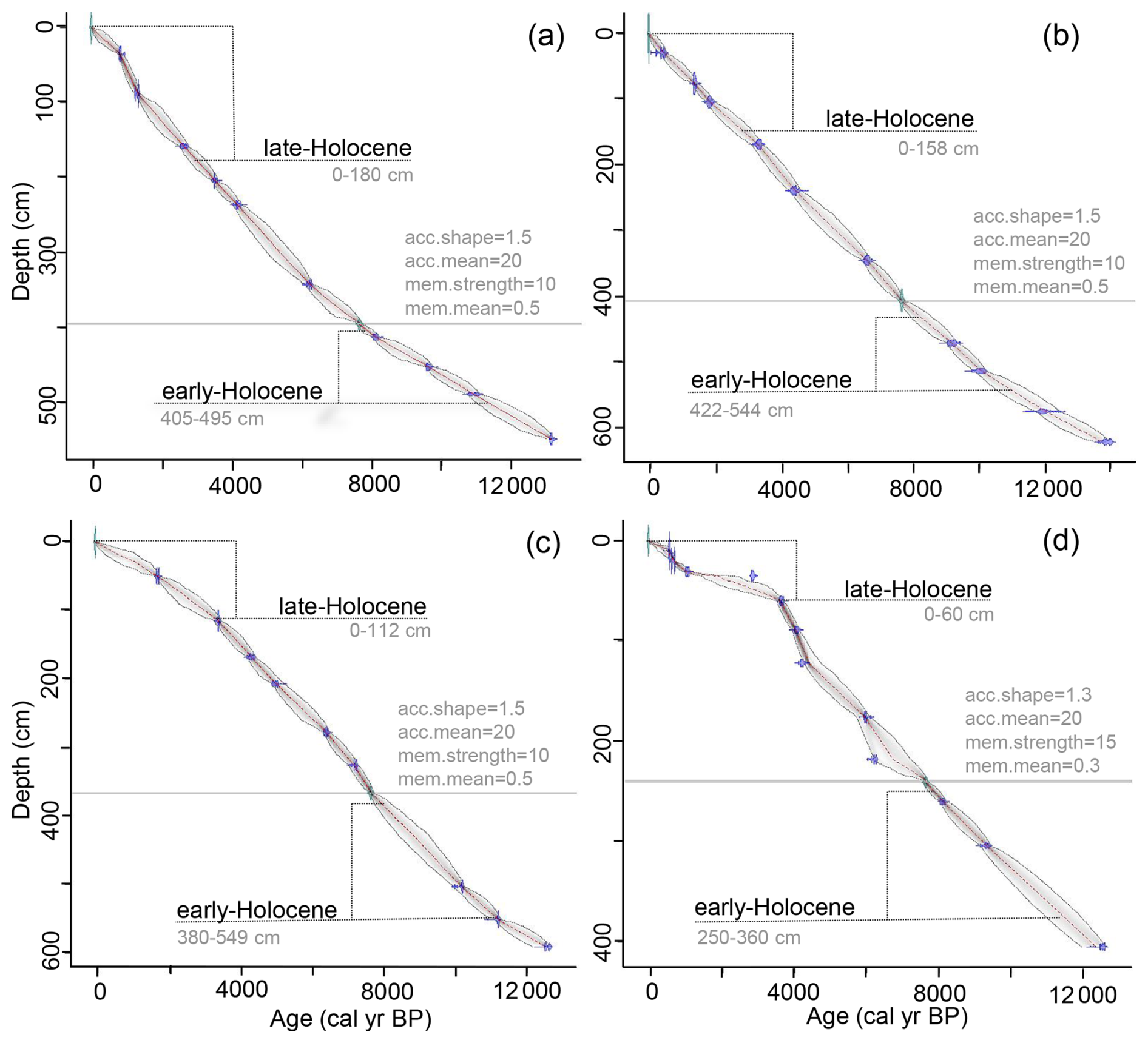Goring, S., Williams, J. W., Blois, J. L., Jackson, S. T., Paciorek, C. J., Booth, R. K., Marlon, J. R., Blaauw, M., and Christen, J. A.: Deposition times in the northeastern United States during the Holocene: establishing valid priors for Bayesian age models, Quaternary Sci. Rev., 48, 54–60, https://doi.org/10.1016/j.quascirev.2012.05.019, 2012.