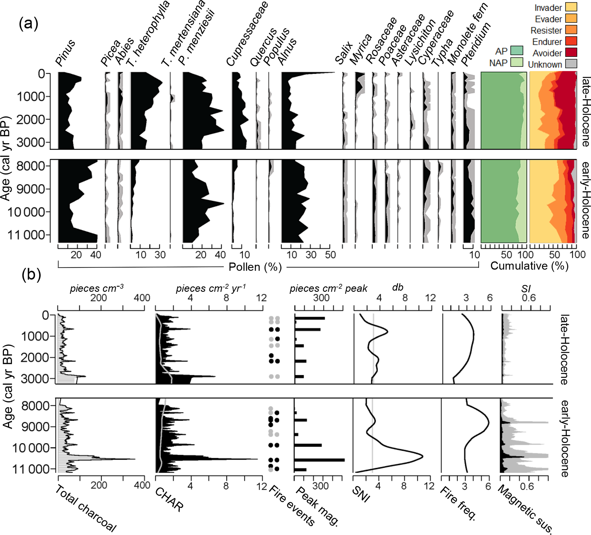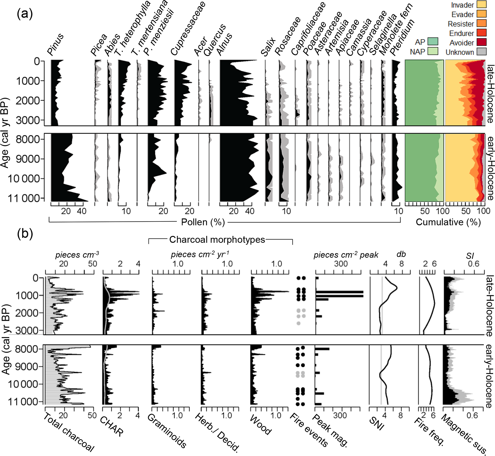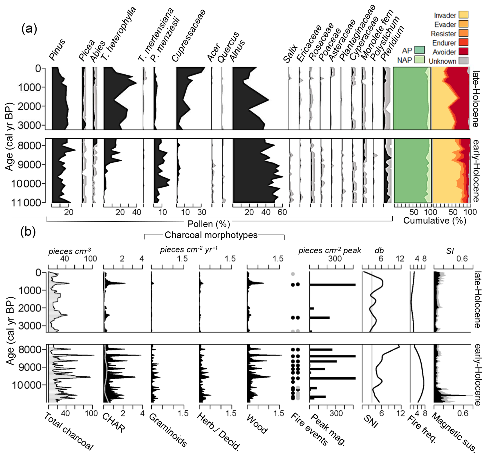 Figure 5Early- and late-Holocene pollen and charcoal results for Swanson Lake. (a) Pollen diagram from left to right: taxa with relative abundance > 5 % (black area represents scaled pollen abundance (%) with 5× exaggeration grey curve), cumulative pollen abundance (%) for arboreal pollen (AP) and non-arboreal pollen (NAP) types, and fire functional groups. (b) Charcoal diagram from left to right: charcoal concentration, charcoal accumulation rate (CHAR) with grey curve showing 95 % threshold, charcoal morphotype influxes, significant positive fire-related peaks (black dots) and positive peaks with a low signal-to-noise index (SNI; grey dots) at a 95 % and 99 % threshold, SNI, smoothed fire frequency, magnetic susceptibility with black representing raw values and grey 2× exaggeration.
