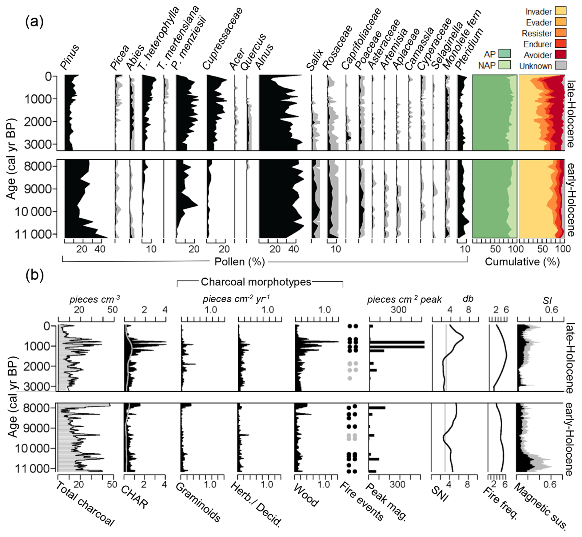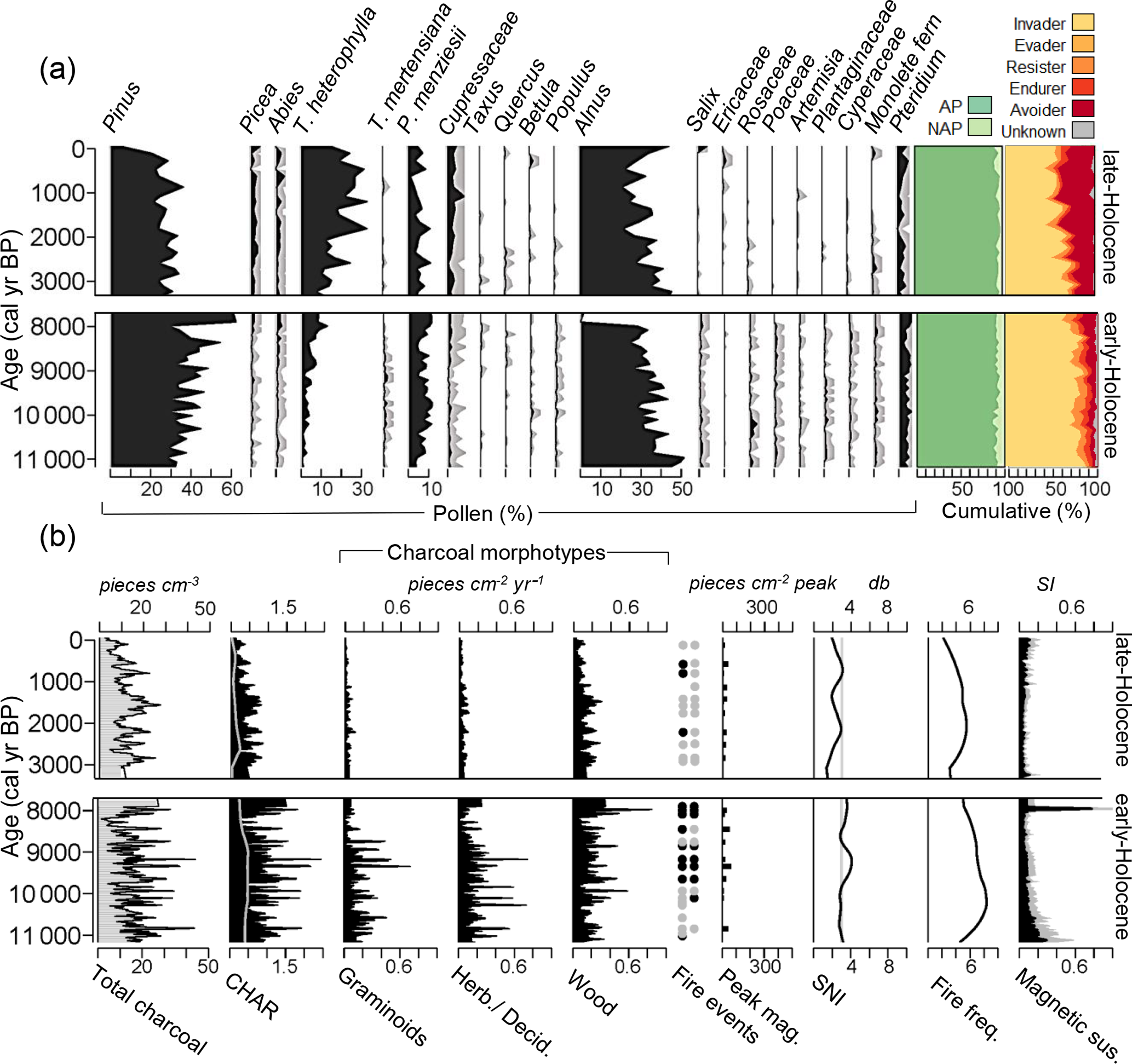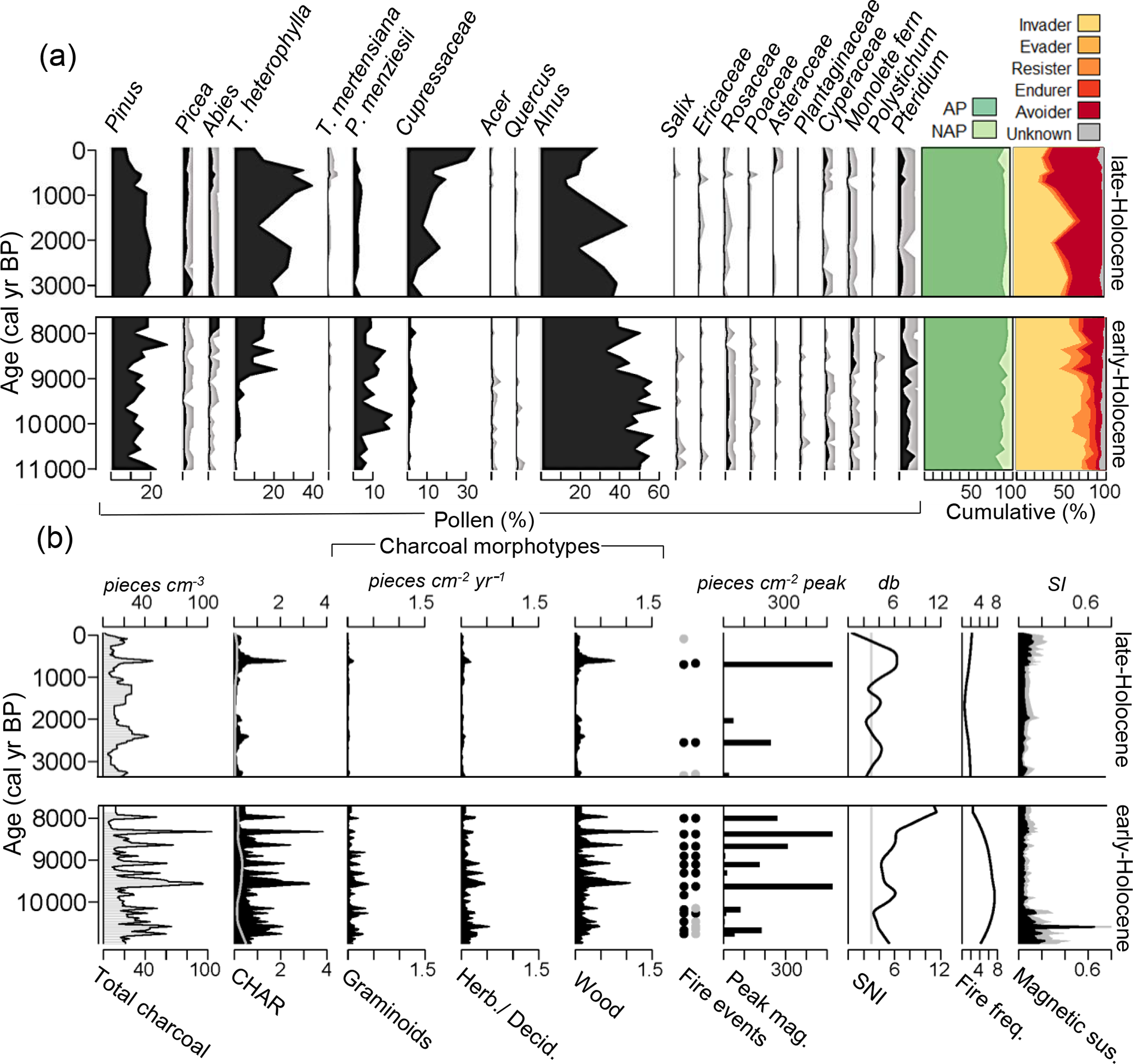 Figure 5Early- and late-Holocene pollen and charcoal results for Swanson Lake. (a) Pollen diagram from left to right: taxa with relative abundance > 5 % (black area represents scaled pollen abundance (%) with 5× exaggeration grey curve), cumulative pollen abundance (%) for arboreal pollen (AP) and non-arboreal pollen (NAP) types, and fire functional groups. (b) Charcoal diagram from left to right: charcoal concentration, charcoal accumulation rate (CHAR) with grey curve showing 95 % threshold, charcoal morphotype influxes, significant positive fire-related peaks (black dots) and positive peaks with a low signal-to-noise index (SNI; grey dots) at a 95 % and 99 % threshold, SNI, smoothed fire frequency, magnetic susceptibility with black representing raw values and grey 2× exaggeration.