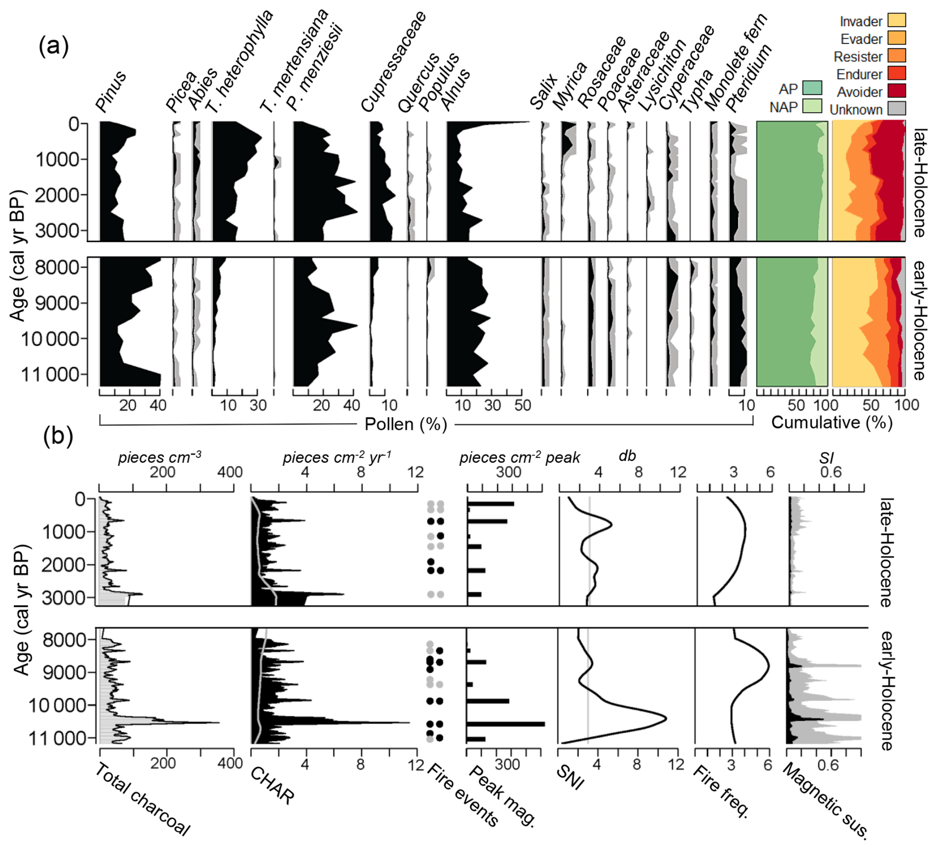 Figure 4Early- and late-Holocene pollen and charcoal results for Begbie Lake. (a) Pollen diagram from left to right: taxa with relative abundance > 5 % (black area represents scaled pollen abundance (%) with 5× exaggeration grey curve), cumulative pollen abundance (%) for arboreal pollen (AP) and non-arboreal pollen (NAP) types, and fire functional groups. (b) Charcoal diagram from left to right: charcoal concentration, charcoal accumulation rate (CHAR) with grey curve showing 95 % threshold, significant positive fire-related peaks (black dots) and positive peaks with a low signal-to-noise index (SNI; grey dots) at a 95 % and 99 % threshold, SNI, smoothed fire frequency, magnetic susceptibility with black representing raw values and grey 2× exaggeration.