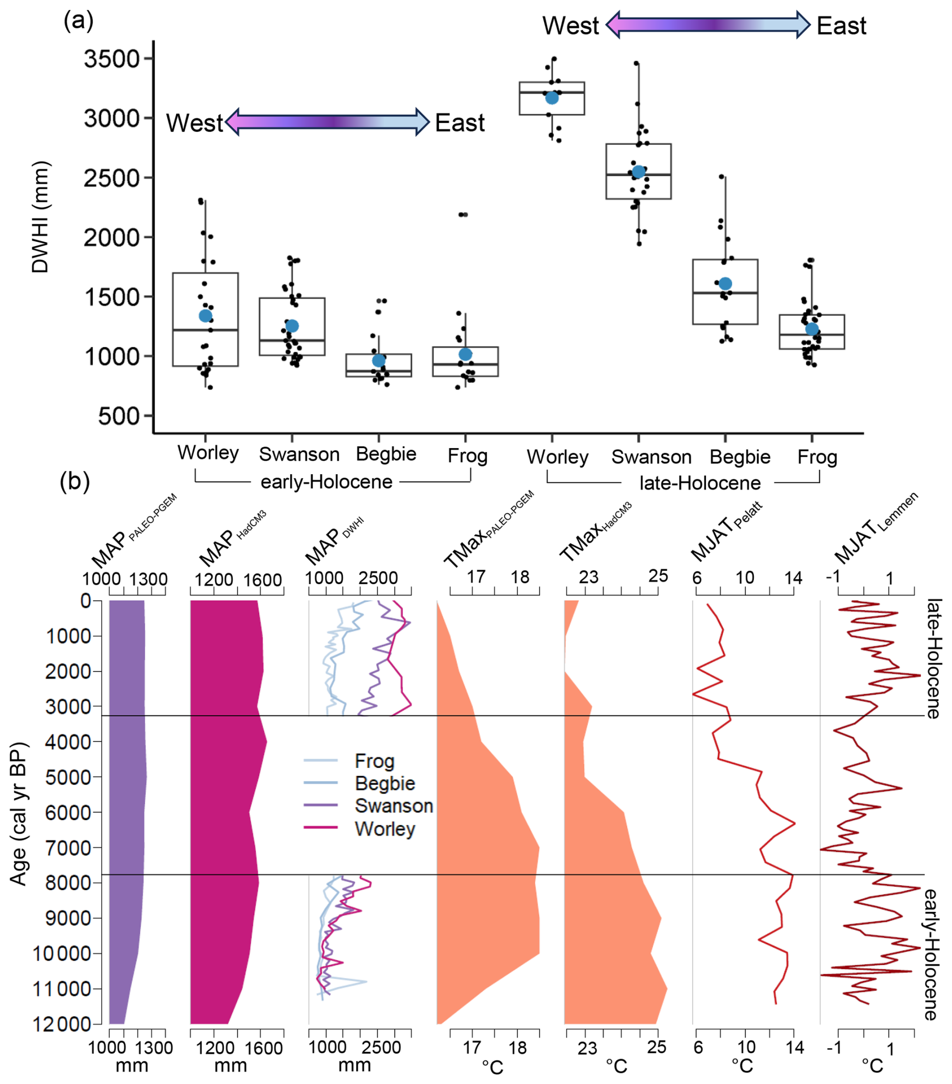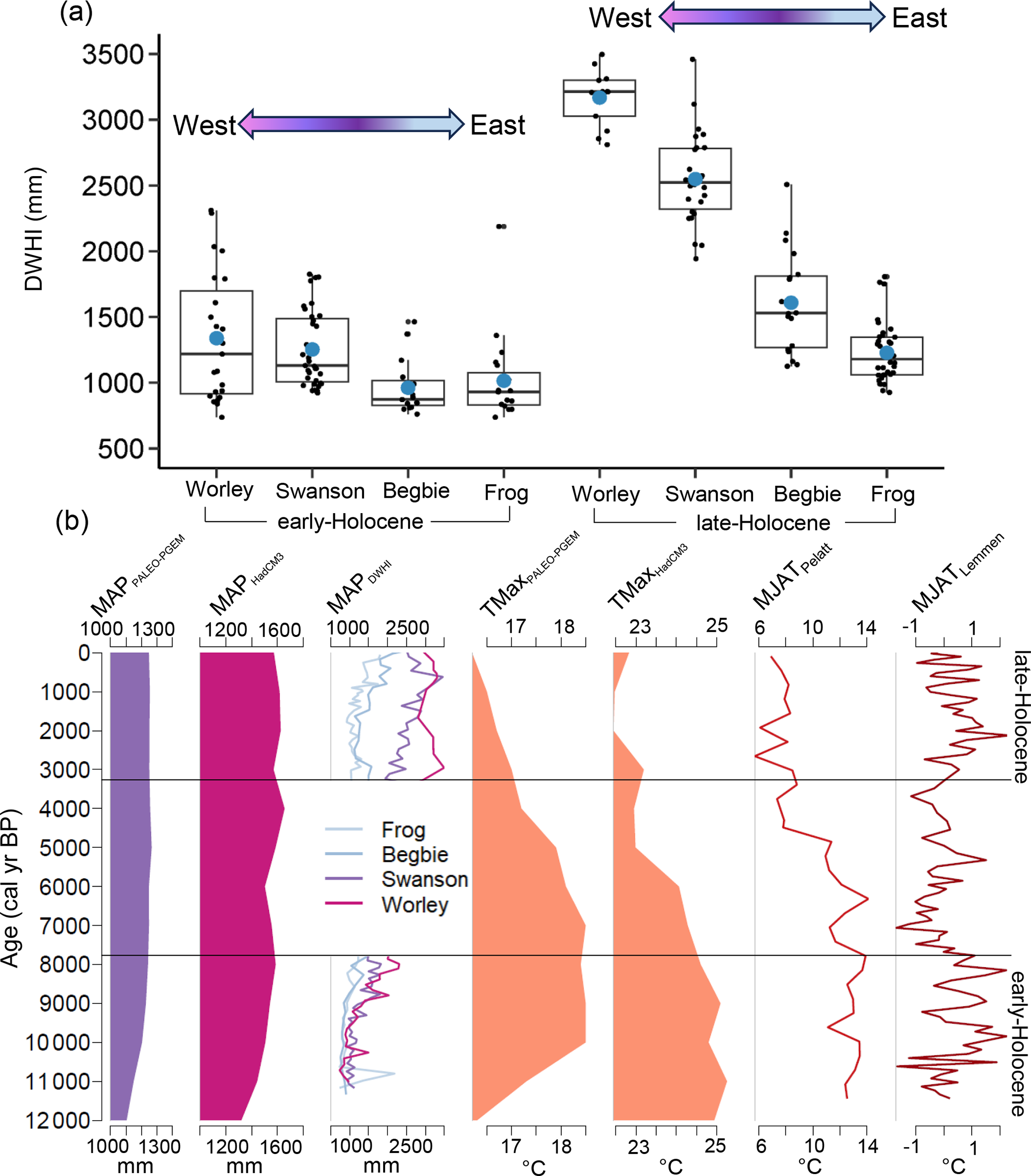 Figure 7Regional climate reconstruction for the Holocene. (a) Boxplots for the Douglas-fir/western hemlock index estimates of mean annual precipitation (MAPDWHI). Blue dots are means. (b) From left to right: MAP (BIO12) from PALEO-PGEM series (Baretto et al., 2023), MAP (BIO12) from HadCM3 (Beyer et al., 2020), down core MAPDWHI precipitation estimates for each site, mean July temperature (T7PALEO−PGEM) in degrees Celsius from PALEO-PGEM series (Baretto et al., 2023), mean July temperature (T7HadCM3) from HadCM3 (Beyer et al., 2020), chironomid inferred mean July air temperature (MJAT) (Pellatt et al., 2000), and chironomid inferred (MJAT) anomalies (Lemmen and Lacourse, 2018).