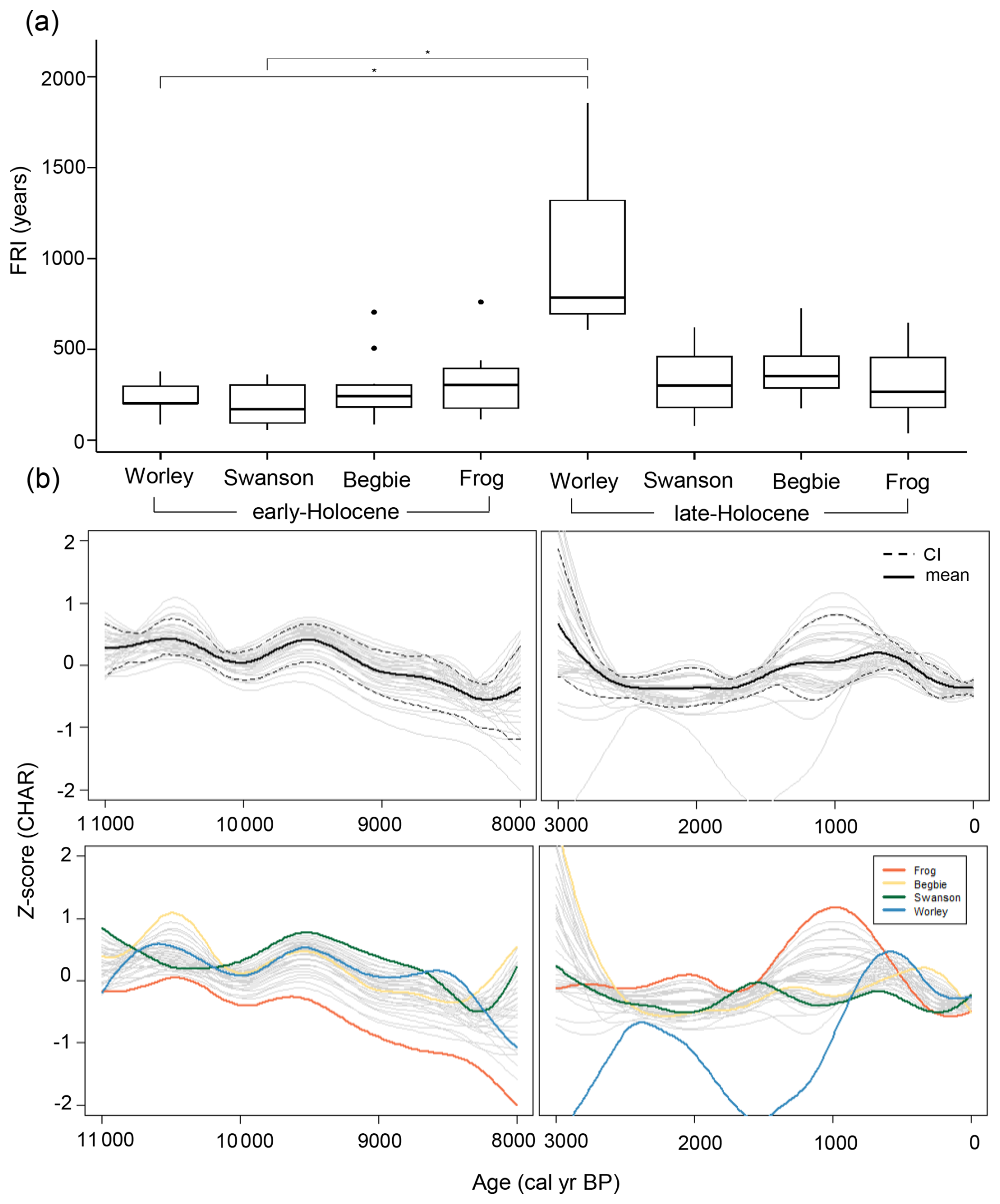 Figure 8Comparison of fire return intervals (FRI) and biomass burning. (a) FRI box and whisker plots comparing sites. Boxes represent the first and third quartiles, black line shows the median, whiskers are minimum and maximum range and black dots are outliers. Top black bracket and asterisks shows results of Wilcoxon signed rank test on paired samples (W = 0, p = 0.01, padj = 0.04, r = 0.68) and results of Dunn's pairwise comparison (Z = 3.35, padj(Bonferroni) = 0.022). (b) Standardized charcoal influx (Z scores) showing biomass burning based on a regression of presampled and binned records at 20-year time step and 500-year half width smoothing. Bootstrapped confidence intervals (CI) and mean from 5000 resampled iterations. Coloured curves present local fits for each site.