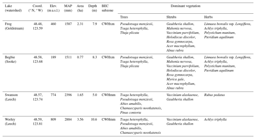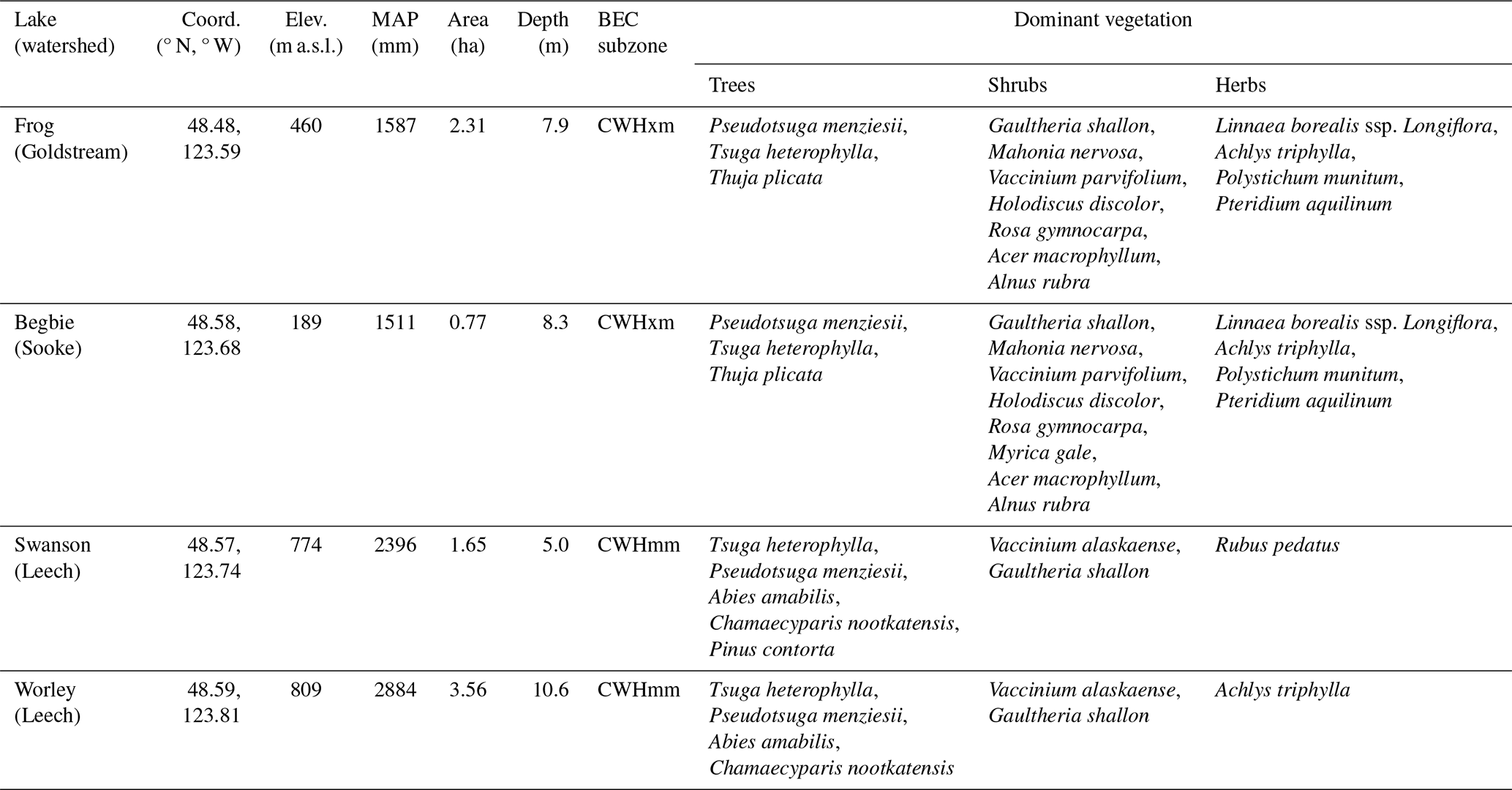 Table 1Characteristics of study lakes within the Greater Victoria Water Supply Area (GVWSA). Location and coordinates, elevation above sea level (a.s.l.), mean annual precipitation (MAP) from Climate BC (Wang et al., 2016a), lake area, lake depth, biogeoclimatic ecological classification (BEC) subzones (BC Forest Analysis and Inventory Branch, 2024), and dominant vegetation.