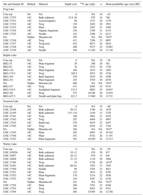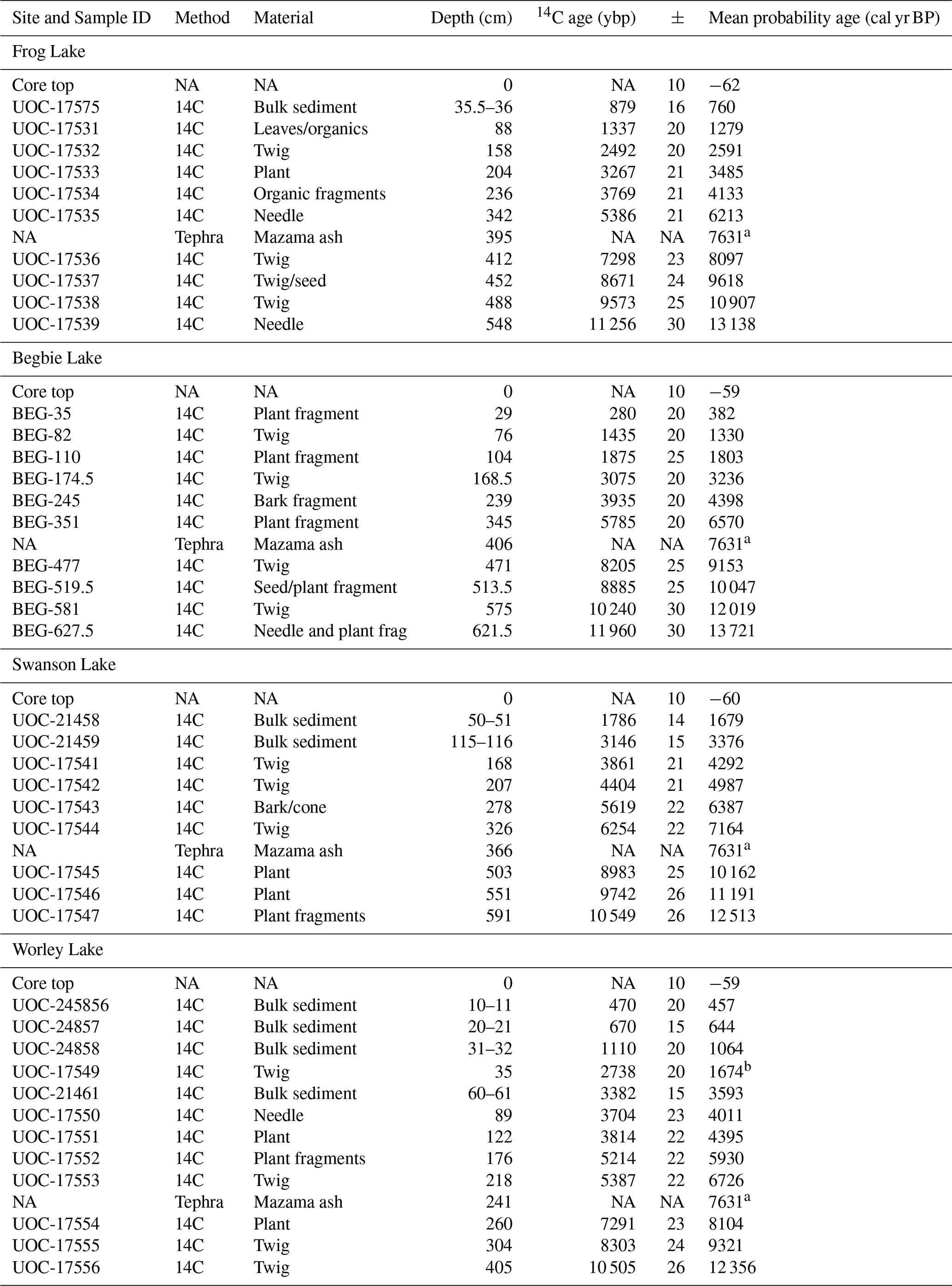 Sediment cores were recovered from the deepest part of each lake basin. Upper unconsolidated sediment was recovered using a 50 cm long Kajak corer (Kajak et al., 1965), whereas a Livingstone piston corer (Wright, 1967; Livingstone, 1955) was used to retrieve deeper sediment in 1 m increments. To establish chronologies, bulk sediment samples and plant macrofossils were sent to the University of Ottawa A.E. Lalonde AMS Laboratory for radiometric (14C) age determination (Table 2). Radiocarbon ages were calibrated to calendar years using OxCal v4.4 (Ramsey, 2009) and the IntCal20 calibration curve (Reimer et al., 2020). A volcanic ash layer, consisting of glass shards when viewed under a compound microscope, was observed in all cores. Given its stratigraphic location relative to other radiocarbon dates coupled with the known distributions of regional ash plumes, it is likely to be Mazama ash (Egan et al., 2015). The age-depth model was established using the Bacon package for R (V 4.1.1), which uses a Bayesian approach to estimate accumulation rates from radiocarbon dates through Markov Chain Monte Carlo (MCMC) iterations (Blaauw and Christen, 2011). Given that Mazama ash is an instantaneous event, its thickness was omitted from modelling. Priors for the accumulation rate were modelled using a gamma distribution, with memory (autocorrelation) defined using a beta distribution (Fig. 2). Default parameters (Goring et al., 2012) were applied to all models except Worley Lake where the acc.shape was decreased to reduce the peakedness of the prior distribution and produce a better fit.