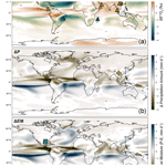 Accompanying these temperature anomalies are notable anomalies in precipitation amount, δ18Op, and effective moisture (Fig. 4). Precipitation decreases while effective moisture increases throughout much of the North Atlantic, with the responses most pronounced in the regions with greatest cooling. The increase in effective moisture in this region indicates that the evaporation reduction outpaces the precipitation reduction (Fig. 4c). Large scale drying occurs across much of the northern tropics, with the largest precipitation anomalies occurring in the tropical Pacific and Atlantic basins associated, with a southward shift of the Pacific and Atlantic ITCZs occurring in response to the freshwater forcing (Fig. 4b). These shifts are characterized by a weakening of the northern extent of the ITCZs and an enhancement of the southern extent. A notable hemispheric dry/wet dipole pattern is occurs in the central/eastern tropical Pacific and tropical Atlantic, extending over northeastern South America. This pattern is less pronounced but still present over the tropical Indian Ocean and Africa. In contrast, no such dipole occurs over the western Pacific or Maritime Continent. Notably, the simulated pattern in δ18Op in iCESM under meltwater forcing is remarkably similar to that in GISS ModelE-R (Fig. 4a; Lewis et al., 2010), indicating a robust inter-model response in δ18Op to North Atlantic meltwater forcing (aside from Africa and Antarctica, where the inter-model agreement breaks down).