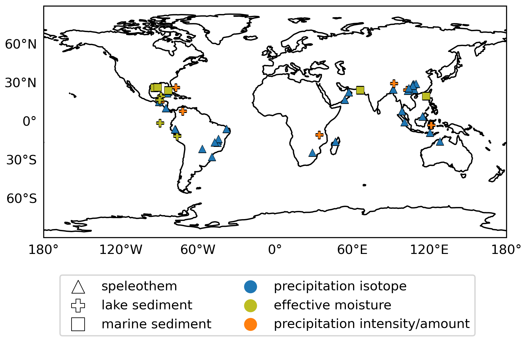 The compilation was organized into three categories based on the climate interpretation of the various proxy records (Fig. 1): proxies which reflect the isotopic composition of precipitation (Piso), proxies which reflect effective moisture (EM; P-E), and proxies which reflect precipitation amount and/or intensity (Pamt). This categorization scheme enables more robust interpretations of the proxy records and facilitates data-model comparison as our understanding of water isotopes and their manifestations in paleoclimate archives continues to advance (Konecky et al., 2020).