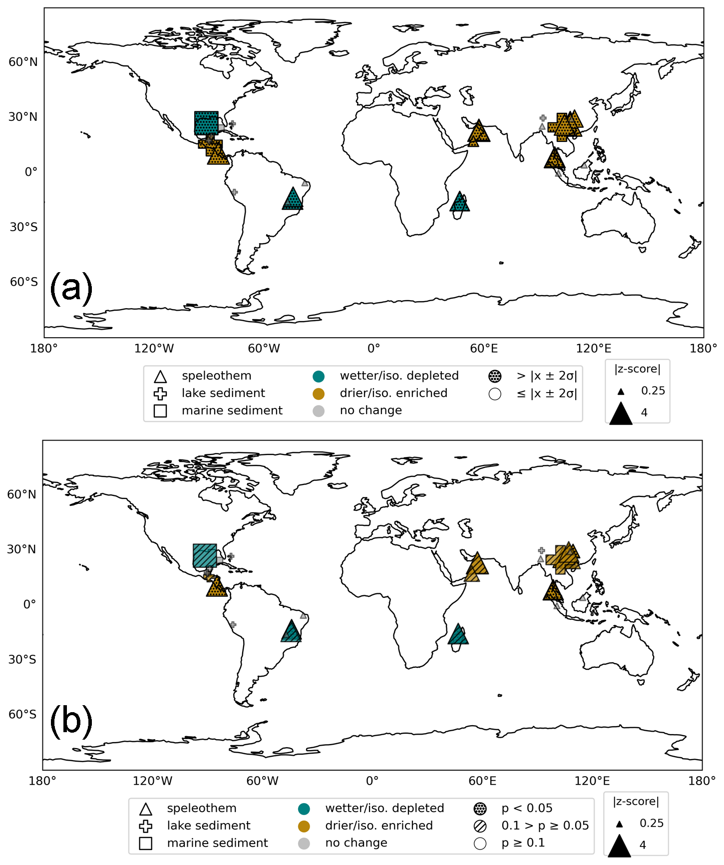 In several regions (including East Asia, Fig. 5; and northeastern South America, Fig. 6), records with no detected change are located near records with clear event signals. These regional differences could arise from several factors, including localized hydroclimate responses to the event, age uncertainty, and proxy interpretation uncertainties. For example, speleothem δ18O records have been interpreted as representing a range of different climate processes, often within the same region, including changes in regional precipitation amount, monsoon strength, moisture source location, upstream rainout, seasonal frontal shifts, and temperature (e.g. Hu et al., 2019), reflecting the complexity of processes that impact δ18Op and speleothem δ18O. Because of the inherently regional nature of rainfall patterns and the uncertainties in the proxy records, we focus our interpretation on regional hydroclimate signals that are supported by multiple records, often across different aspects of hydroclimate. In this way, we focus on the most robust aspects of the tropical hydroclimate response to the 8.2 ka Event.