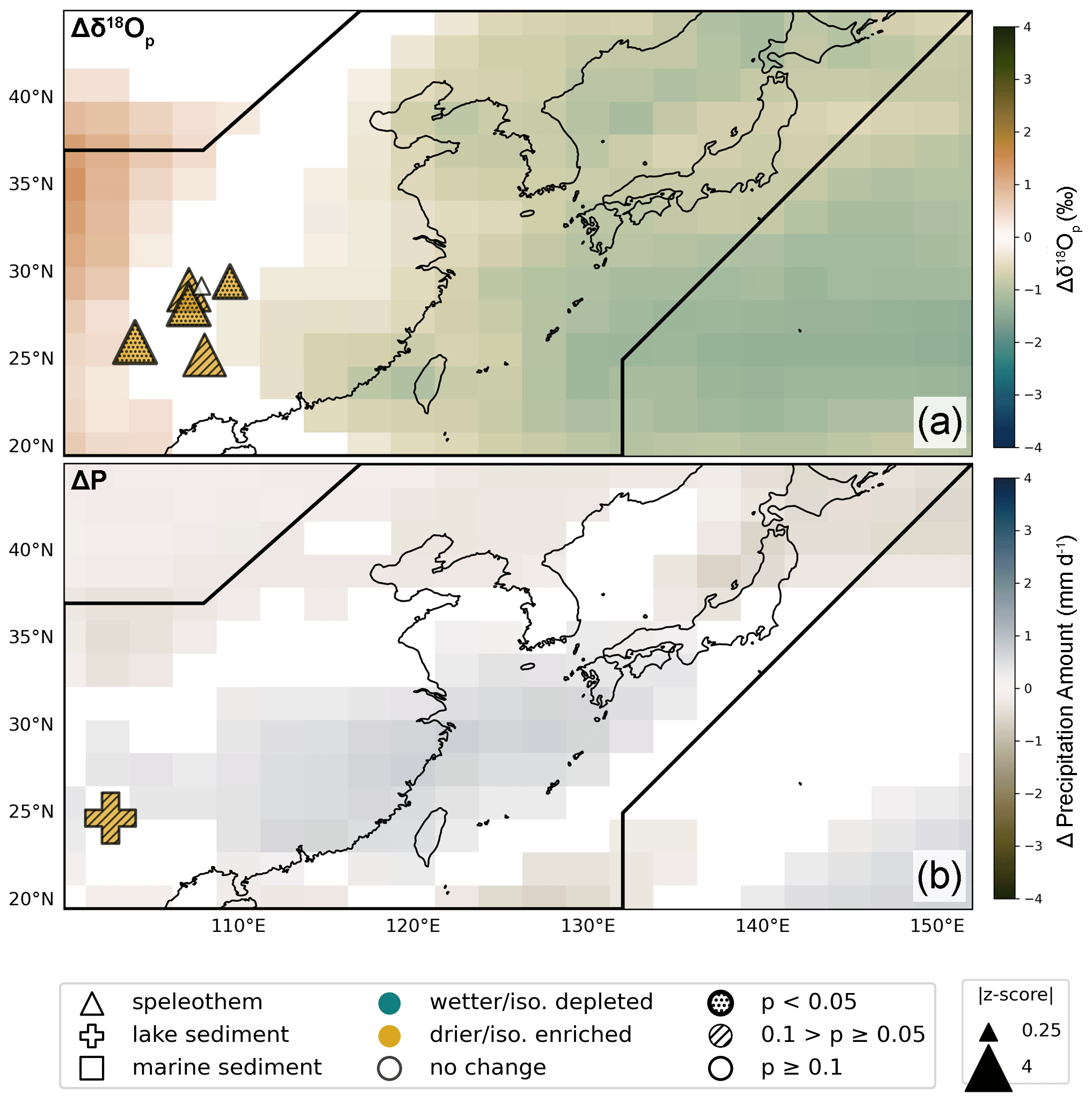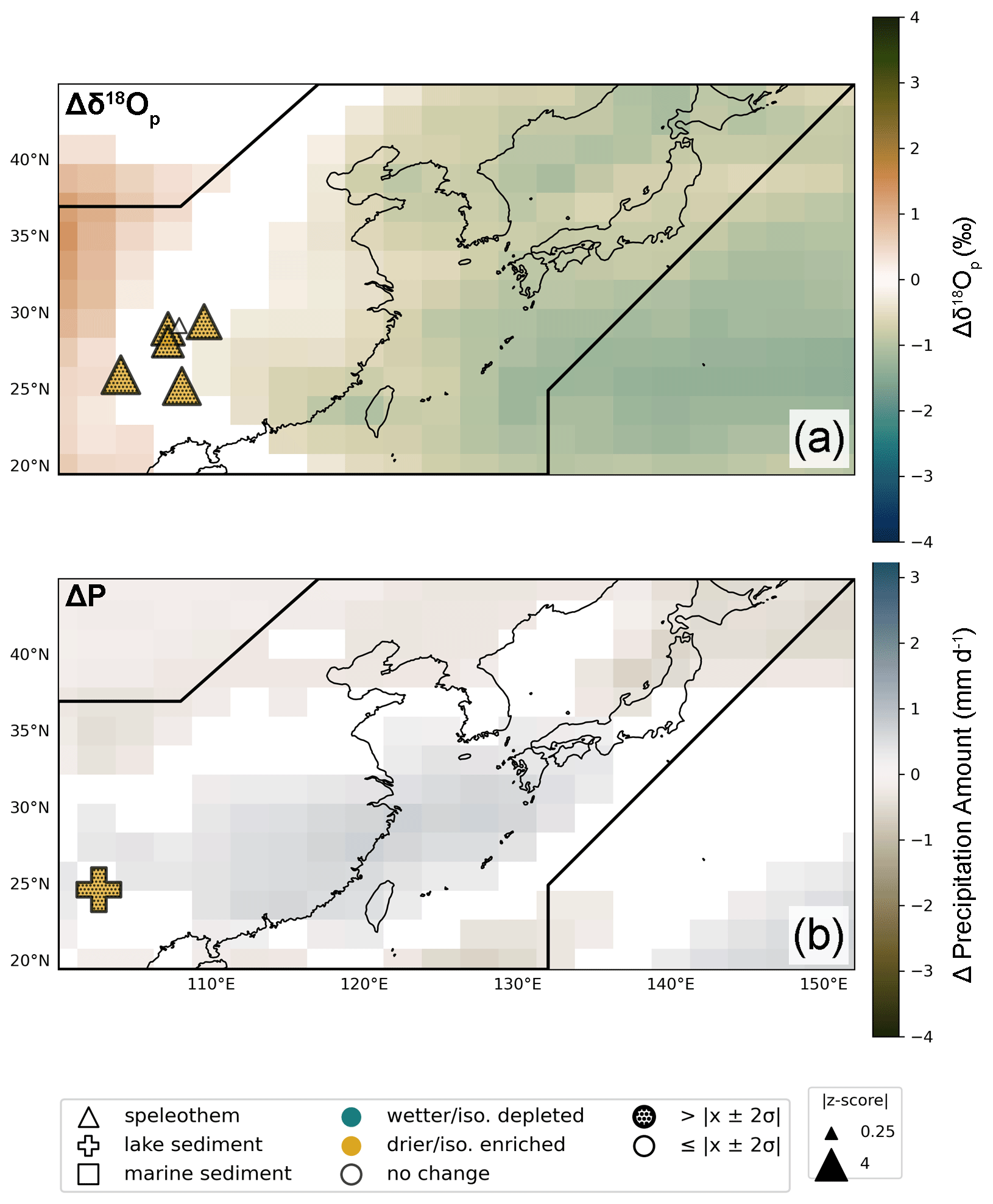 Figure 5Data-model comparison of IPCC region 35: East Asia (box). Model shading represents (a) the amount-weighted δ18Op anomaly, and (b) the precipitation amount anomaly between the last 50 years of the “hose” and “ctrl” simulations that exceed the 95 % confidence level (p<0.05) using an unpaired two sample Student's t-test. Symbols represent paleoclimate proxy archives within the region corresponding to each respective climate variable, where the brown shaded triangles indicate speleothem records with recorded dry hydroclimate/enriched isotopic anomalies during the 8.2 ka Event and grey symbols indicate records with no hydroclimate anomalies (“no change”) over the 7.9–8.3 ka interval. For symbols showing an anomaly associated with the 8.2 ka Event, size is scaled by relative to each record's mean and standard deviation.