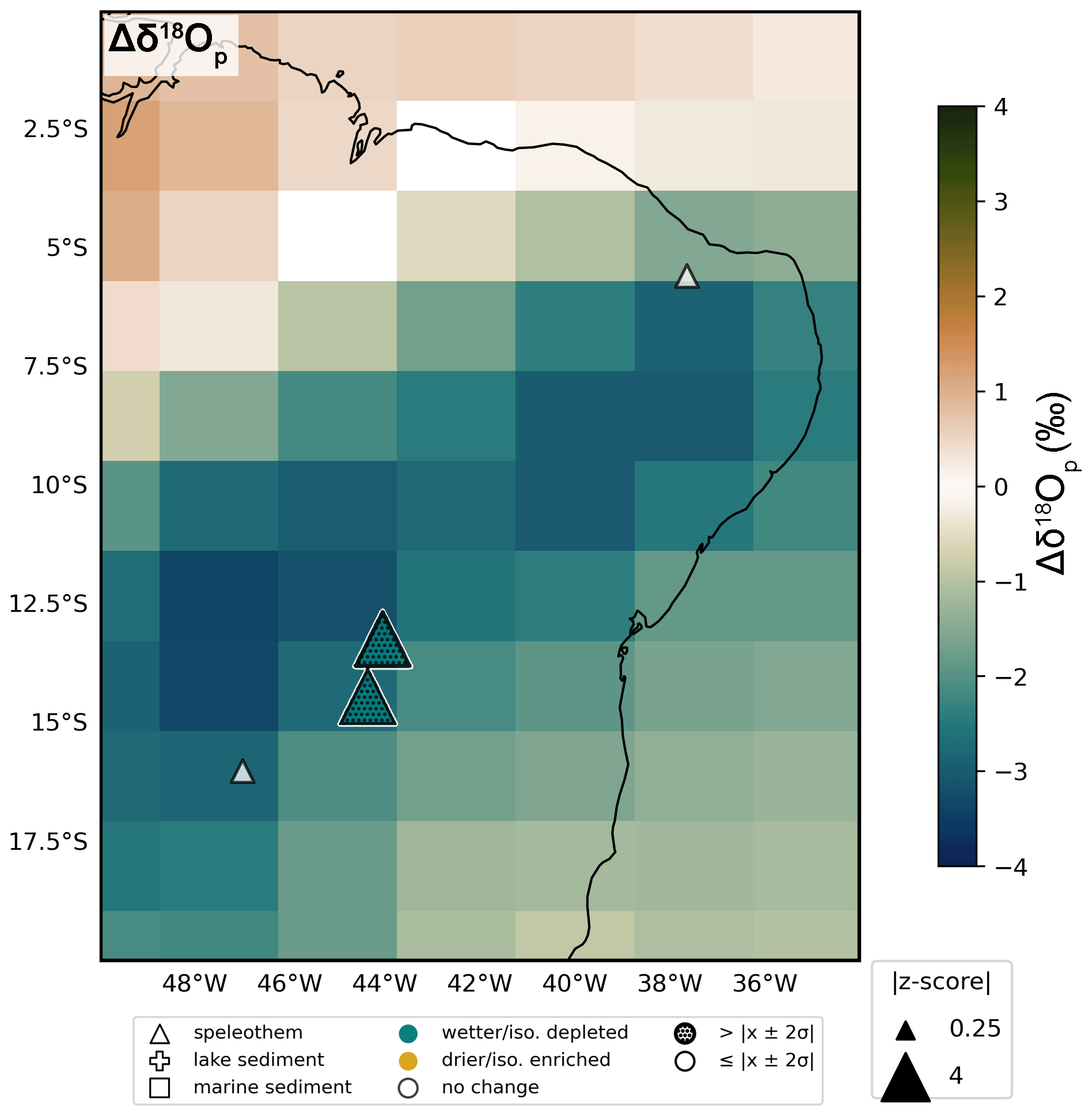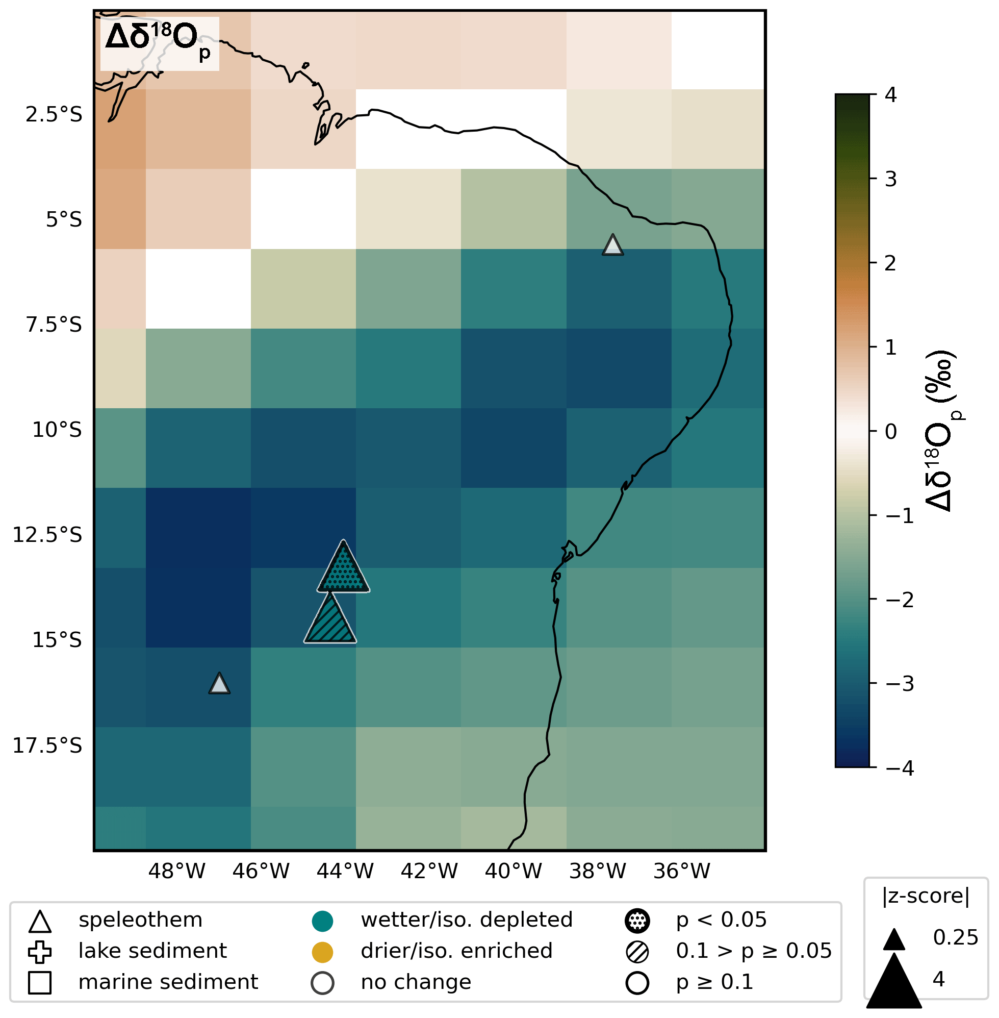 Northeastern South America displays only moderate proxy-model agreement (Fig. 6). Two of the four speleothem records there contain large δ18O depletion events, corresponding with the large-scale isotopic depletion signal in δ18Op in iCESM across northeastern South America. However, two other speleothem records in the region – one in the Nordeste region of Brazil and one in central Brazil – show no significant hydroclimate anomalies during the 8.2 ka Event, in contrast with the results from iCESM.