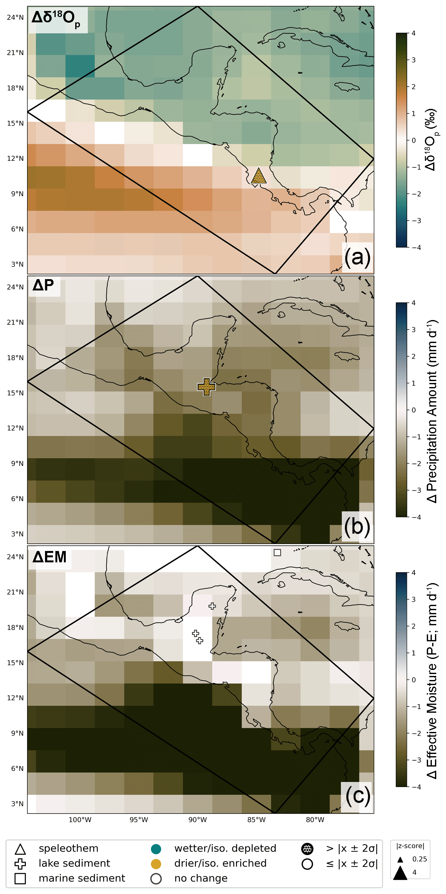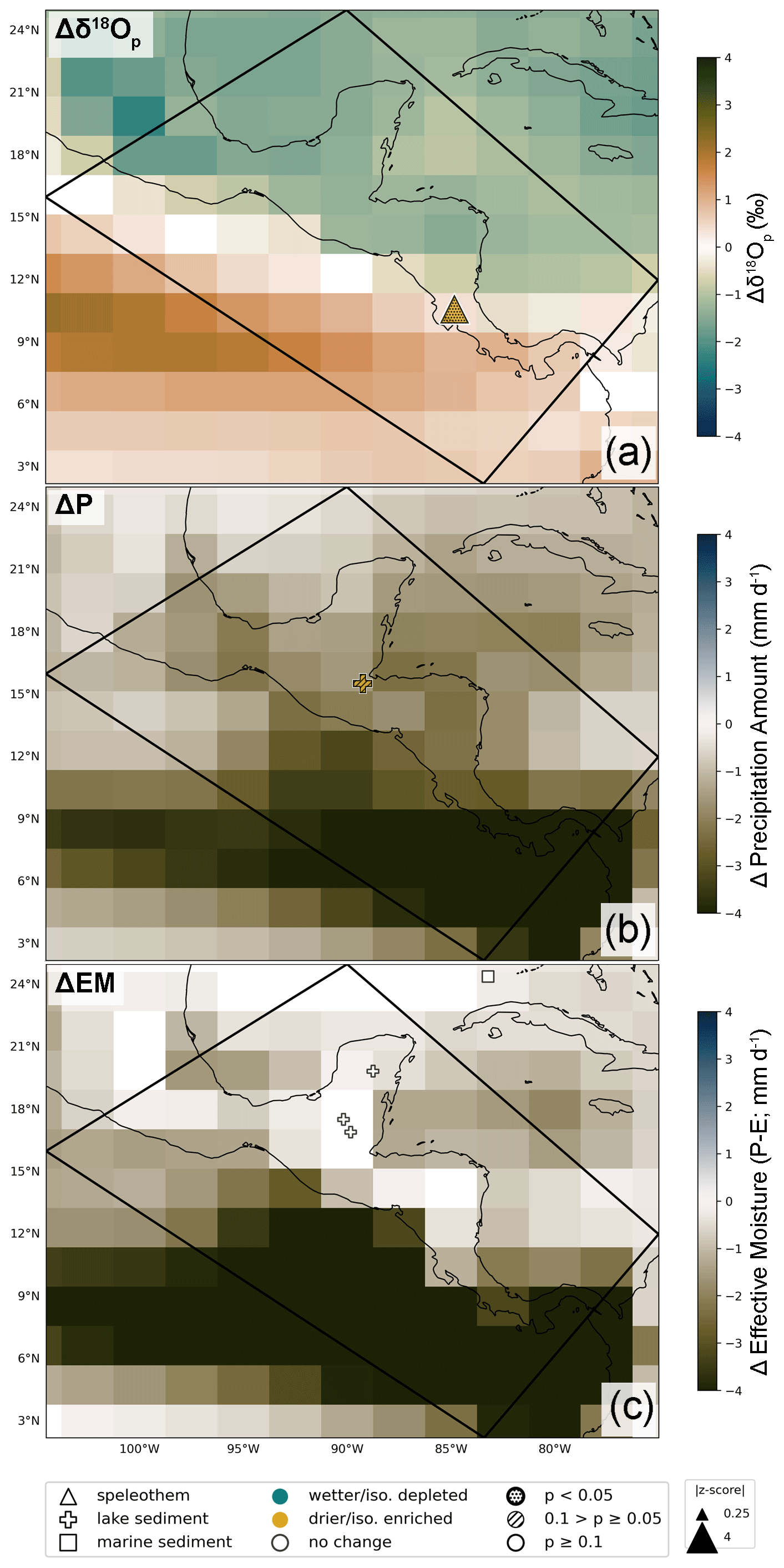 Figure 4Proxy symbols from Fig. 3b overlaid on contour maps of the simulated anomalous (a) amount-weighted δ18Op, (b) precipitation amount, and (c) effective moisture (P-E), calculated from the difference between the last 50 years of the iCESM “hose” and “ctrl” experiments, where only anomalies that exceed the 95 % confidence level (p<0.05) are plotted.