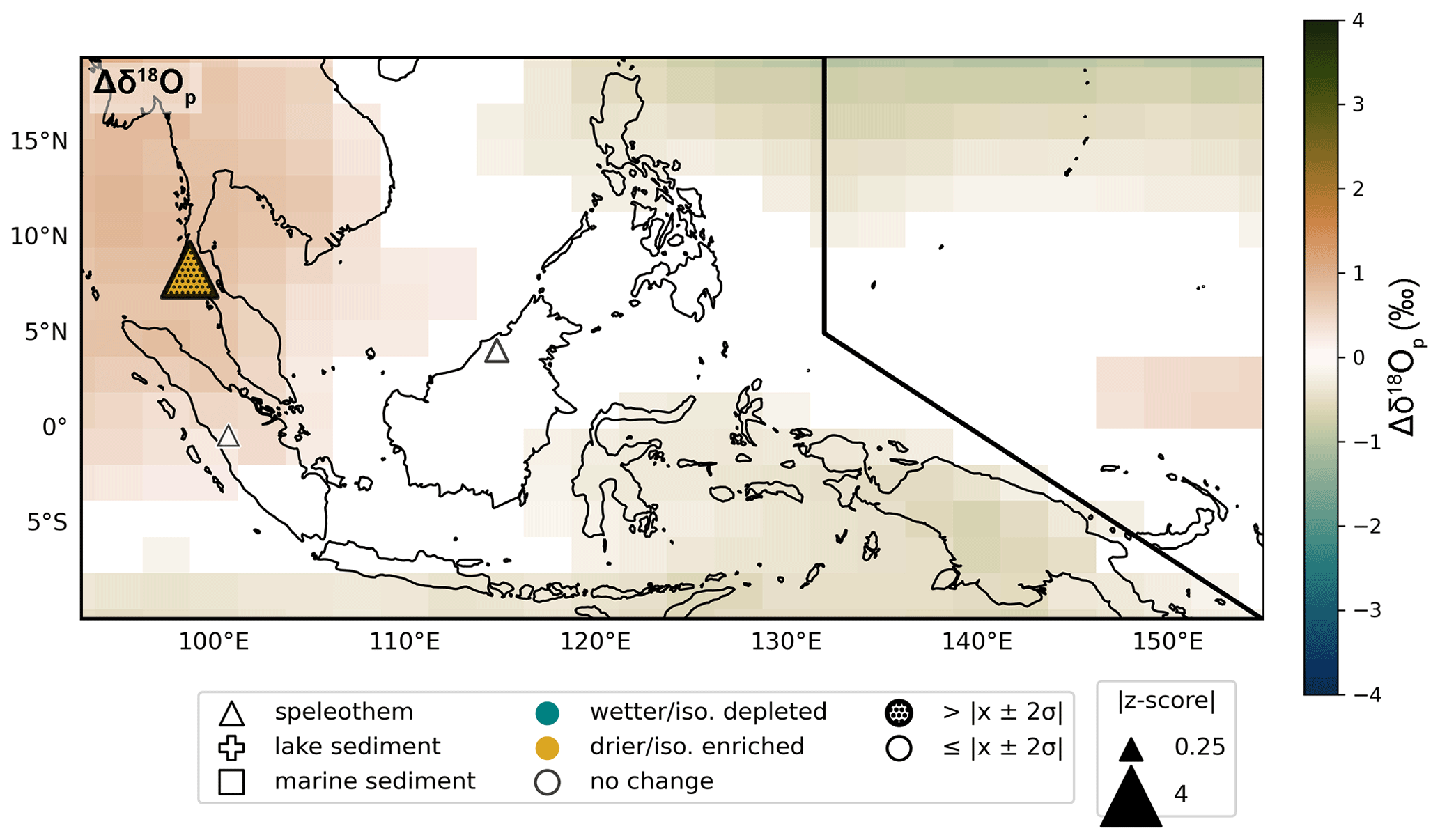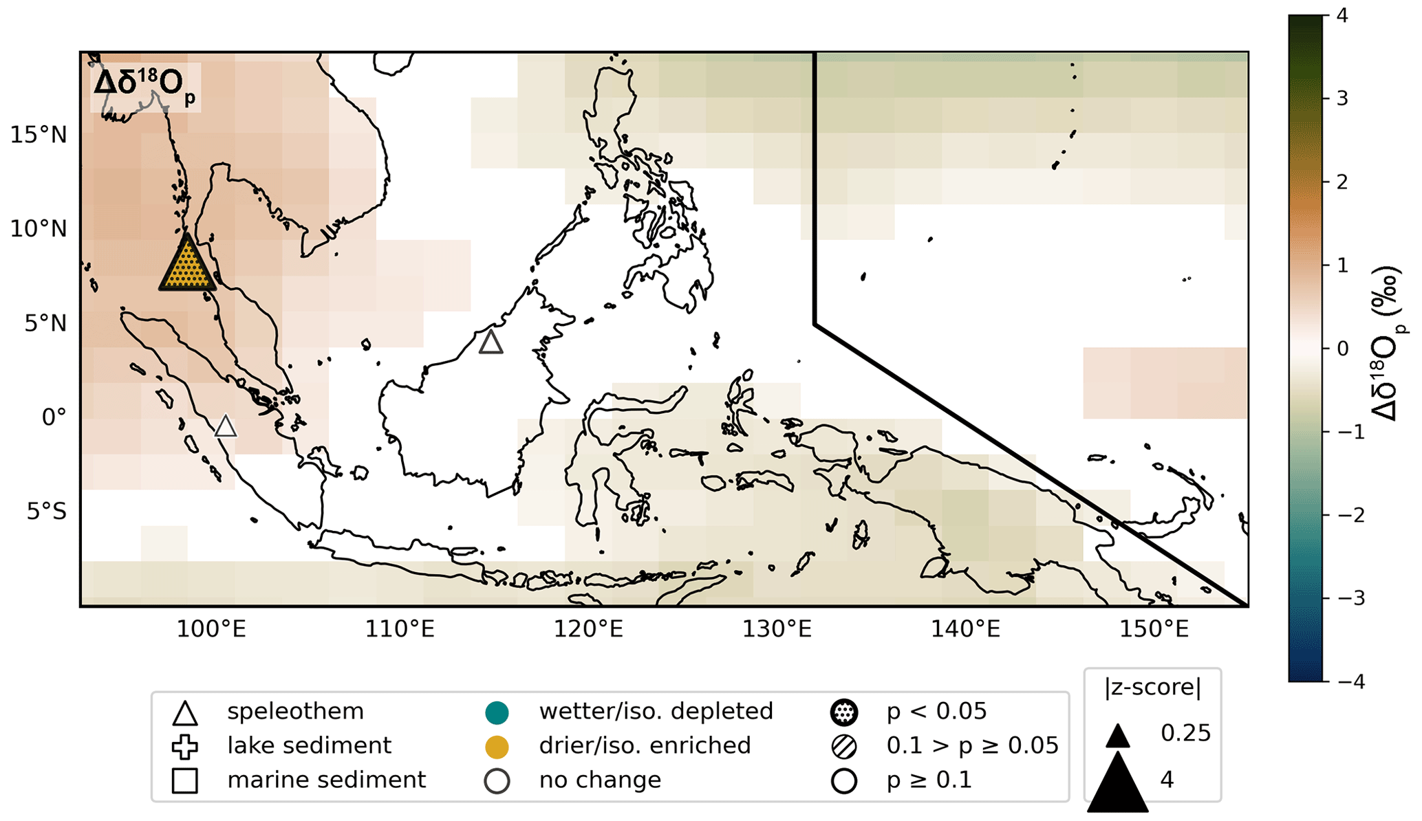 Broad data-model agreement is also found in Southeast Asia and the Maritime Continent (Fig. 8), where one speleothem record in the Thailand peninsula contains a notable isotopic enrichment event, in agreement with the simulated large scale enrichment signal in δ18Op in South Asia (Figs. 8 and B8). Two other speleothem records in Sumatra and Borneo show no significant hydroclimate anomalies, in general agreement with the weak simulated δ18Op anomalies in iCESM in this region, which reflect the weak response in δ18Op throughout the western Pacific and Maritime Continent (Fig. 4a).