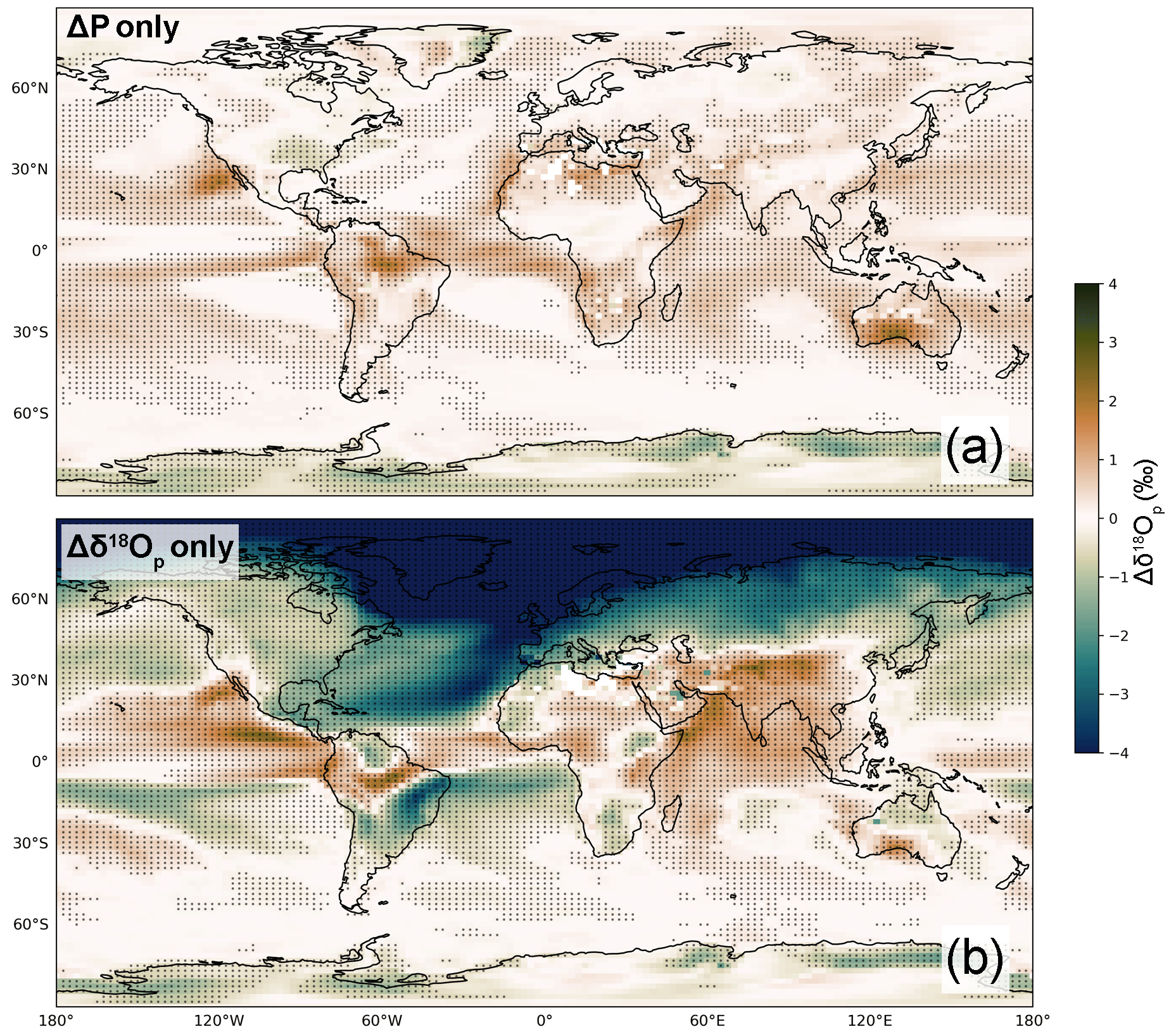 These temperature and precipitation anomalies project strongly onto the amount-weighted δ18Op values (Fig. 4a). The greatest δ18Op anomalies occur in the northern reaches of the North Atlantic Ocean, reaching up to −8 ‰ in association with the strong regional cooling of the North Atlantic, as well as the addition of highly depleted (−30 ‰) meltwater to the surface ocean of the “hosing” site, and subsequent evaporation and rainout. In the tropics, δ18Op anomalies closely follow the changes in precipitation amount over the equatorial Atlantic and central/eastern Pacific Oceans, with negative δ18Op anomalies south of the equator and positive δ18Op anomalies north of the equator. A pronounced dipole pattern is also evident over northern South America, where increased (decreased) rainfall corresponds to negative (positive) δ18Op anomalies in the southeastern (northwestern) region of South America. In the tropical Atlantic and Central America, a second dipole in δ18Op occurs ∼ 12° N, with isotopic enrichment south of this latitude, extending over Panama and Costa Rica, following the largescale drying pattern, but isotopic depletion north of this latitude, including over the remainder of Central America, associated with the upwind cooling of SSTs and the addition of isotopically depleted meltwater to the North Atlantic. In the Middle East, India, Tibetan Plateau, and parts of Southeast Asia, modest drying is accompanied by pronounced positive δ18Op anomalies. There appears to be no clear relationship between precipitation amount and δ18Op anomalies over Africa, East Asia, the Western Pacific, and Maritime Continent.