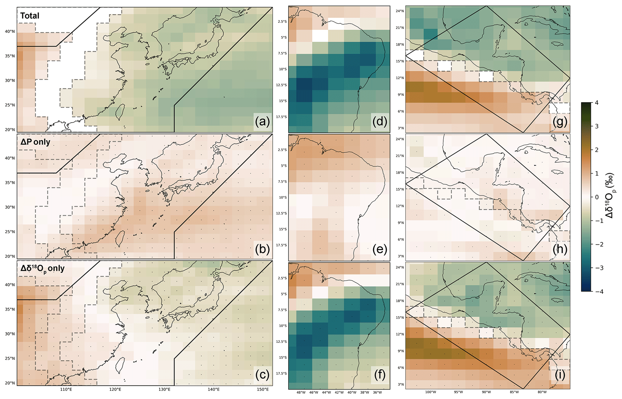 Figure 10As in Fig. 9, but for East Asia (left column; a, b, c), northeast South America (middle column; d, e, f), and southern Central America (right column; g, h, i). The panels in the upper row show the annual amount-weighted δ18Op anomaly in each region. The middle panels depict the contribution of the changes in the amount of monthly precipitation to the total change in amount-weighted δ18Op, while the bottom panels depict the contribution of the monthly changes in δ18Op. The unfilled black polygons represent the boundaries of each IPCC region. The grey dotted lines subdivide East Asia and southern Central America into E–W and N–S subregions defined by distinct ±Δδ18Op dipoles shown in panels (a) and (g), respectively.