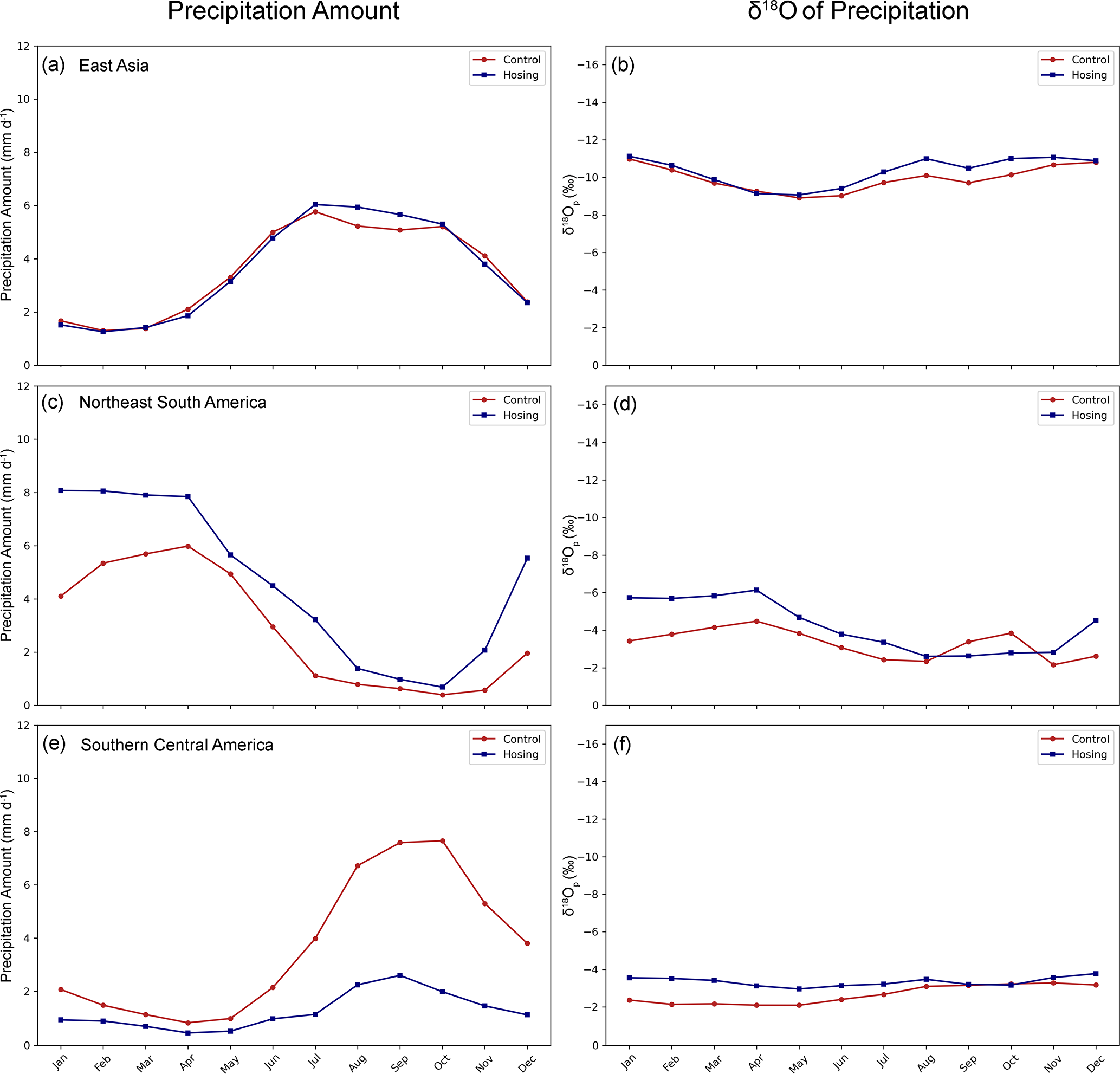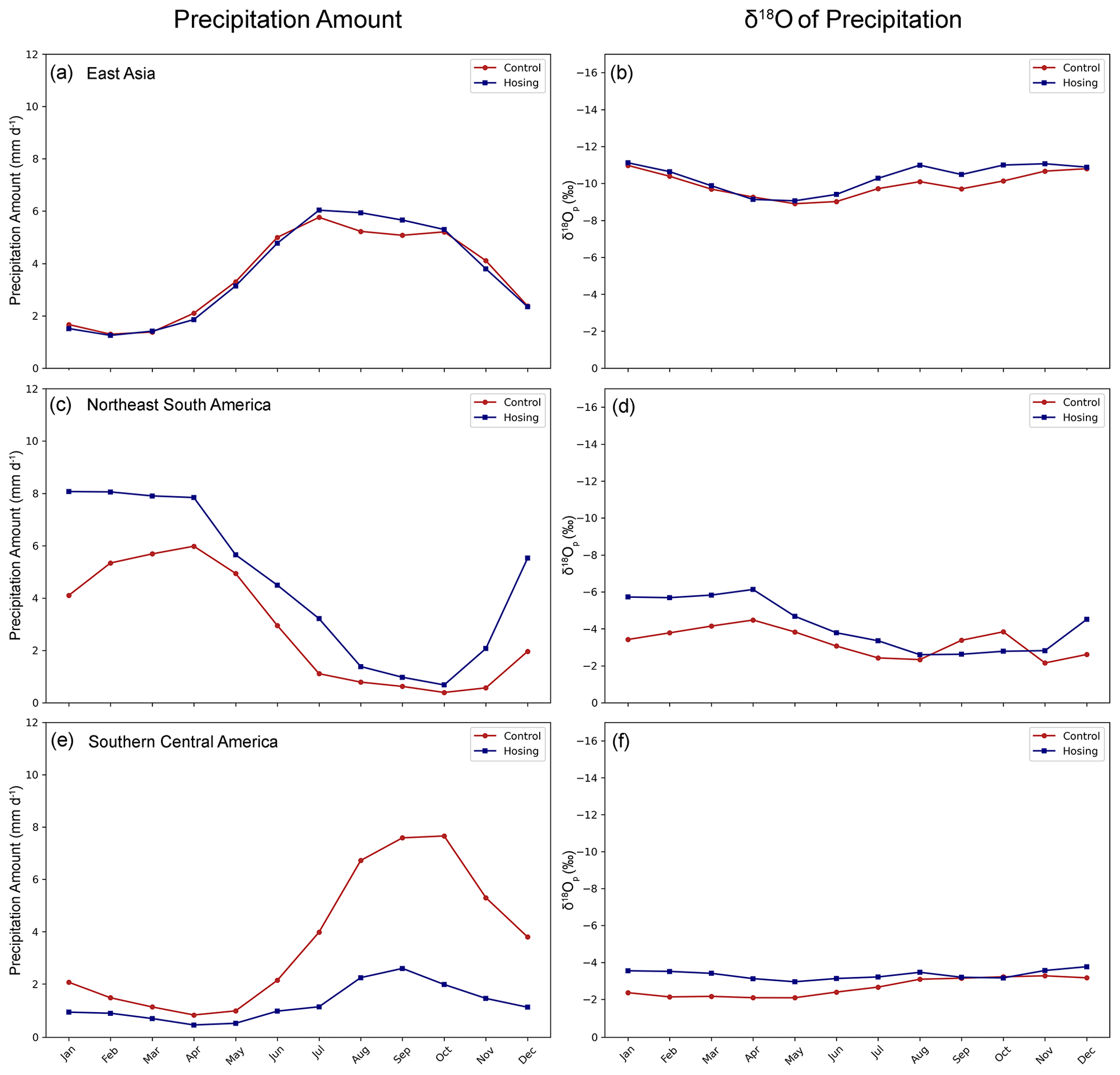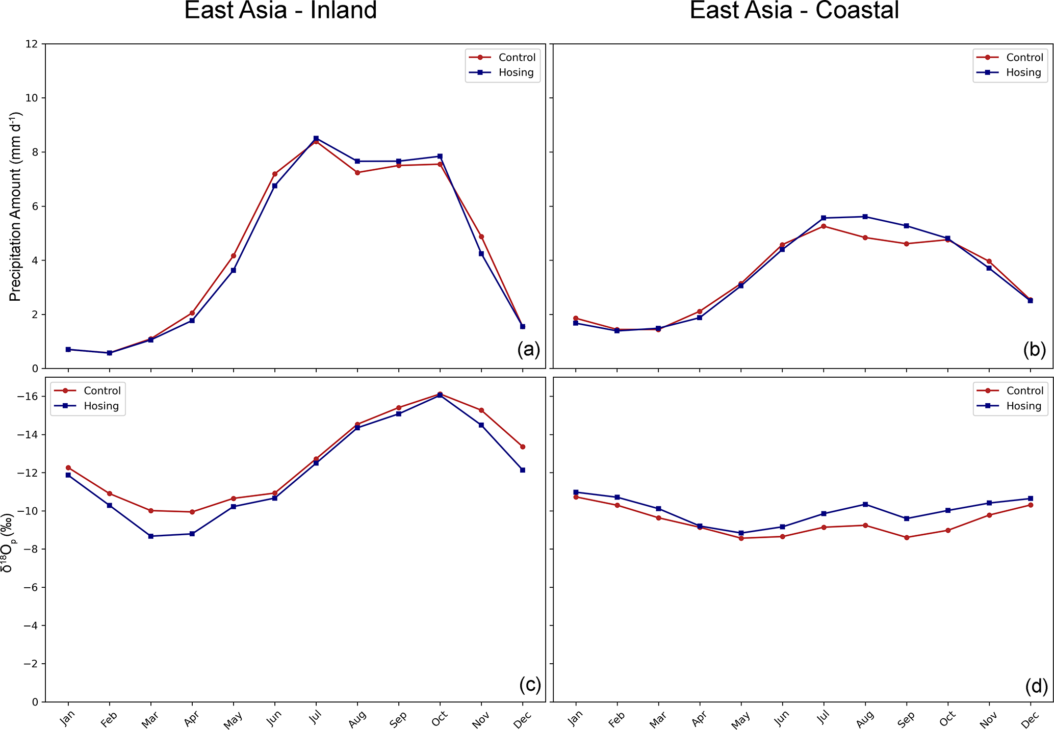 Figure 12The monthly climatology of the area-weighted precipitation amount (a, b) and δ18Op (c, d) in East Asia for the “ctrl” (red) and “hose” (blue) simulations. Data from the western (inland) subregion defined by the positive Δδ18Op anomaly in Fig. 10a are plotted in the left column. Data from the eastern (coastal) subregion defined by the negative Δδ18Op anomaly are plotted in the right column.