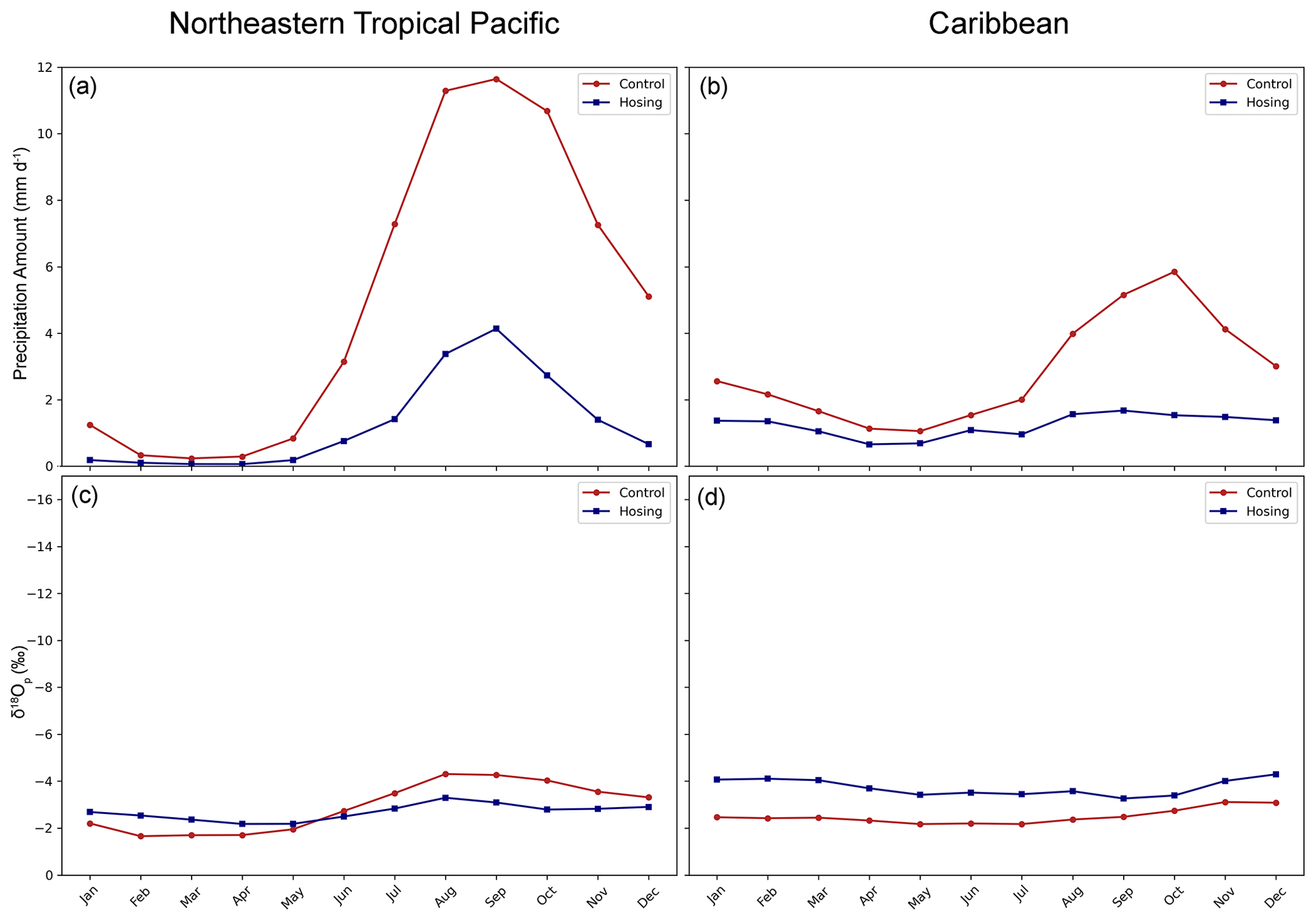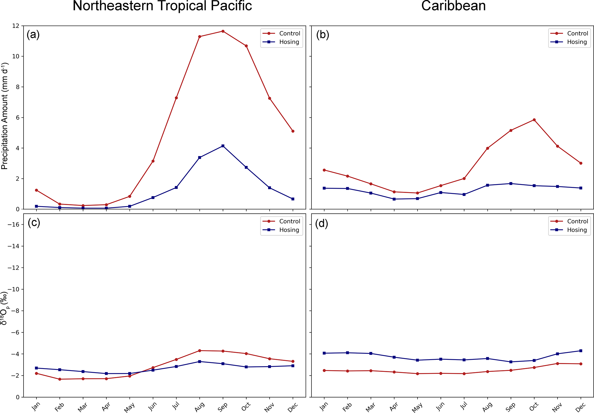In northeastern South America and Central America, the change in amount-weighted δ18Op is also dominated by changes in δ18Op and not the seasonality of precipitation (Fig. 10d–f, g–i), although the mechanisms differ from those in East Asia. In northeastern Brazil, precipitation becomes more isotopically depleted as it intensifies during the wet season from December to July (Fig. 11c, d). These changes are consistent with a Type-1 control on δ18Op (Lewis et al., 2010), wherein the local amount effect dominates the δ18Op response. In Central America, the change in amount-weighted δ18Op is characterized by a distinct SW–NE dipole with isotopic enrichment in the northeastern tropical Pacific and in southernmost Central America (Panama and Costa Rica), and isotopic depletion over the Caribbean and the remainder of Central America. This pattern is also driven by the seasonal changes in δ18Op under meltwater forcing (Fig. 10h, i). In the northeastern tropical Pacific, Panama, and Costa Rica, wet season precipitation is substantially weakened and isotopically enriched (Fig. 13a, c), consistent with a Type-1 site (Lewis et al., 2010), wherein the local amount effect dominates the δ18Op response. Past studies on the hydroclimate response to Heinrich events have shown that regional precipitation changes in northeastern Brazil and the eastern Pacific are associated with a southward shift of the Atlantic and northeastern tropical Pacific ITCZs (Lewis et al., 2010; Roberts et al., 2017; Atwood et al., 2020). However, the δ18Op response over the Caribbean and the remainder of Central America is notably different. In this region, the wet season precipitation decreases under hosing, essentially eliminating the wet season, while the precipitation becomes substantially more isotopically depleted throughout the year (Fig. 13b, d), in association with the strong surface cooling and the addition of isotopically depleted meltwater to the North Atlantic. Thus, the δ18Op response in this region would be classified as Type-5 according to the categorization of Lewis et al. (2010), with the mechanisms of the δ18Op response governed by processes outside of the local or nonlocal amount effect, moisture source shifts, or seasonality of precipitation.