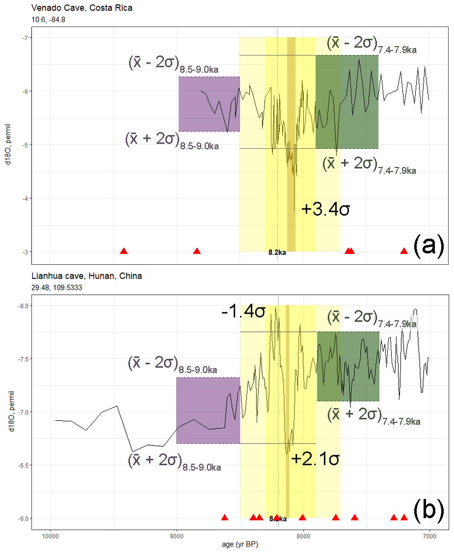Over this period, any values which exceed the upper or lower bound are marked as the 8.2 ka Event, with the timing of the event defined by the ages of the proxy values that exceed those bounds. For an excursion to be considered part of the 8.2 ka Event, the excursions must last at least 10 years. If multiple events are detected within the 7.9–8.5 ka window, they are combined into a single event if there are no more than three data points or thirty years separating the different excursions. This modification is necessary to account for the varying sampling resolutions present within and between several of the records in our compilation. If multiple events of differing signs are detected within the 8.2 ka Event window, the event with the largest z-score is chosen as the representative hydroclimate response. The magnitude of the event is defined by the largest absolute value z-score within the event detection period.