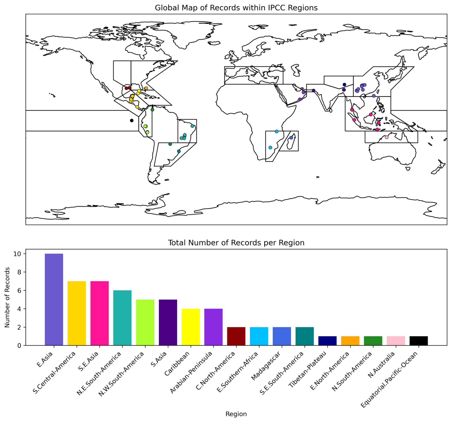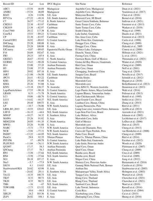 The proxy locations span 17 IPCC scientific regions (Fig. B2). The regions with densest Tier 1 proxy data coverage are southern Central America, northeastern South America, East Asia, and Southeast Asia/Maritime Continent. These four regions were therefore targeted for data-model comparisons. The proxy records within each region were compared to model-simulated anomalies in annual mean precipitation amount, amount-weighted δ18Op, and effective moisture (P-E) to investigate data-model agreement in the four target regions.
