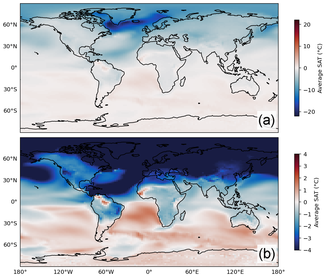 We now compare these reconstructed hydroclimate patterns to those simulated by iCESM under meltwater forcing. Within 20–30 years after the hosing is initiated, the AMOC weakens to roughly 20 % of its original strength. The surface temperature response in iCESM exhibits the characteristic “bipolar seesaw” pattern (i.e., a colder northern hemisphere and warmer southern hemisphere, most pronounced in the Atlantic Ocean), consistent with reduced northward heat transport by AMOC (Fig. B3). Anomalously cool surface temperatures, reaching as low as −20 °C where the freshwater forcing was applied, stretch across the northern North Atlantic Ocean, southward along the western coasts of Europe and North Africa, and into the tropical Atlantic via the North Atlantic Subtropical Gyre. Surface air temperatures across the Southern Hemisphere show a positive anomaly of up to 3 °C, with the largest warming occurring in the South Atlantic. Over the continents, surface air temperatures cool in all regions except localized parts of northern South America, West Africa, and the southernmost regions of South America and Australia.