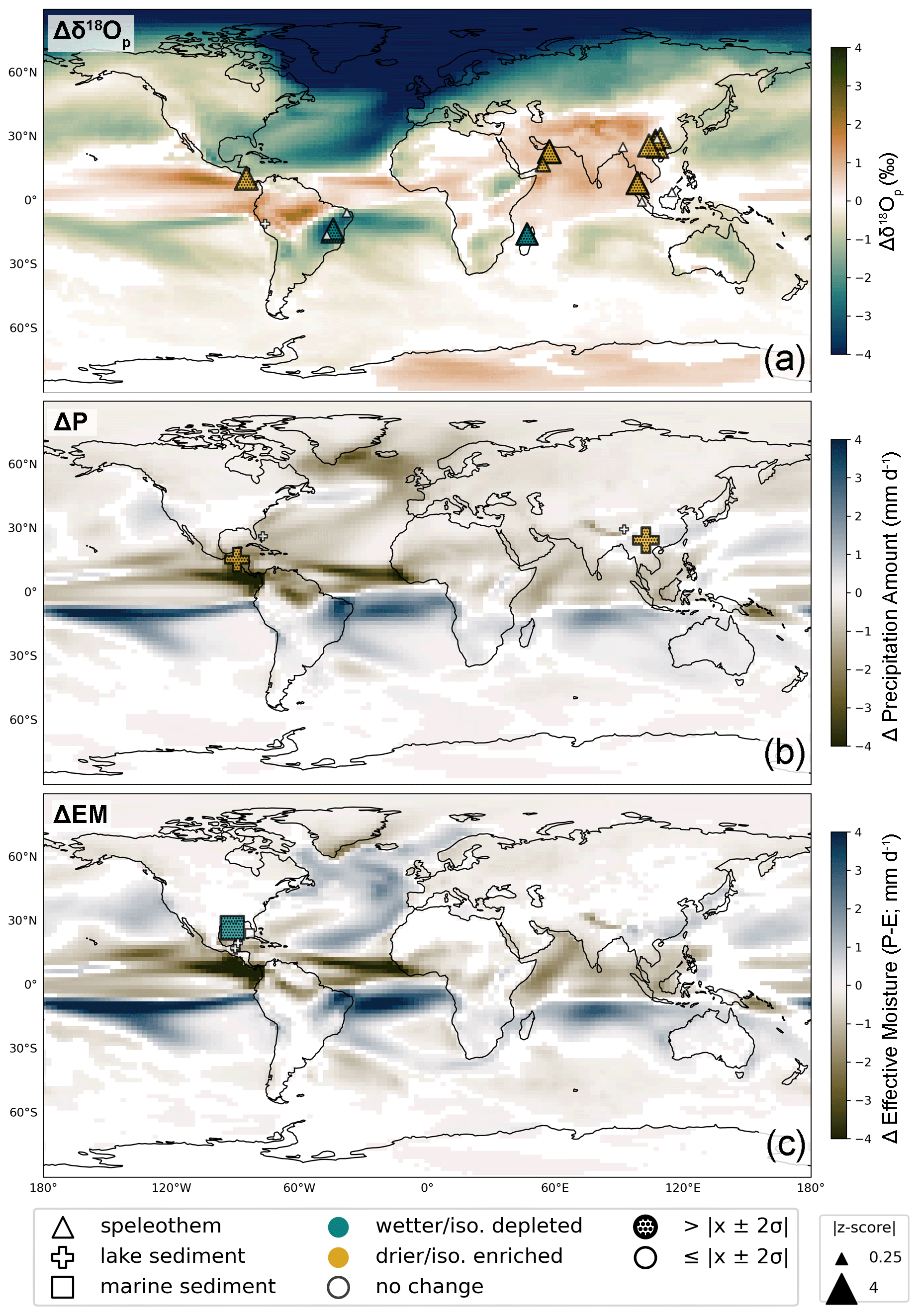 These results suggest that iCESM captures many of the regional hydroclimate responses observed in the reconstructions, including the large-scale isotopic enrichment pattern in δ18Op in South and East Asia and the Arabian Peninsula, the muted hydroclimate response in the Maritime Continent, the mixed hydroclimate patterns in Central America, and the isotopic depletion in δ18Op in parts of eastern Brazil. Similar hydroclimate features also appear in simulations of the Younger Dryas cold event from Renssen et al. (2018). While qualitative, these areas of agreement between the proxies and model demonstrate that the tropical hydroclimate response to North Atlantic meltwater forcing during the 8.2 ka Event was not a simple hemispheric dipole pattern, but is instead characterized by rich regional structure.