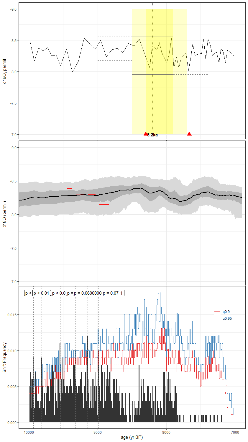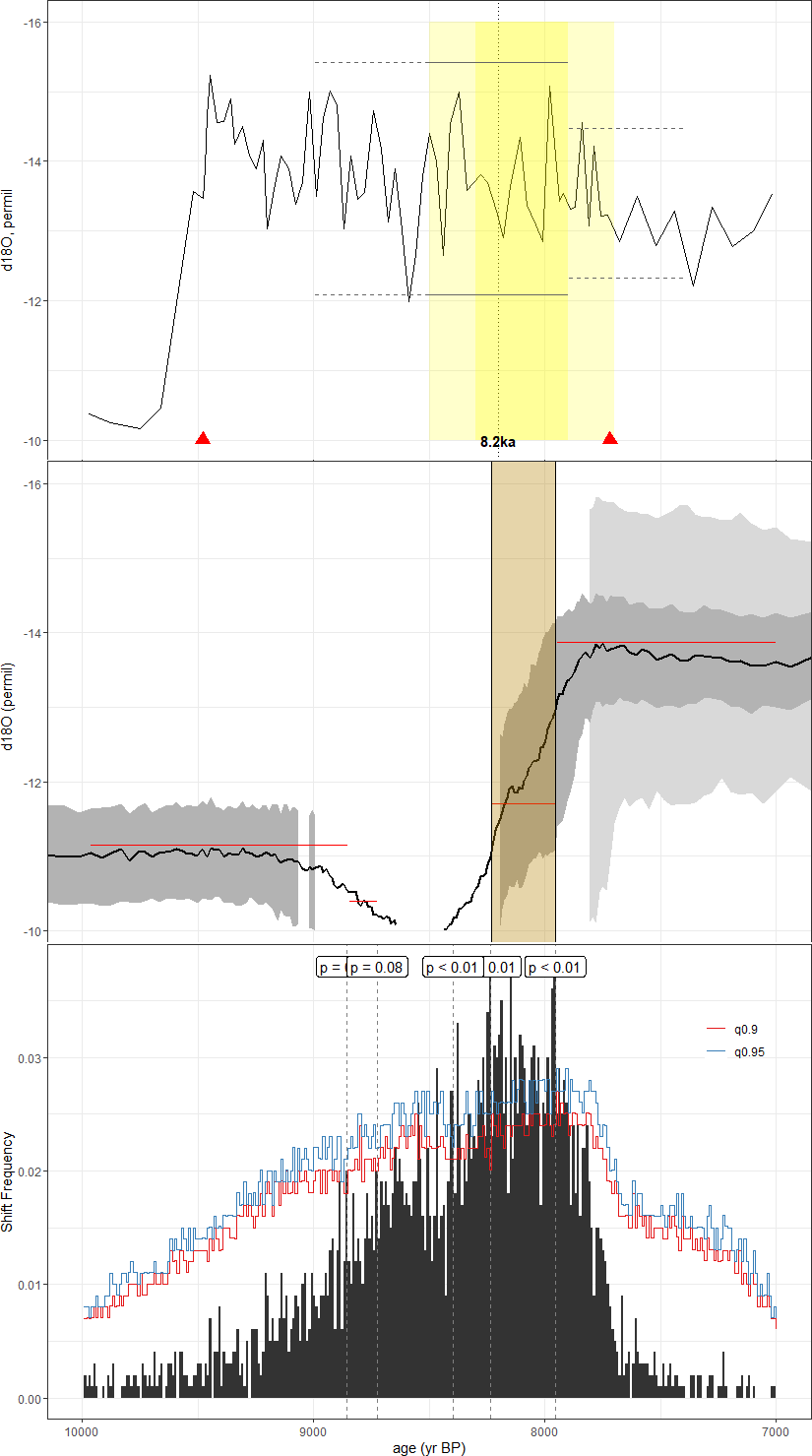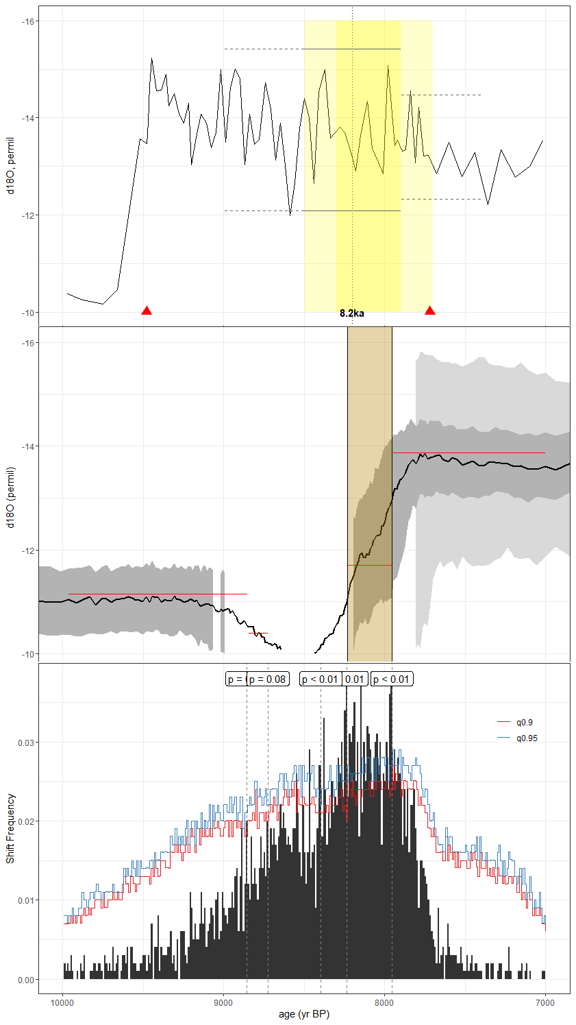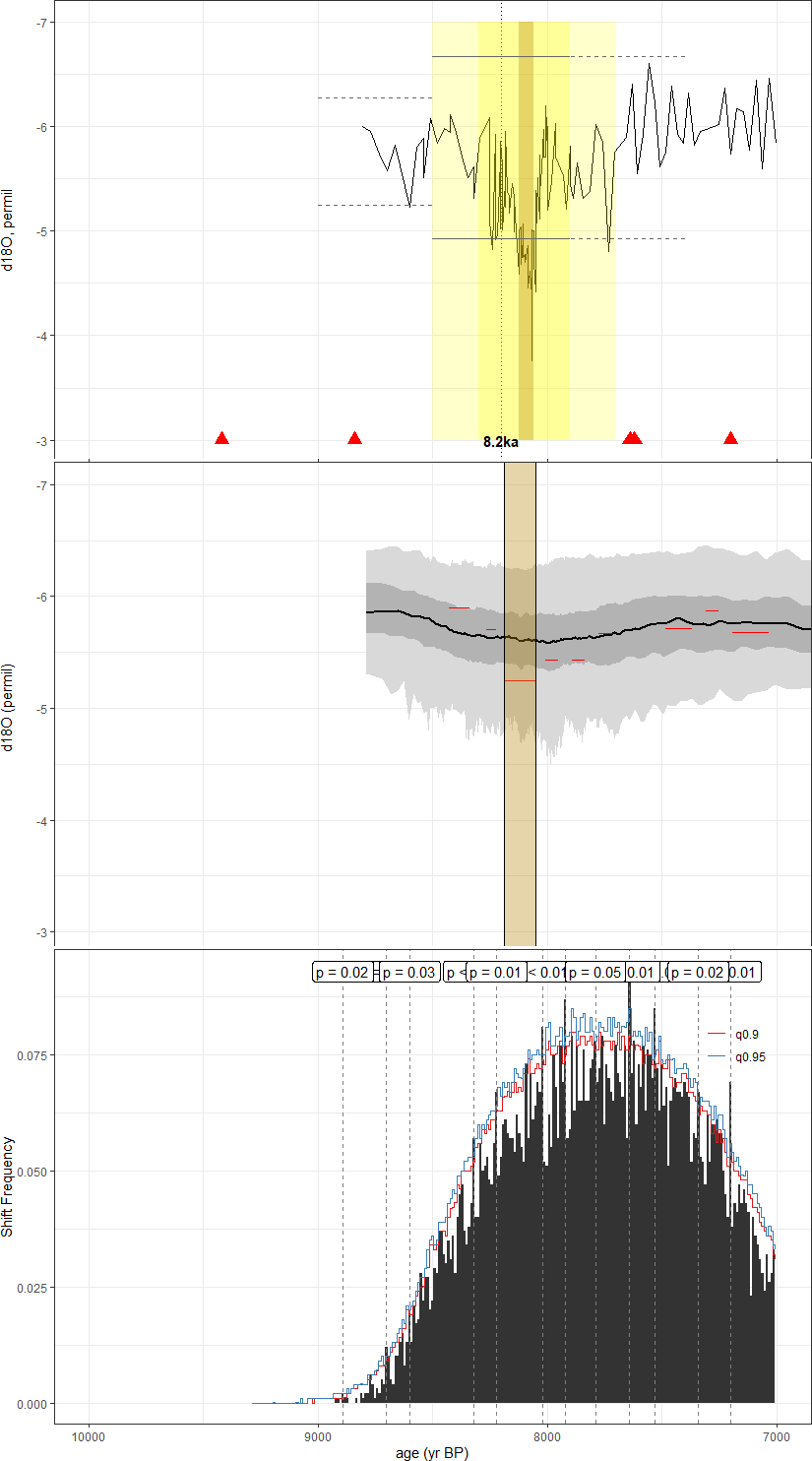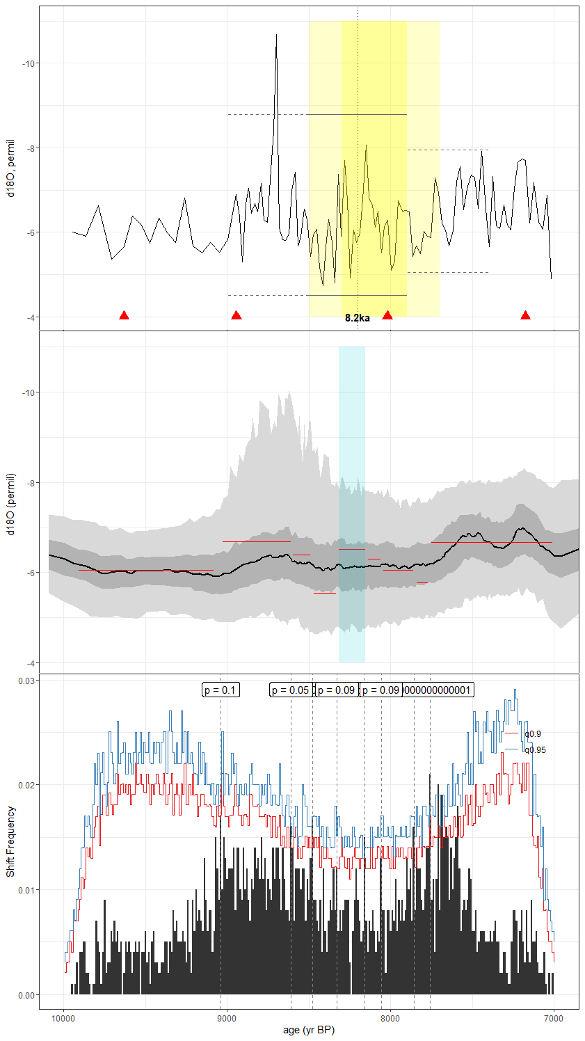 Two types of events were characterized based on the actR results. “Significant events” are defined by the presence of two consecutive changepoints with p<0.05 over the 7.9–8.3 ka window (“start” and “end”. If more than two consecutive changepoints exist over that window, the two with the lowest p-values and highest probability are used. The difference between “start” and “end” dates is used to calculate event duration, which we assume to be between a minimum of 20 and a maximum of 300 years. The magnitude of “events” is determined by the greatest absolute value z-score in each record's median age ensemble time series between the actR-derived “start” and “end” dates, with interpretation based on the sign of the z-score corresponding to the interpretation direction of the original authors. “Tentative events” are defined by the presence of two consecutive changepoints with p<0.1 over an extended 7.7–8.5 ka window. Events lasting more than 300 years are removed from consideration. If more than two events are detected within that window, the event with the start date closer to 8.2 ka is chosen as the final 8.2 ka Event.