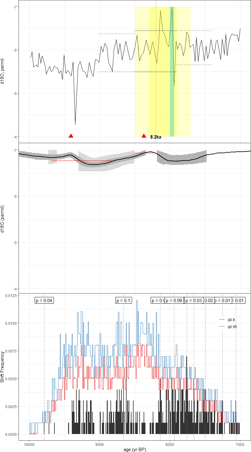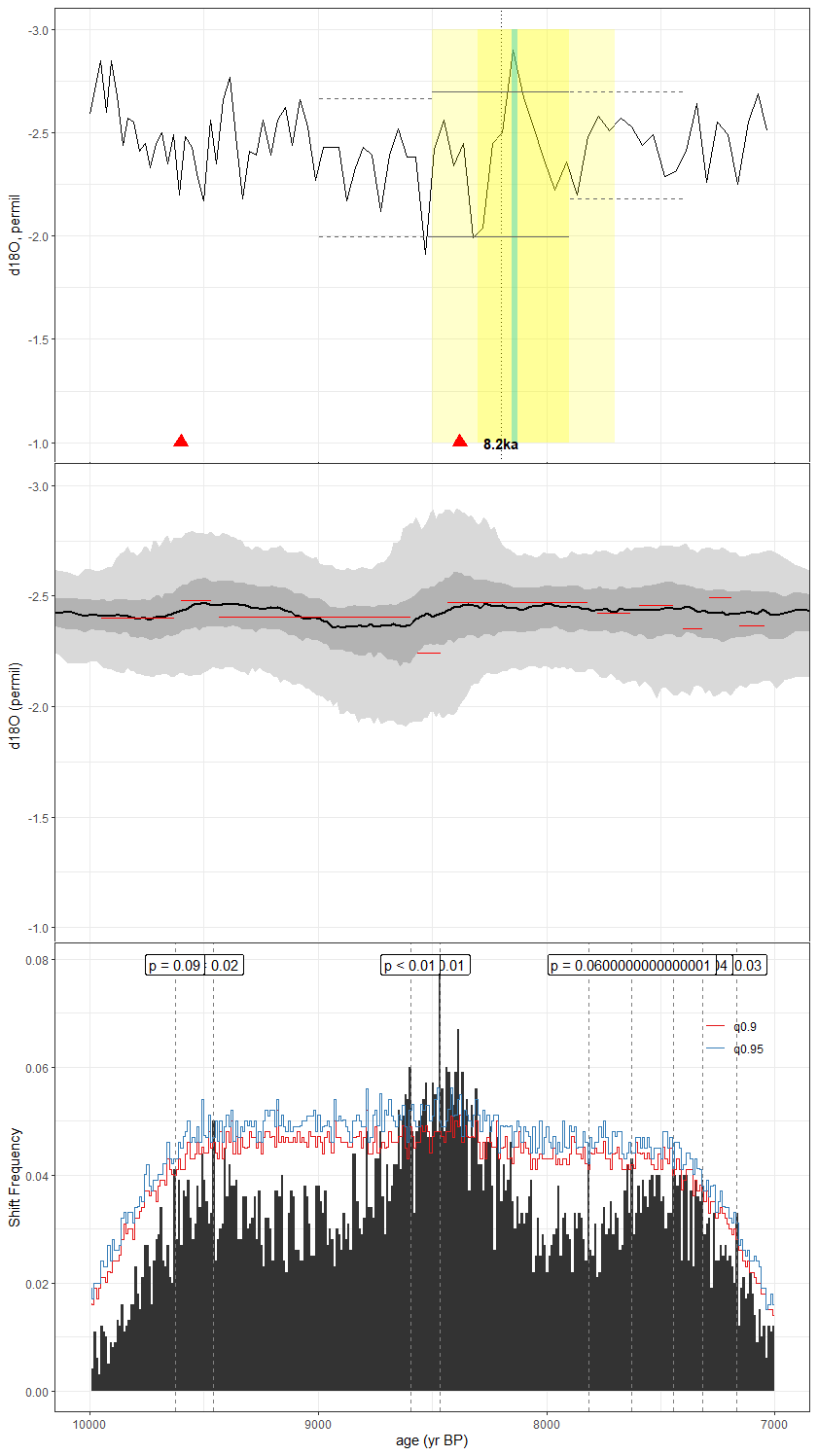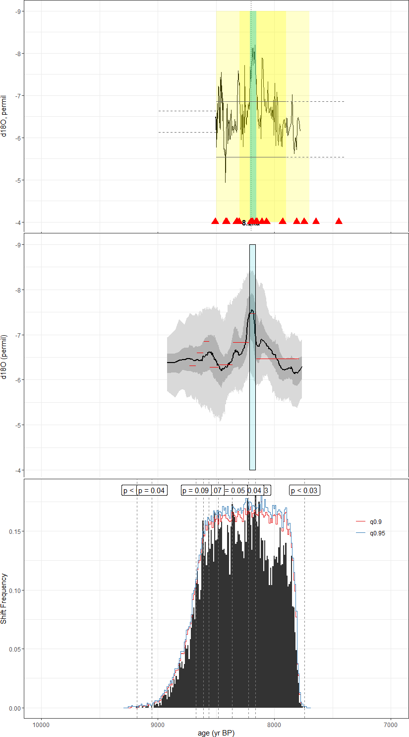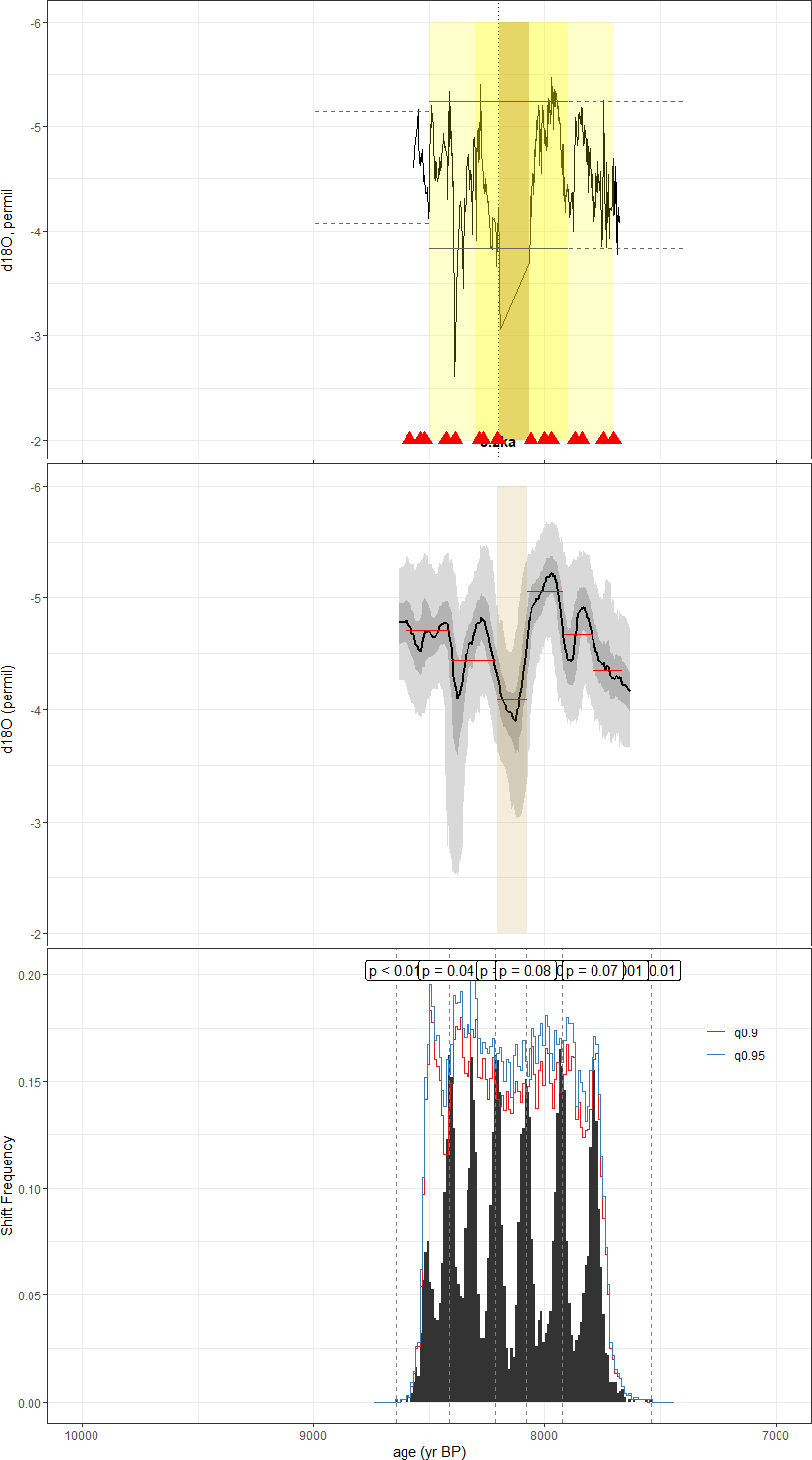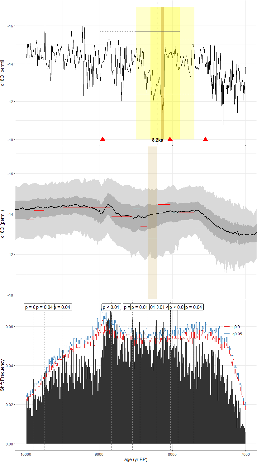 Two types of events were characterized based on the actR results. “Significant events” are defined by the presence of two consecutive changepoints with p<0.05 over the 7.9–8.3 ka window (“start” and “end”. If more than two consecutive changepoints exist over that window, the two with the lowest p-values and highest probability are used. The difference between “start” and “end” dates is used to calculate event duration, which we assume to be between a minimum of 20 and a maximum of 300 years. The magnitude of “events” is determined by the greatest absolute value z-score in each record's median age ensemble time series between the actR-derived “start” and “end” dates, with interpretation based on the sign of the z-score corresponding to the interpretation direction of the original authors. “Tentative events” are defined by the presence of two consecutive changepoints with p<0.1 over an extended 7.7–8.5 ka window. Events lasting more than 300 years are removed from consideration. If more than two events are detected within that window, the event with the start date closer to 8.2 ka is chosen as the final 8.2 ka Event.