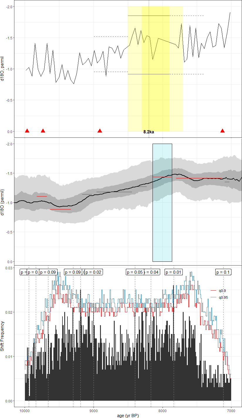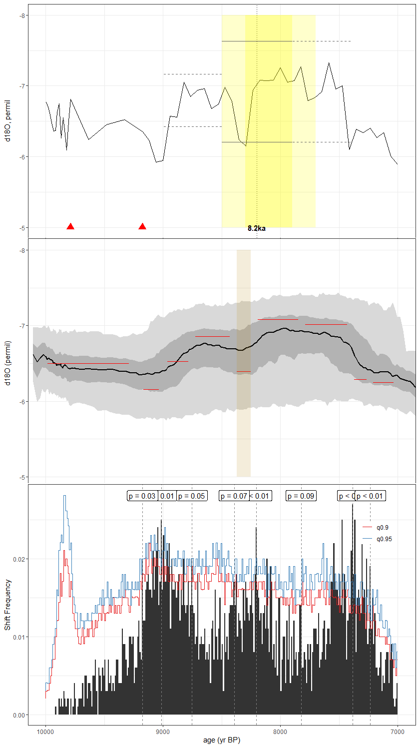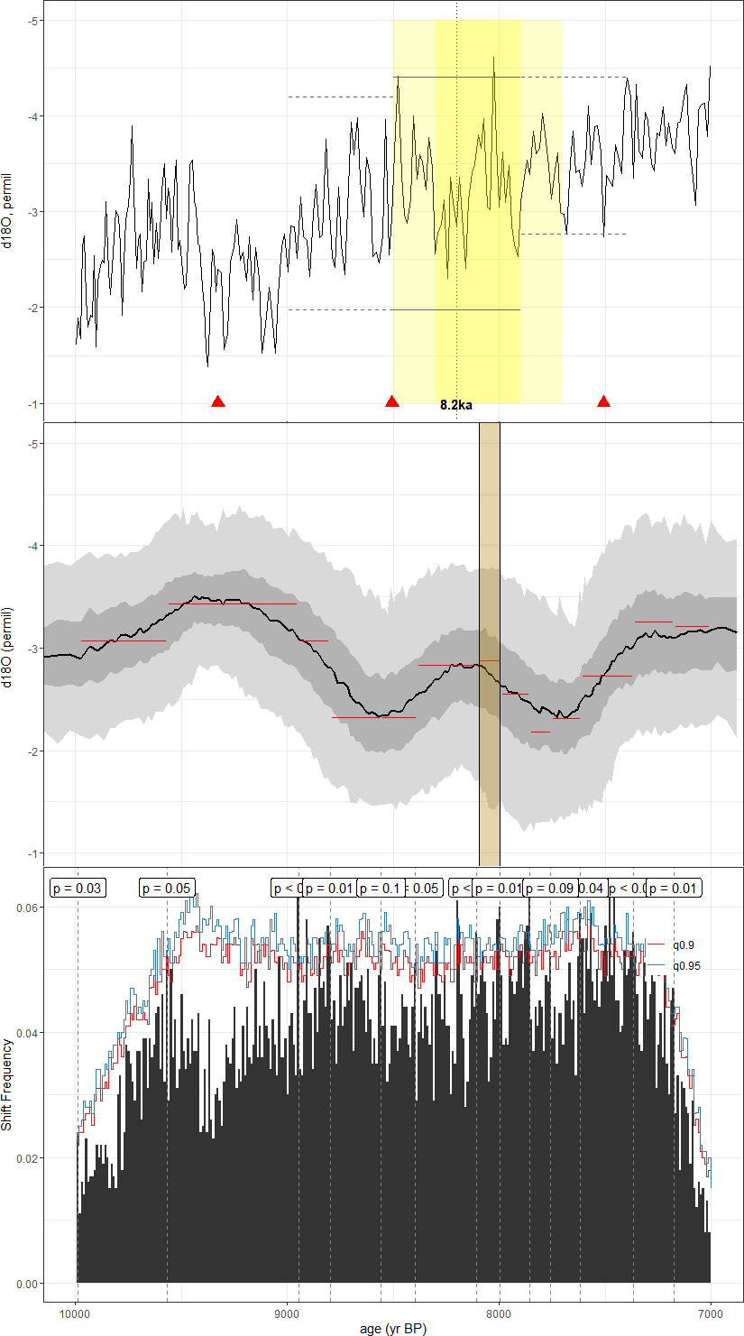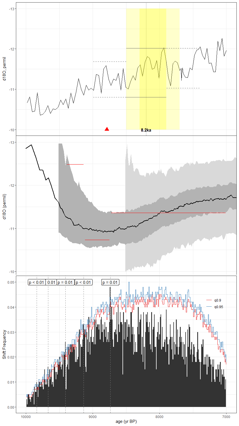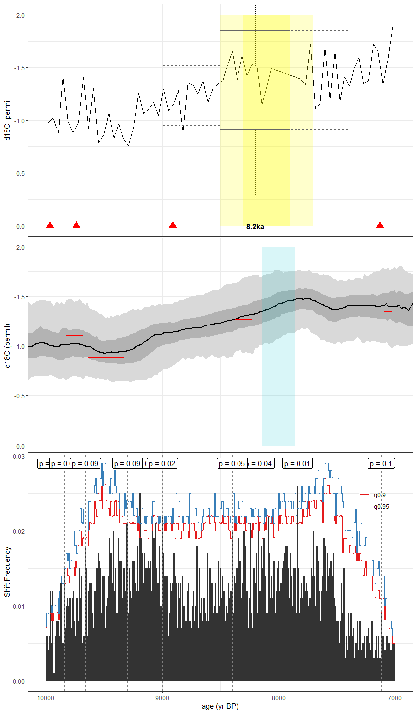 Two types of events were characterized based on the actR results. “Significant events” are defined by the presence of two consecutive changepoints with p<0.05 over the 7.9–8.3 ka window (“start” and “end”. If more than two consecutive changepoints exist over that window, the two with the lowest p-values and highest probability are used. The difference between “start” and “end” dates is used to calculate event duration, which we assume to be between a minimum of 20 and a maximum of 300 years. The magnitude of “events” is determined by the greatest absolute value z-score in each record's median age ensemble time series between the actR-derived “start” and “end” dates, with interpretation based on the sign of the z-score corresponding to the interpretation direction of the original authors. “Tentative events” are defined by the presence of two consecutive changepoints with p<0.1 over an extended 7.7–8.5 ka window. Events lasting more than 300 years are removed from consideration. If more than two events are detected within that window, the event with the start date closer to 8.2 ka is chosen as the final 8.2 ka Event.