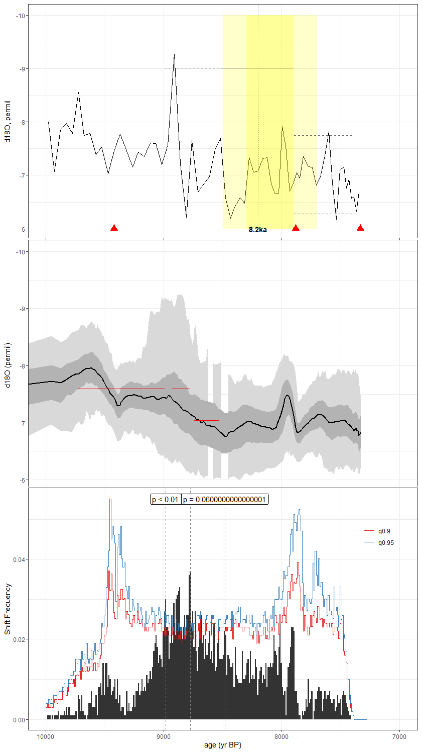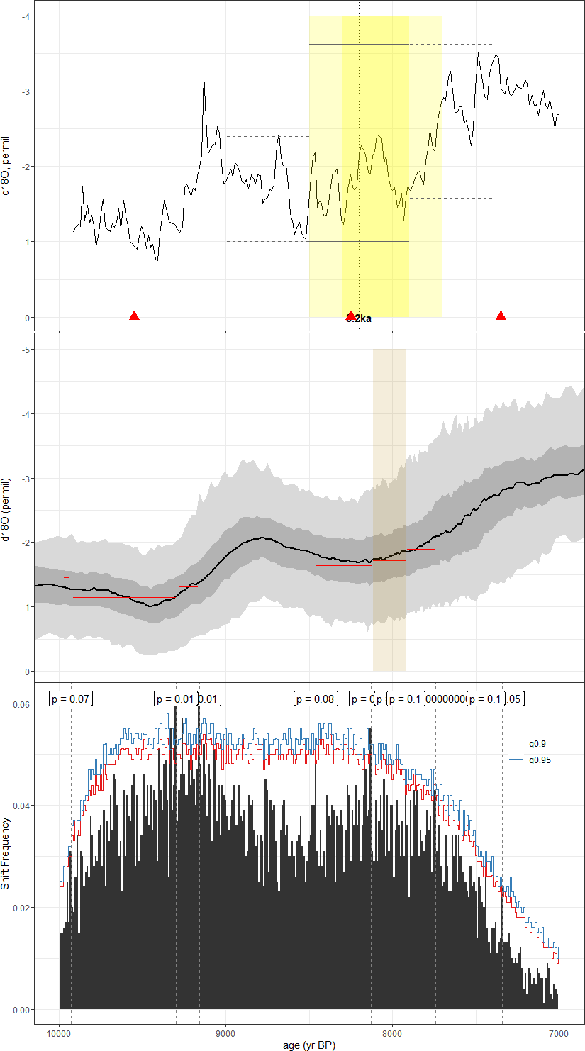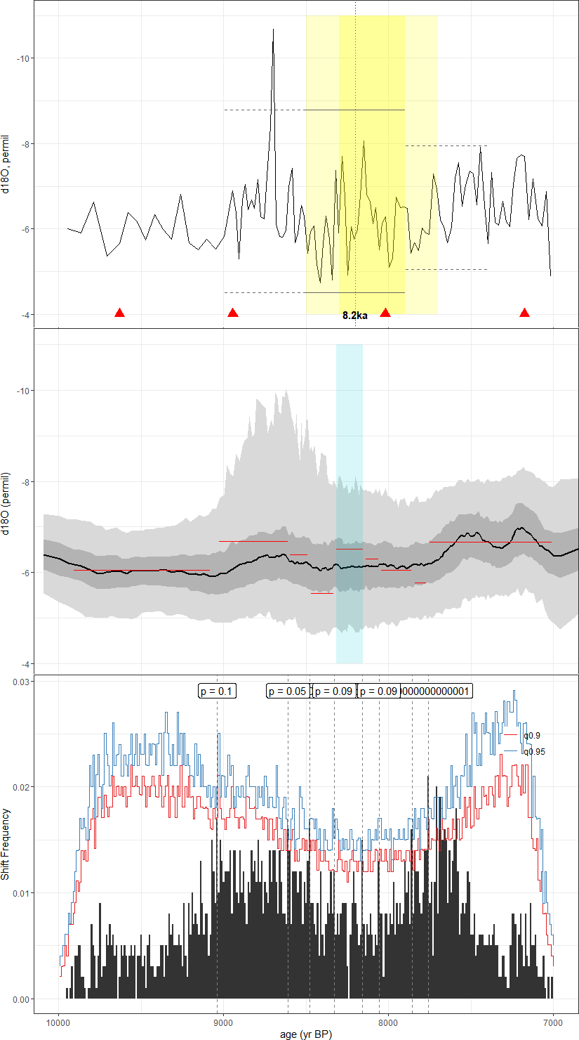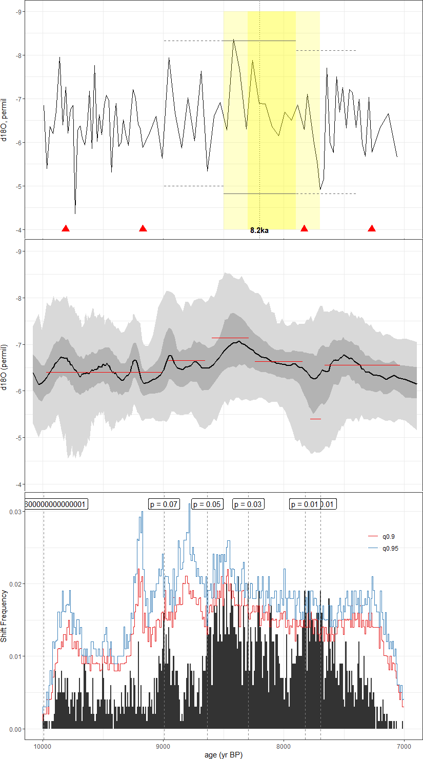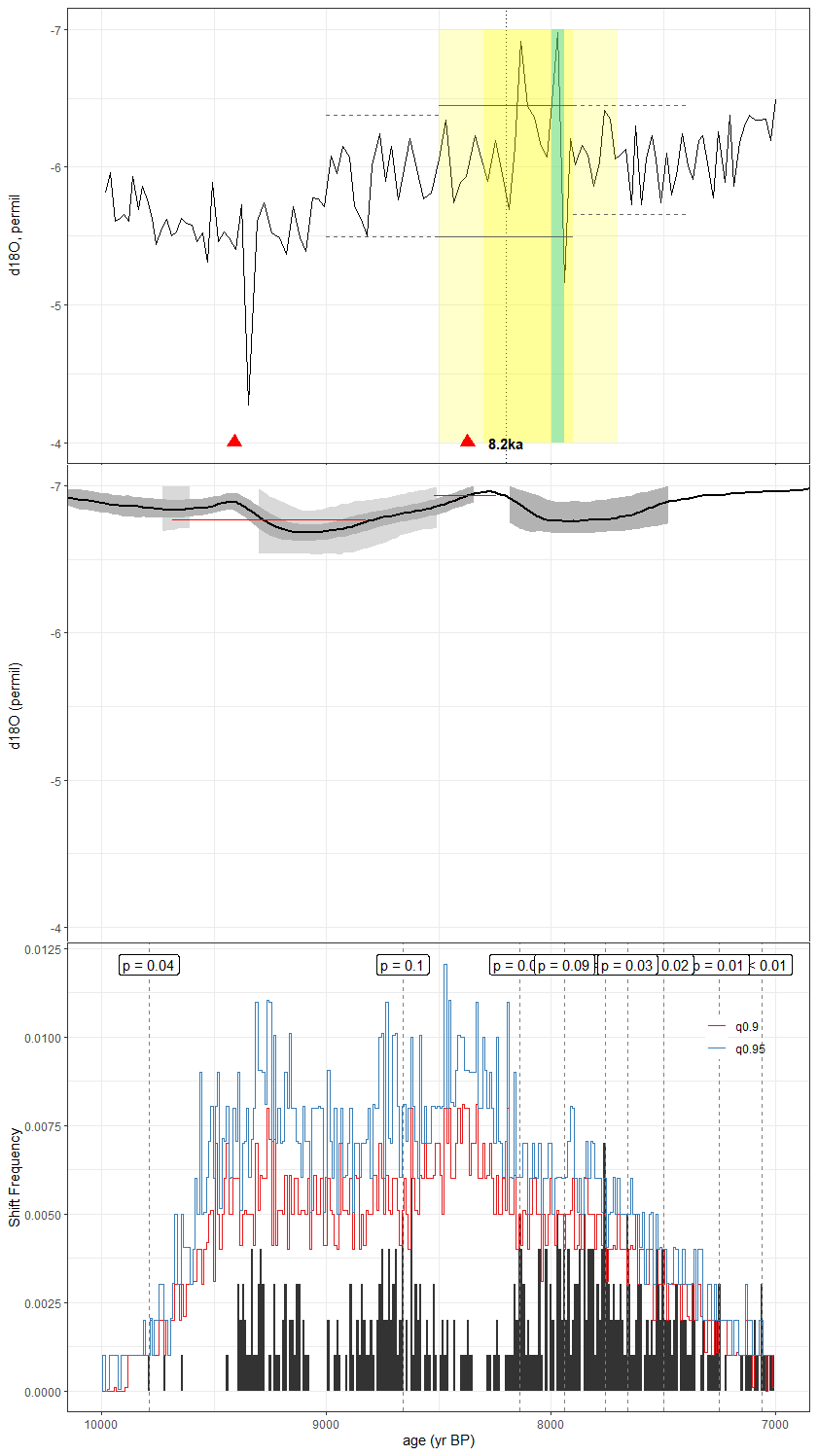 Two types of events were characterized based on the actR results. “Significant events” are defined by the presence of two consecutive changepoints with p<0.05 over the 7.9–8.3 ka window (“start” and “end”. If more than two consecutive changepoints exist over that window, the two with the lowest p-values and highest probability are used. The difference between “start” and “end” dates is used to calculate event duration, which we assume to be between a minimum of 20 and a maximum of 300 years. The magnitude of “events” is determined by the greatest absolute value z-score in each record's median age ensemble time series between the actR-derived “start” and “end” dates, with interpretation based on the sign of the z-score corresponding to the interpretation direction of the original authors. “Tentative events” are defined by the presence of two consecutive changepoints with p<0.1 over an extended 7.7–8.5 ka window. Events lasting more than 300 years are removed from consideration. If more than two events are detected within that window, the event with the start date closer to 8.2 ka is chosen as the final 8.2 ka Event.