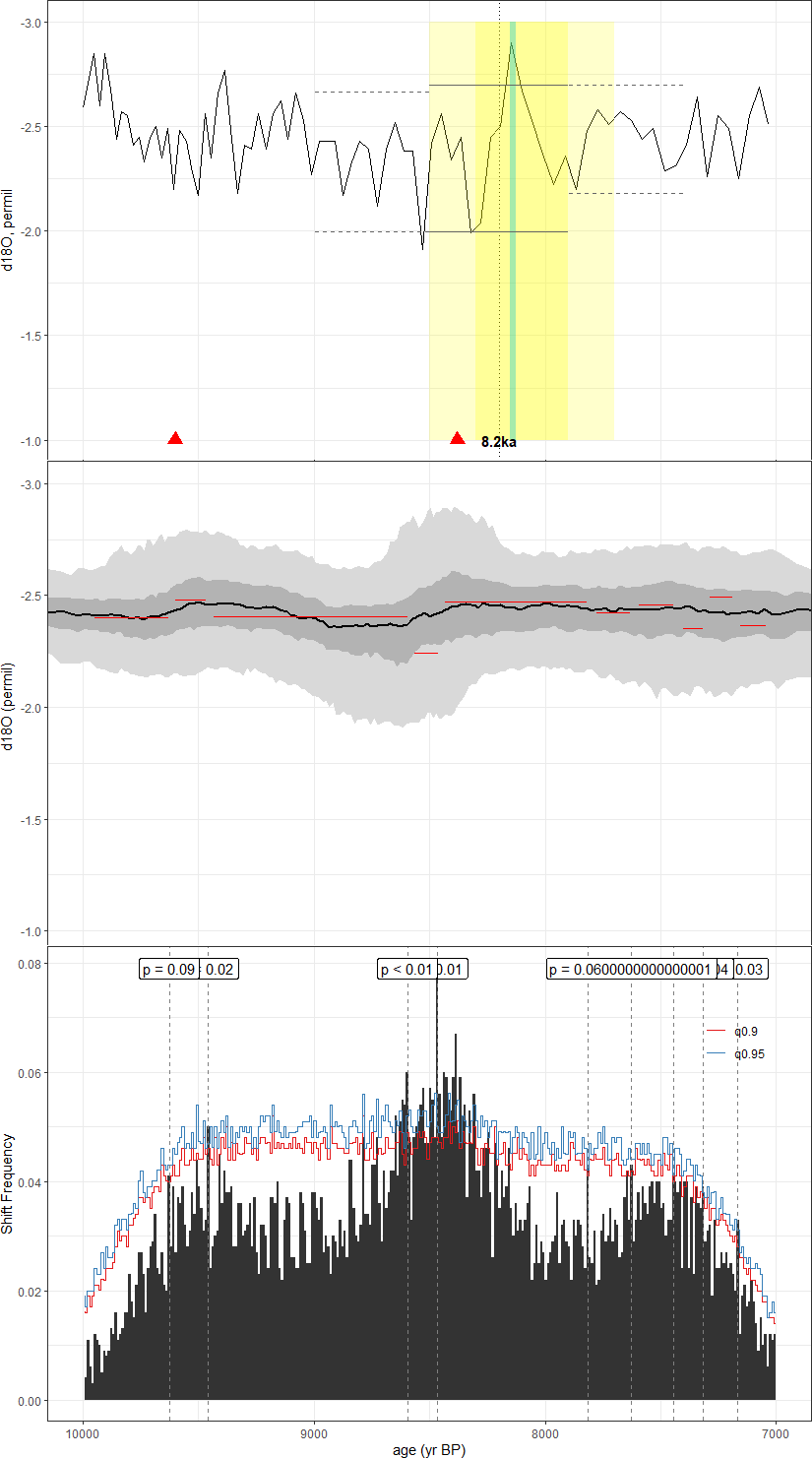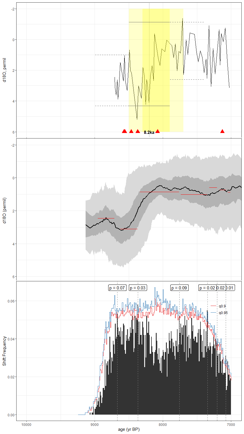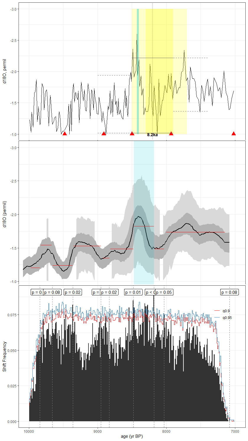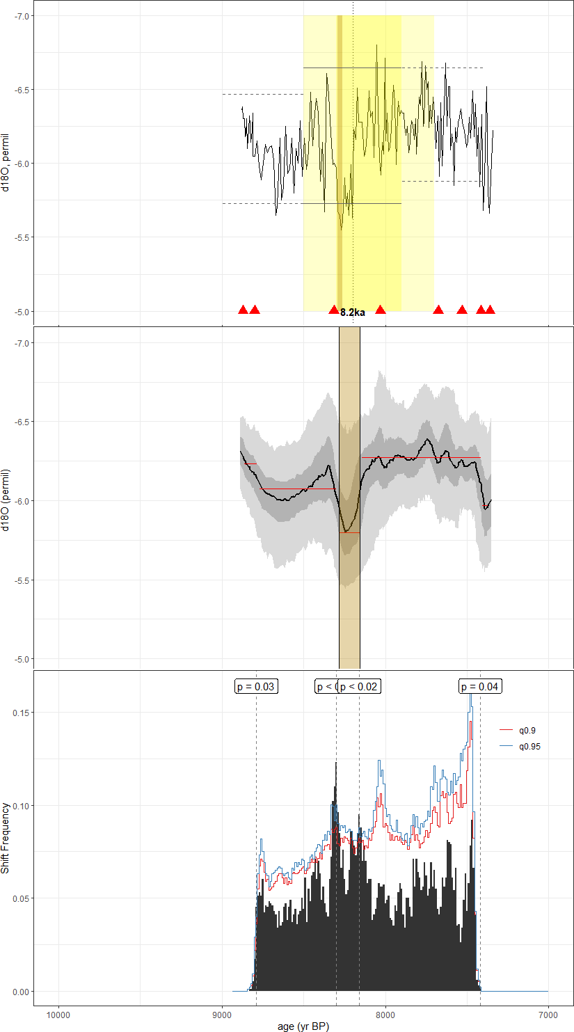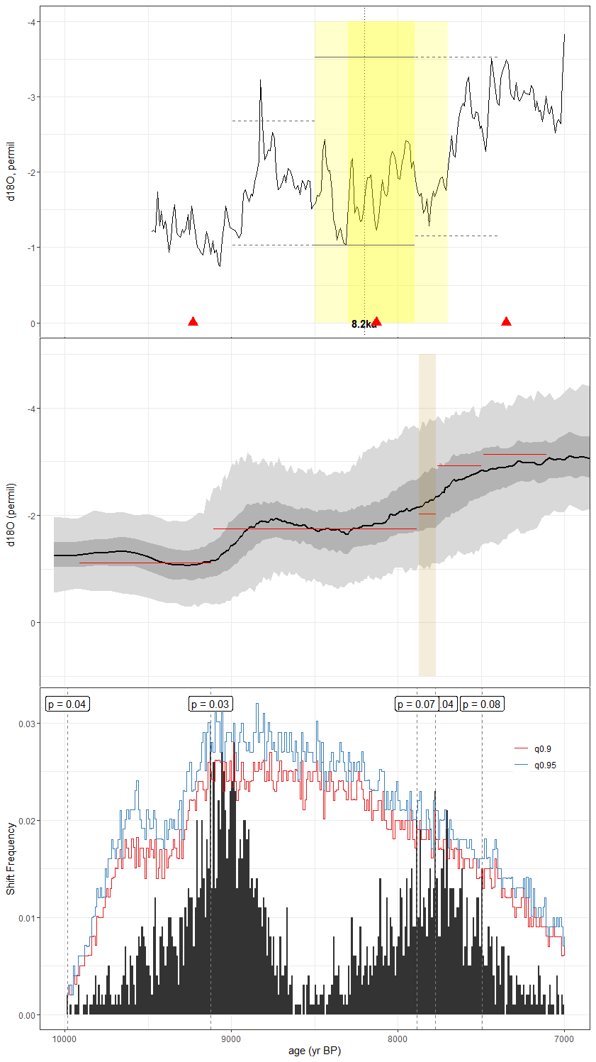 Two types of events were characterized based on the actR results. “Significant events” are defined by the presence of two consecutive changepoints with p<0.05 over the 7.9–8.3 ka window (“start” and “end”. If more than two consecutive changepoints exist over that window, the two with the lowest p-values and highest probability are used. The difference between “start” and “end” dates is used to calculate event duration, which we assume to be between a minimum of 20 and a maximum of 300 years. The magnitude of “events” is determined by the greatest absolute value z-score in each record's median age ensemble time series between the actR-derived “start” and “end” dates, with interpretation based on the sign of the z-score corresponding to the interpretation direction of the original authors. “Tentative events” are defined by the presence of two consecutive changepoints with p<0.1 over an extended 7.7–8.5 ka window. Events lasting more than 300 years are removed from consideration. If more than two events are detected within that window, the event with the start date closer to 8.2 ka is chosen as the final 8.2 ka Event.