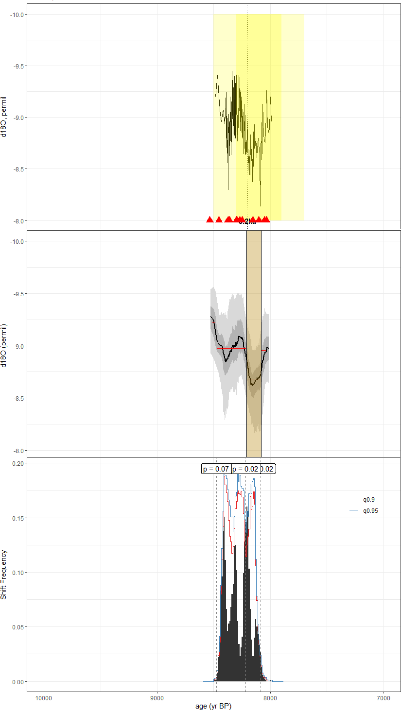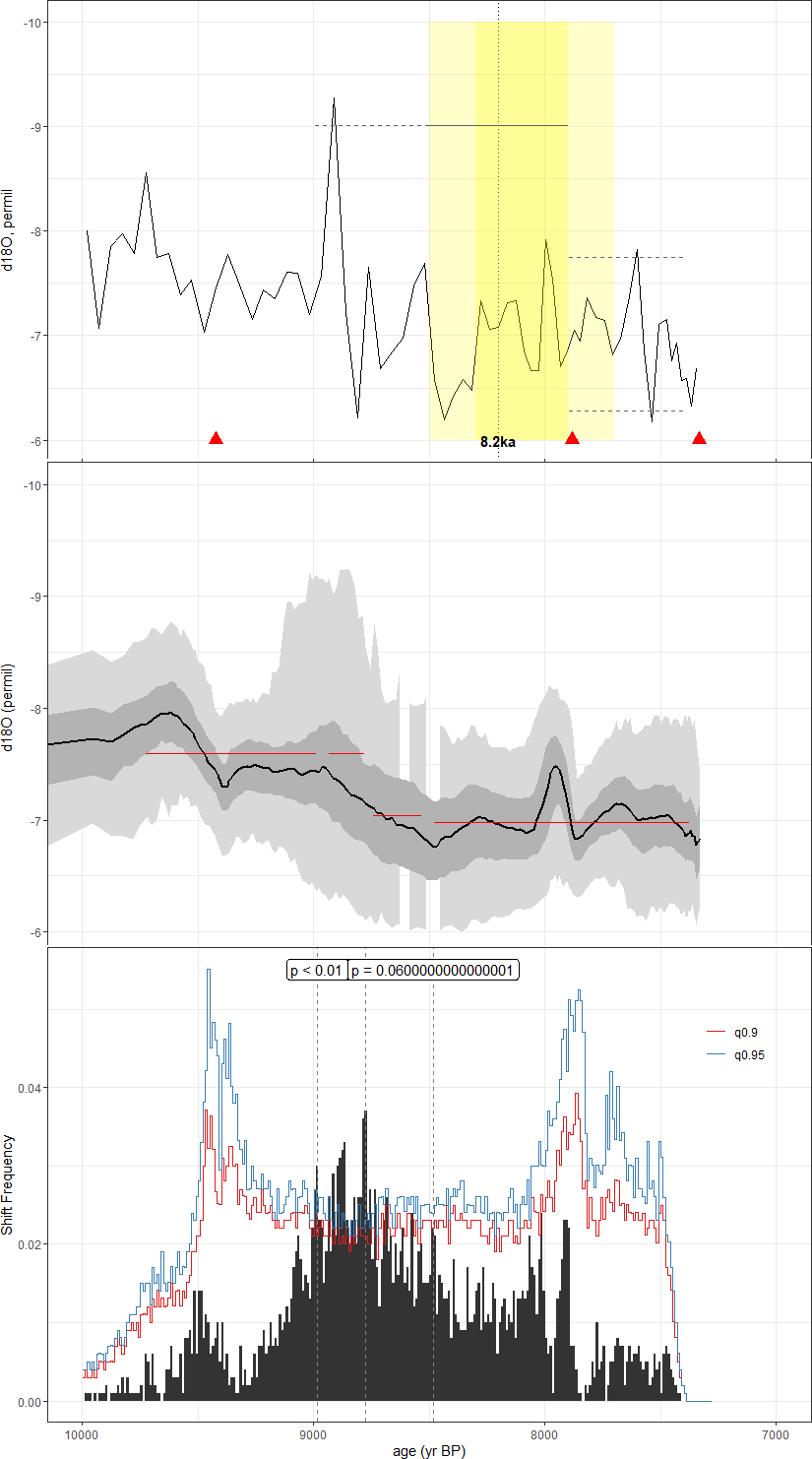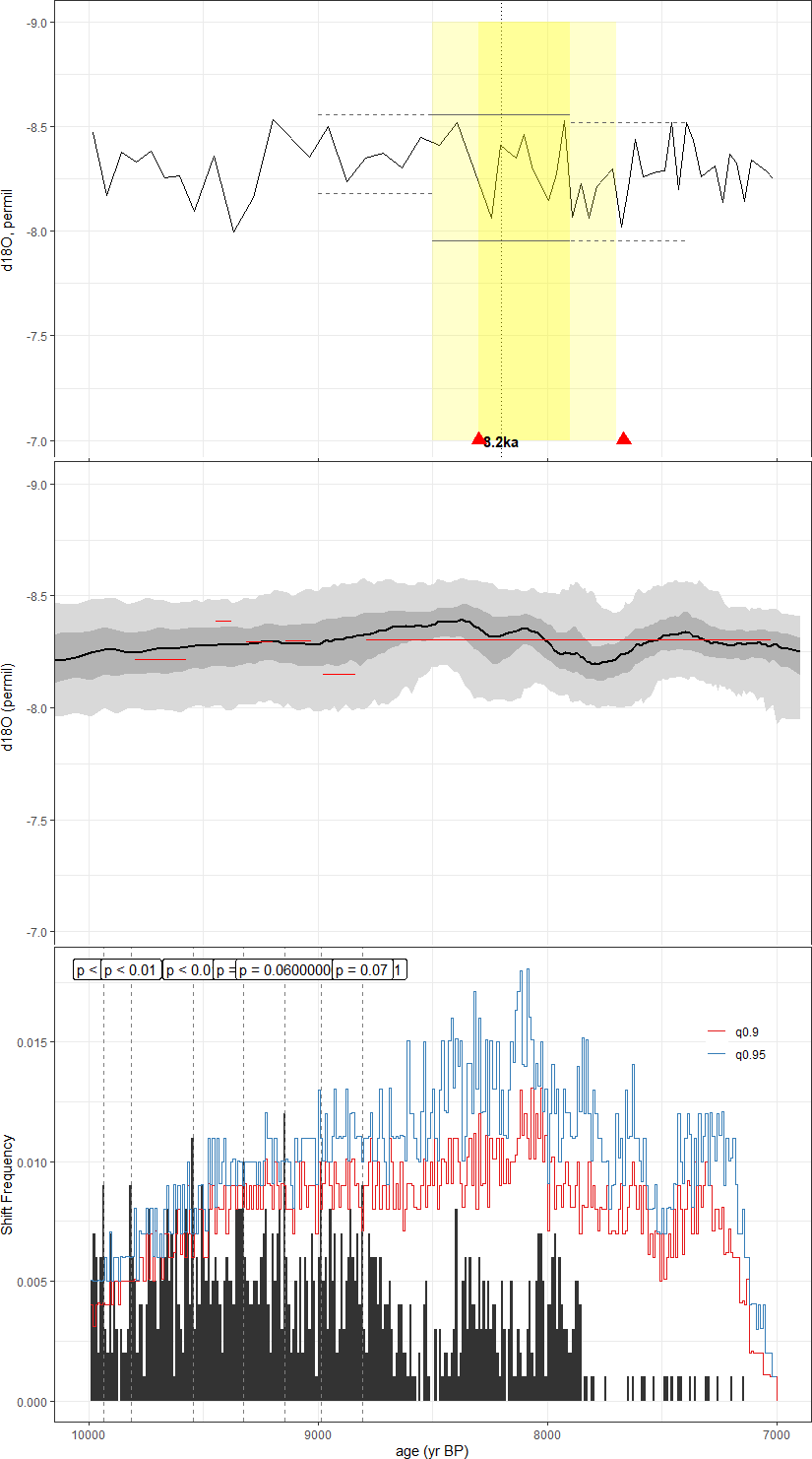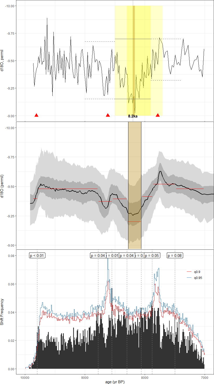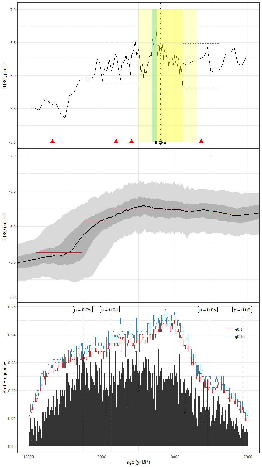 Two types of events were characterized based on the actR results. “Significant events” are defined by the presence of two consecutive changepoints with p<0.05 over the 7.9–8.3 ka window (“start” and “end”. If more than two consecutive changepoints exist over that window, the two with the lowest p-values and highest probability are used. The difference between “start” and “end” dates is used to calculate event duration, which we assume to be between a minimum of 20 and a maximum of 300 years. The magnitude of “events” is determined by the greatest absolute value z-score in each record's median age ensemble time series between the actR-derived “start” and “end” dates, with interpretation based on the sign of the z-score corresponding to the interpretation direction of the original authors. “Tentative events” are defined by the presence of two consecutive changepoints with p<0.1 over an extended 7.7–8.5 ka window. Events lasting more than 300 years are removed from consideration. If more than two events are detected within that window, the event with the start date closer to 8.2 ka is chosen as the final 8.2 ka Event.