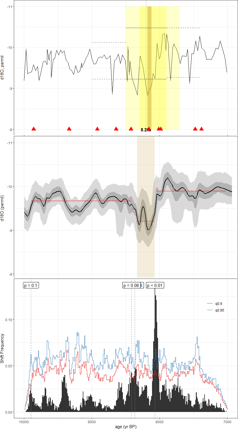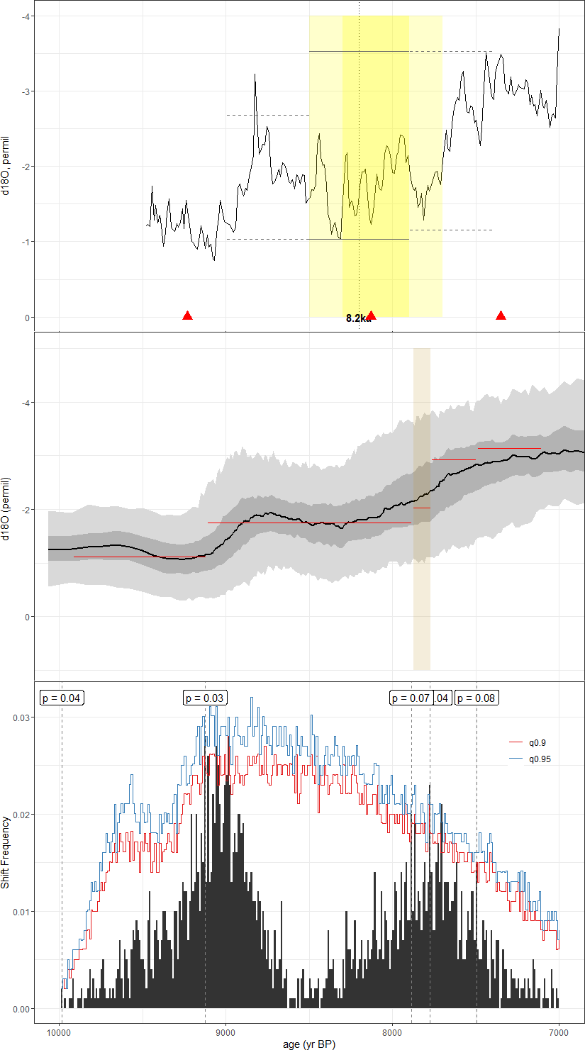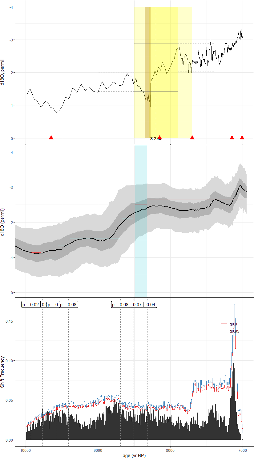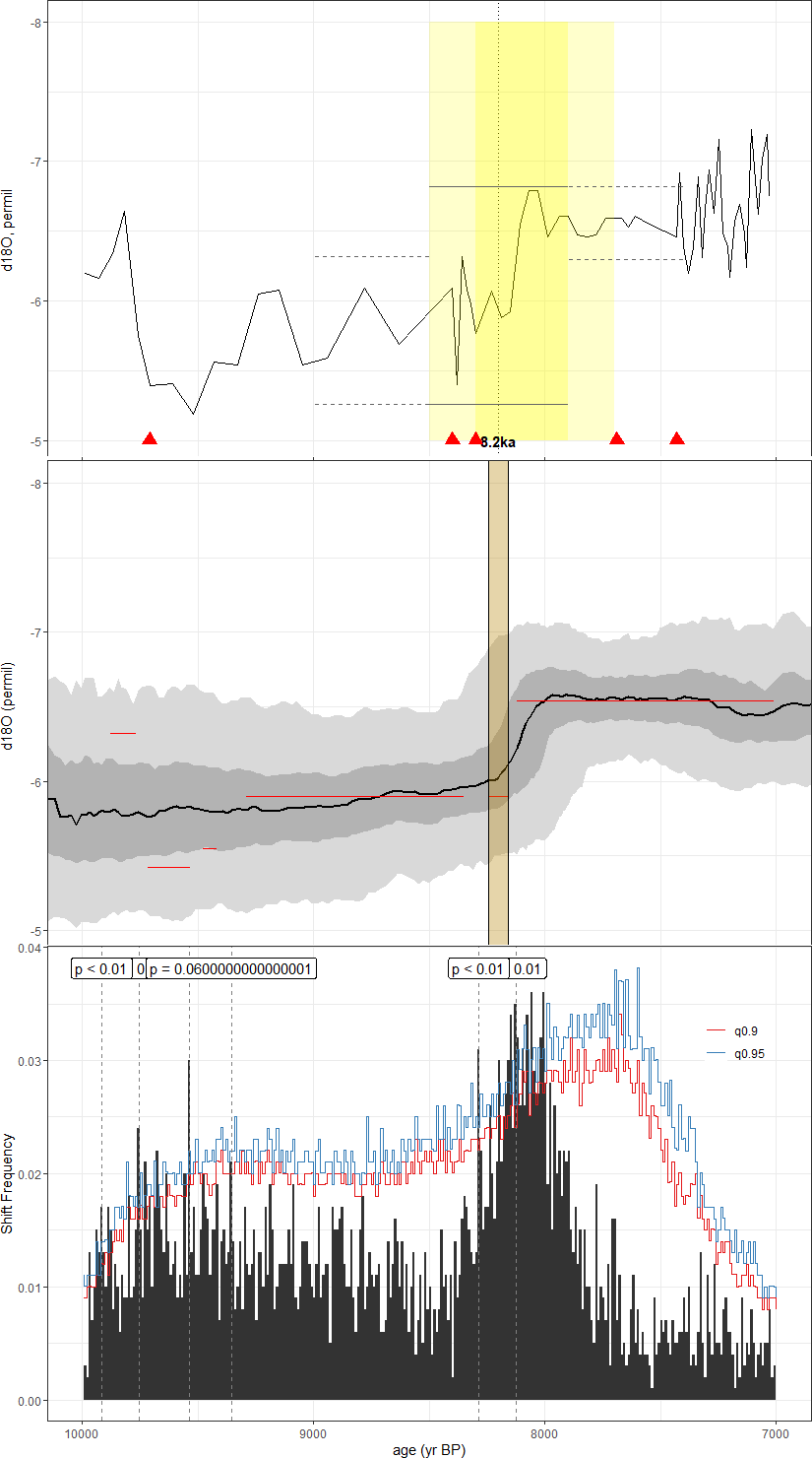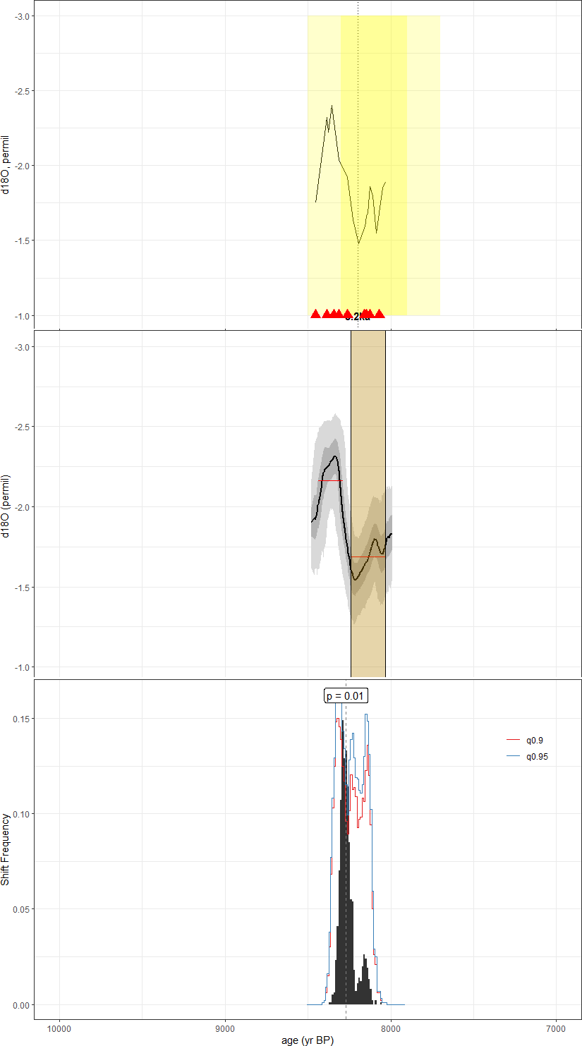 Two types of events were characterized based on the actR results. “Significant events” are defined by the presence of two consecutive changepoints with p<0.05 over the 7.9–8.3 ka window (“start” and “end”. If more than two consecutive changepoints exist over that window, the two with the lowest p-values and highest probability are used. The difference between “start” and “end” dates is used to calculate event duration, which we assume to be between a minimum of 20 and a maximum of 300 years. The magnitude of “events” is determined by the greatest absolute value z-score in each record's median age ensemble time series between the actR-derived “start” and “end” dates, with interpretation based on the sign of the z-score corresponding to the interpretation direction of the original authors. “Tentative events” are defined by the presence of two consecutive changepoints with p<0.1 over an extended 7.7–8.5 ka window. Events lasting more than 300 years are removed from consideration. If more than two events are detected within that window, the event with the start date closer to 8.2 ka is chosen as the final 8.2 ka Event.