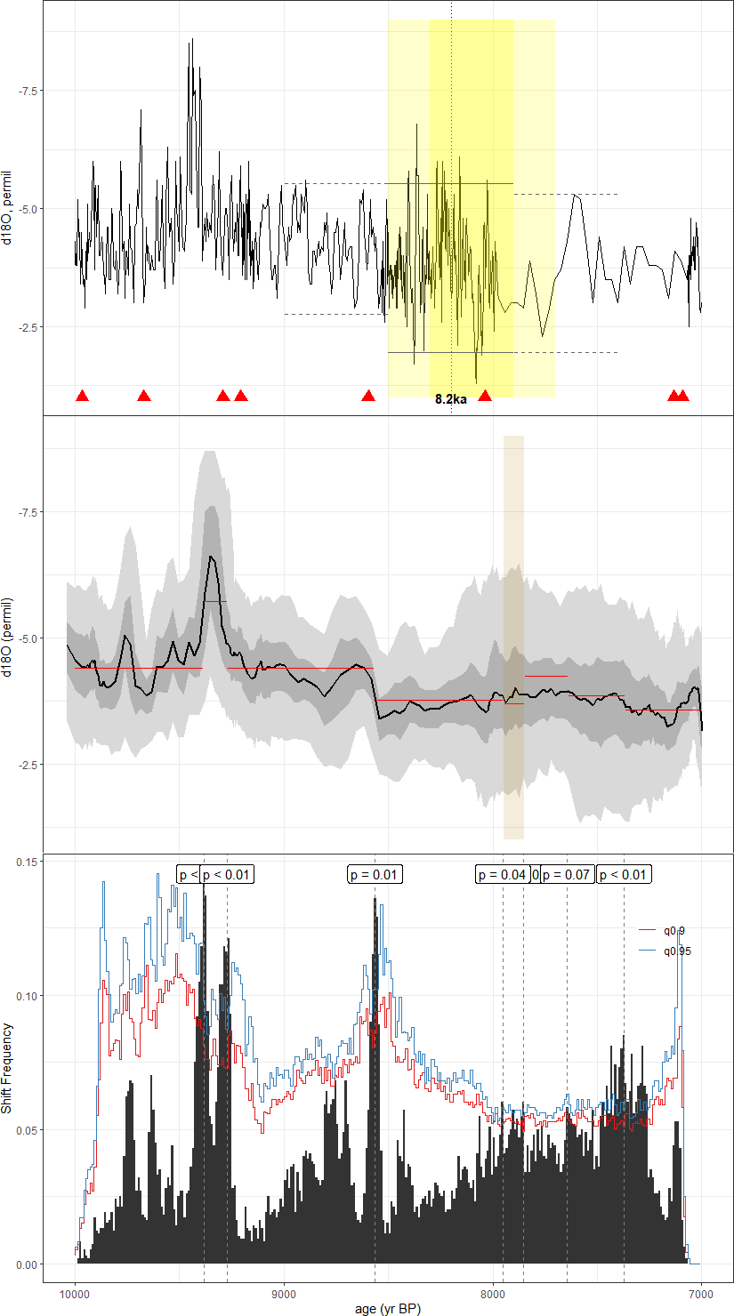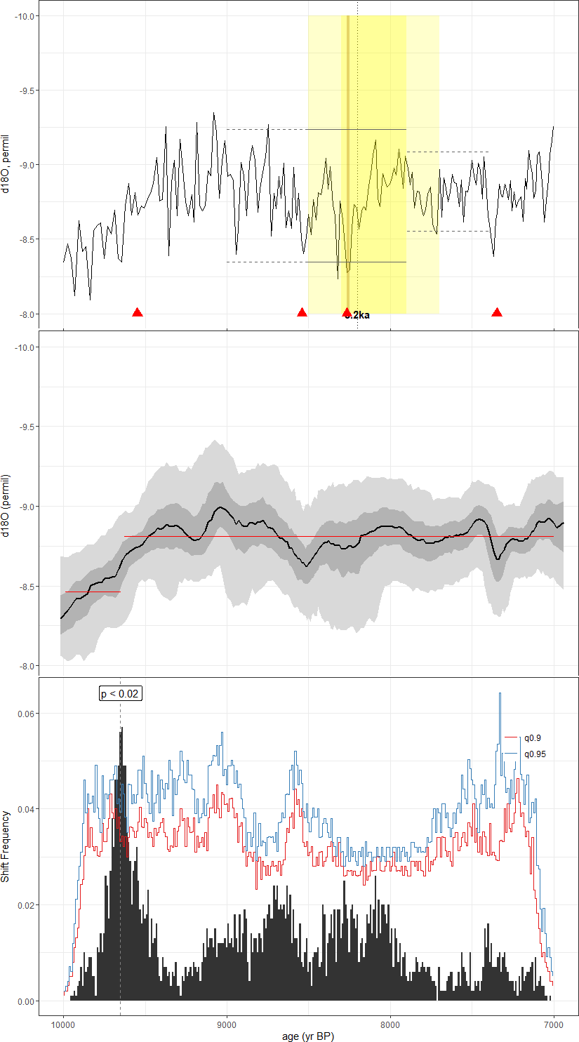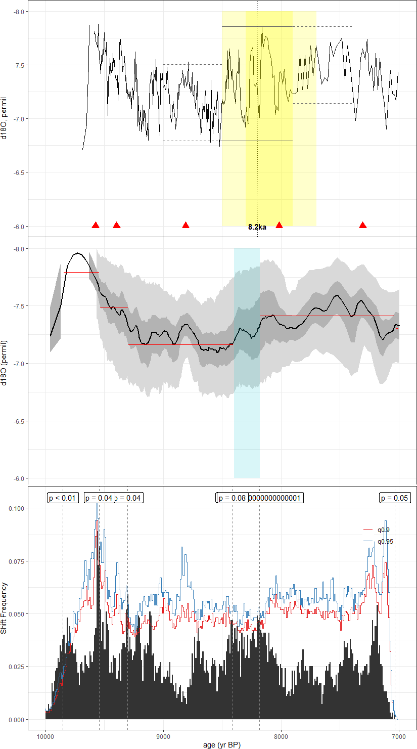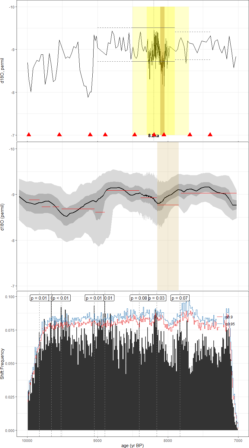 Two types of events were characterized based on the actR results. “Significant events” are defined by the presence of two consecutive changepoints with p<0.05 over the 7.9–8.3 ka window (“start” and “end”. If more than two consecutive changepoints exist over that window, the two with the lowest p-values and highest probability are used. The difference between “start” and “end” dates is used to calculate event duration, which we assume to be between a minimum of 20 and a maximum of 300 years. The magnitude of “events” is determined by the greatest absolute value z-score in each record's median age ensemble time series between the actR-derived “start” and “end” dates, with interpretation based on the sign of the z-score corresponding to the interpretation direction of the original authors. “Tentative events” are defined by the presence of two consecutive changepoints with p<0.1 over an extended 7.7–8.5 ka window. Events lasting more than 300 years are removed from consideration. If more than two events are detected within that window, the event with the start date closer to 8.2 ka is chosen as the final 8.2 ka Event.