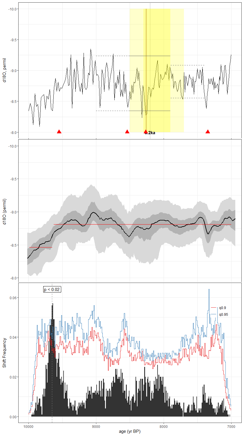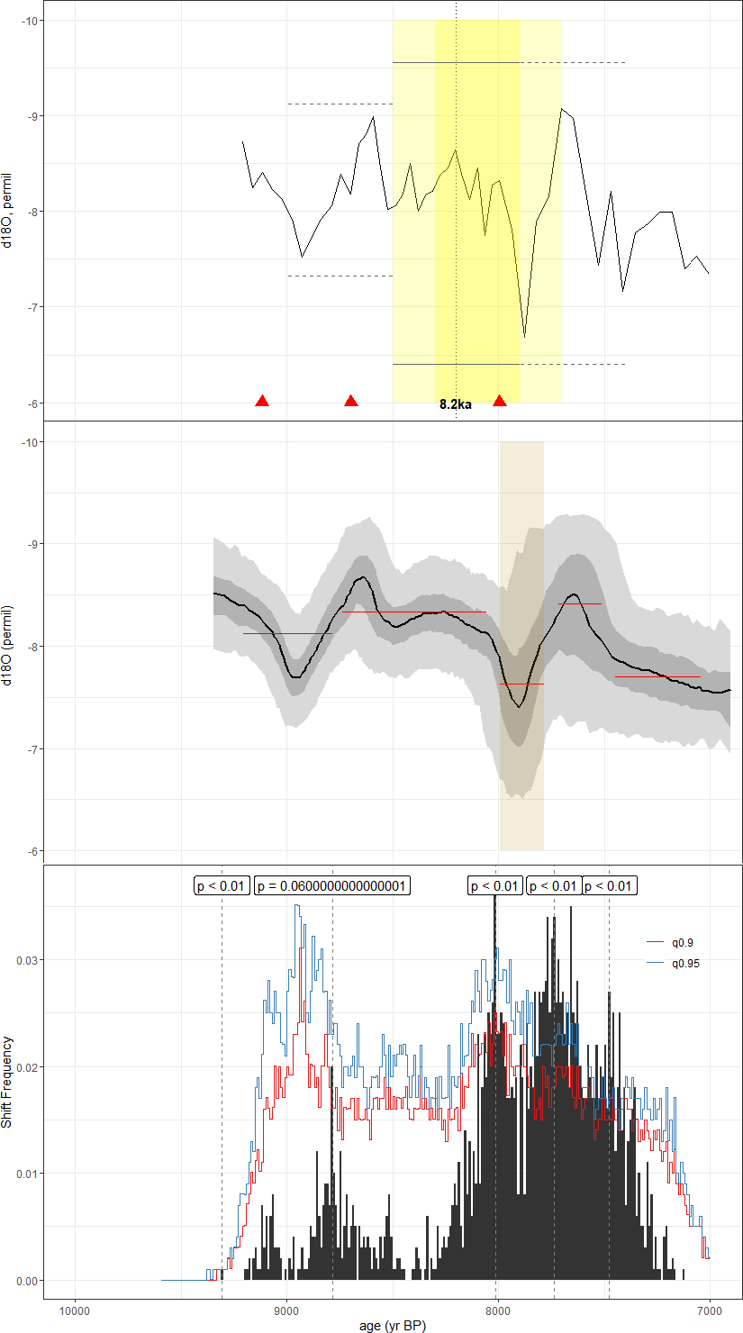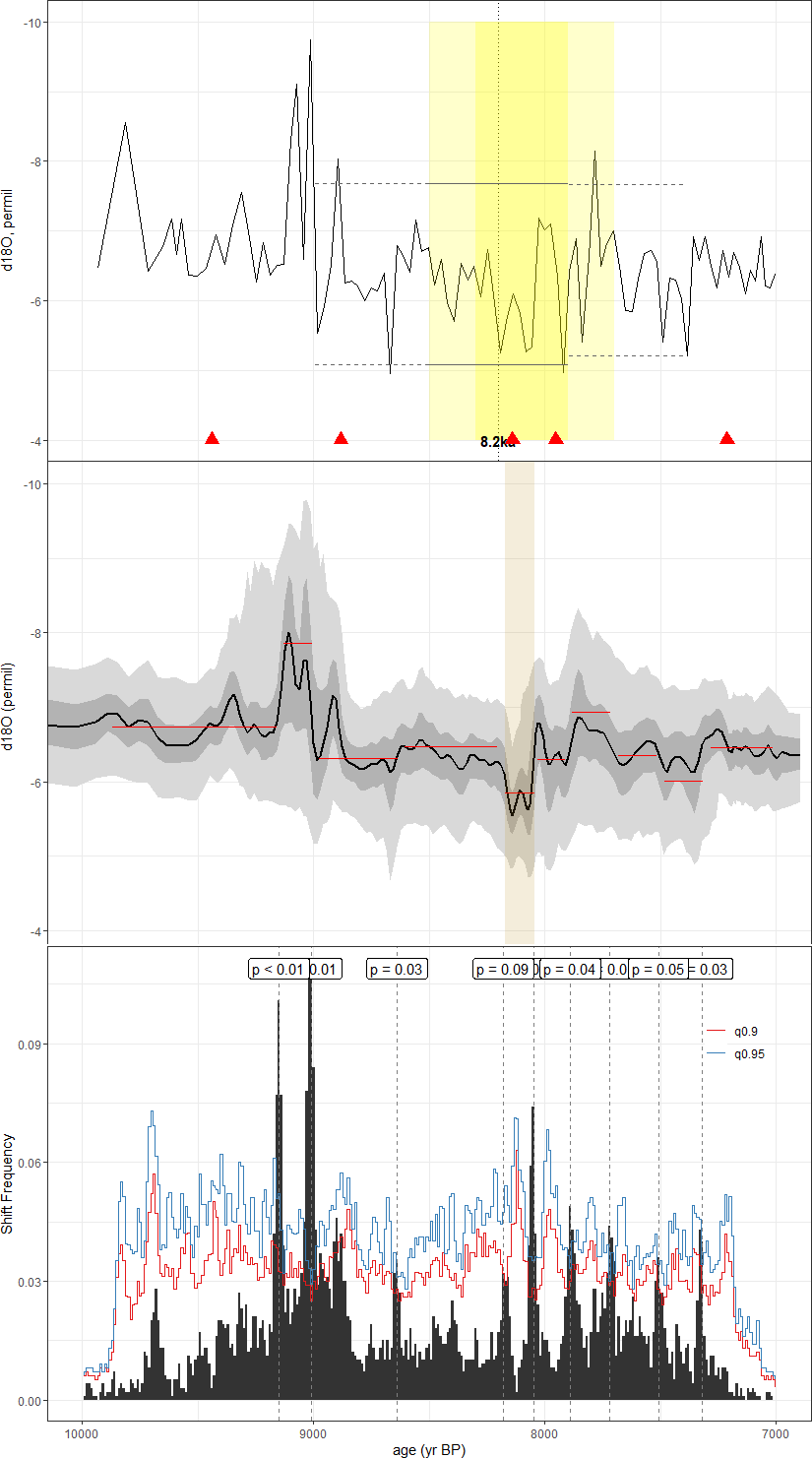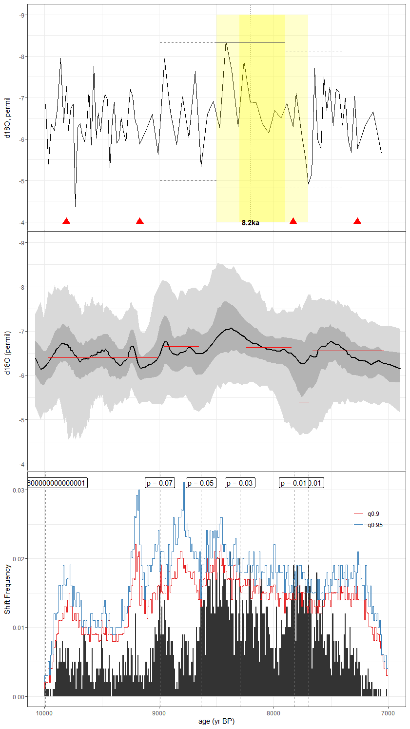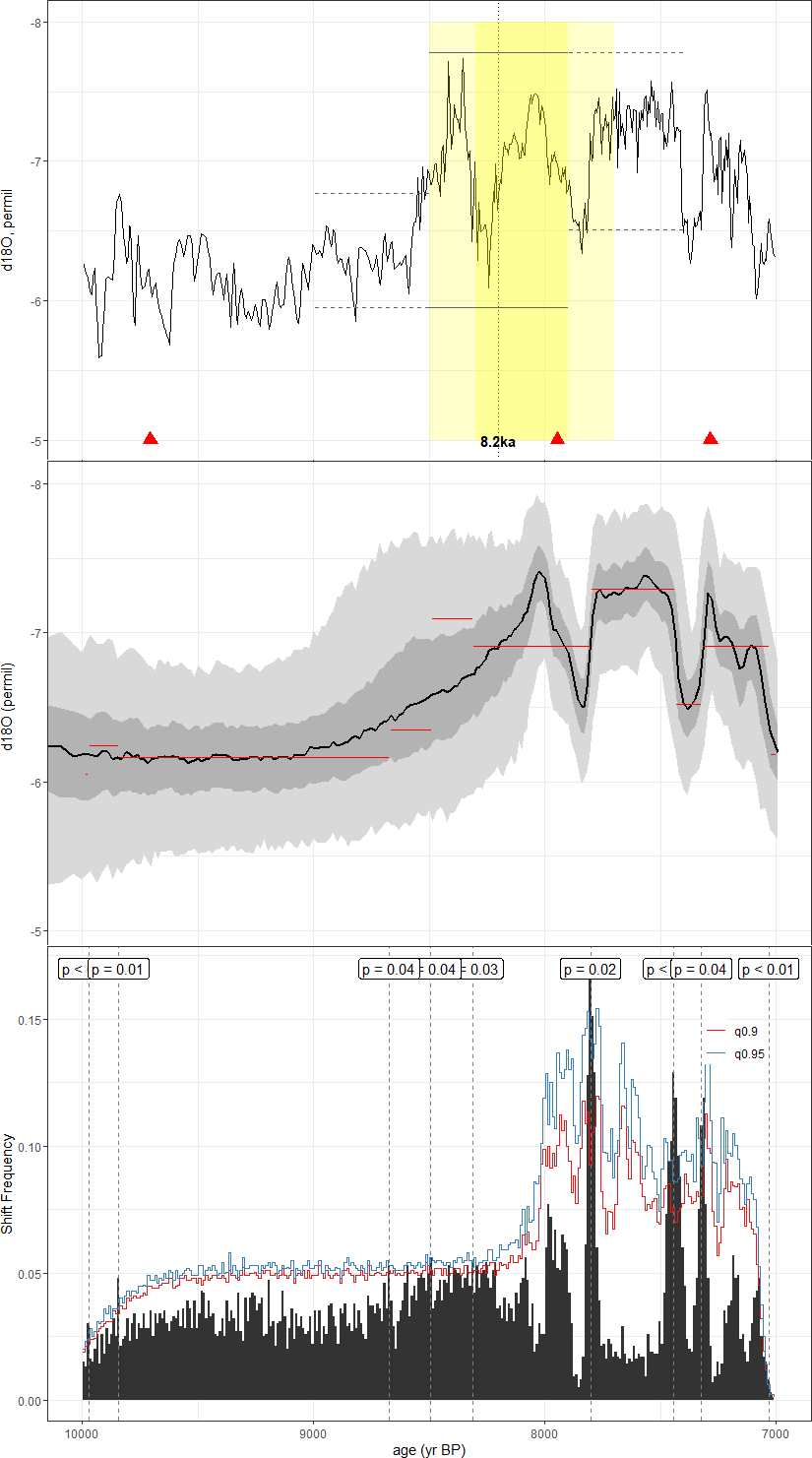 Two types of events were characterized based on the actR results. “Significant events” are defined by the presence of two consecutive changepoints with p<0.05 over the 7.9–8.3 ka window (“start” and “end”. If more than two consecutive changepoints exist over that window, the two with the lowest p-values and highest probability are used. The difference between “start” and “end” dates is used to calculate event duration, which we assume to be between a minimum of 20 and a maximum of 300 years. The magnitude of “events” is determined by the greatest absolute value z-score in each record's median age ensemble time series between the actR-derived “start” and “end” dates, with interpretation based on the sign of the z-score corresponding to the interpretation direction of the original authors. “Tentative events” are defined by the presence of two consecutive changepoints with p<0.1 over an extended 7.7–8.5 ka window. Events lasting more than 300 years are removed from consideration. If more than two events are detected within that window, the event with the start date closer to 8.2 ka is chosen as the final 8.2 ka Event.