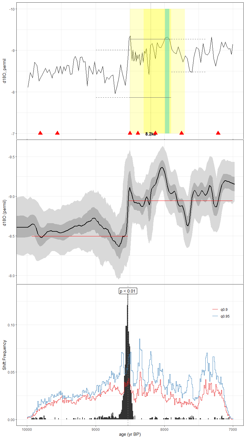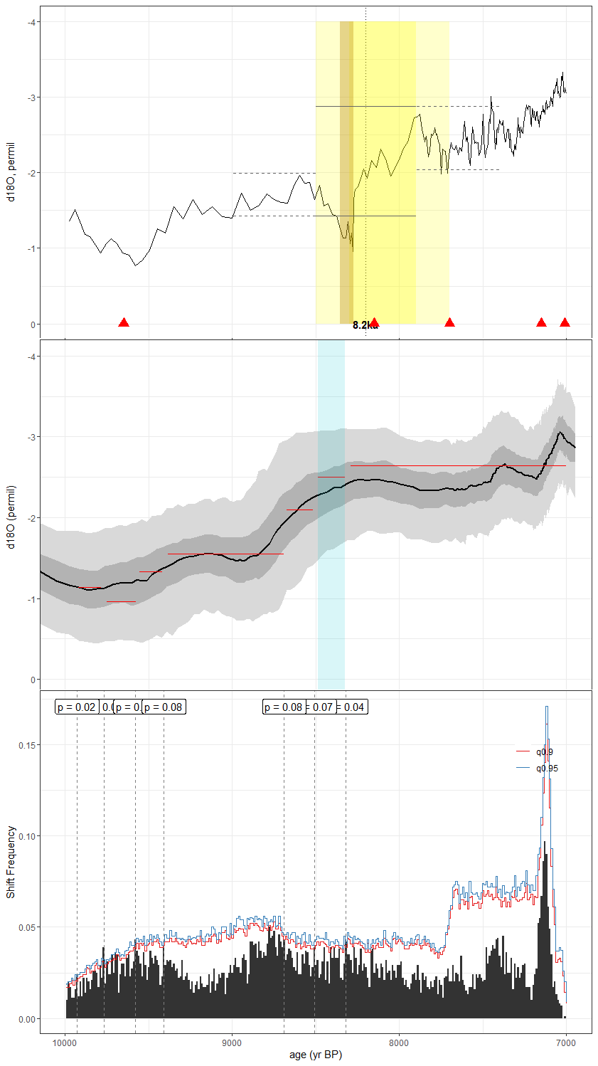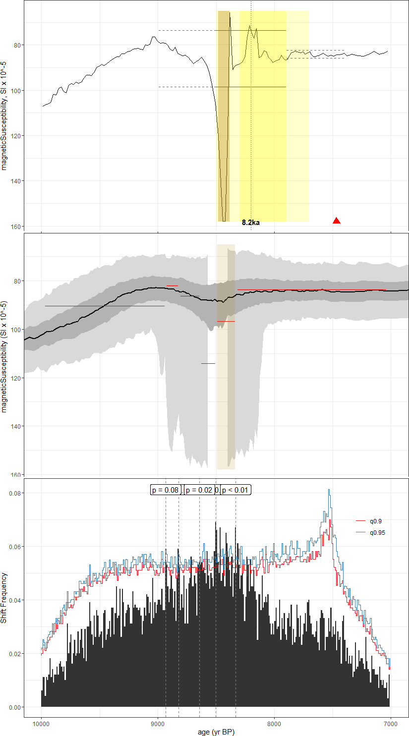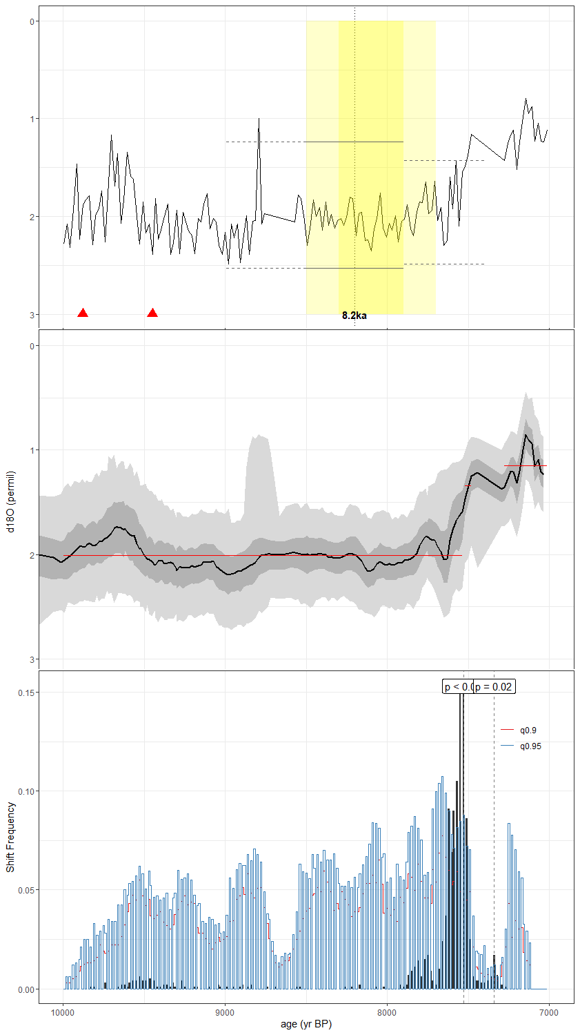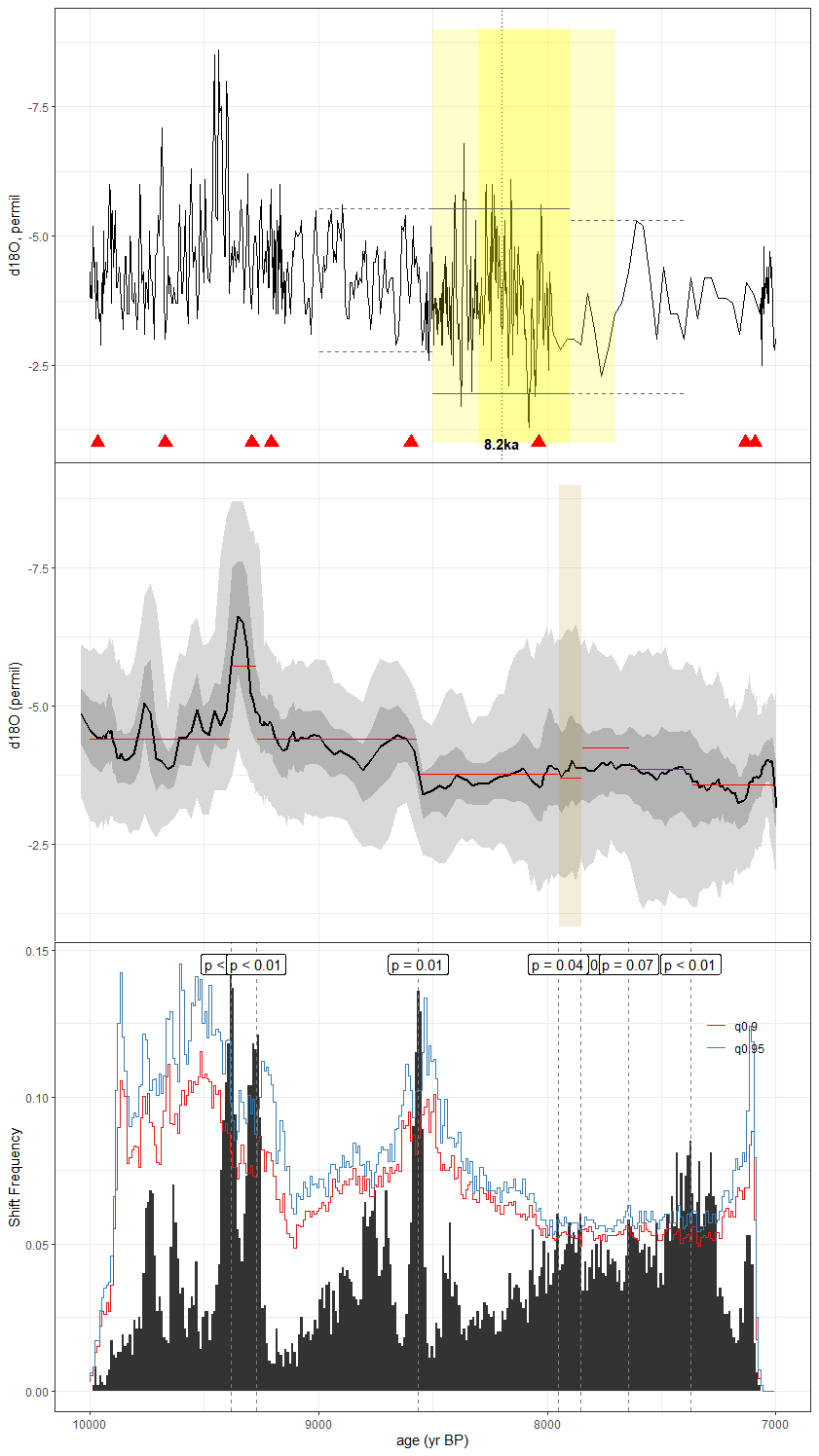 Two types of events were characterized based on the actR results. “Significant events” are defined by the presence of two consecutive changepoints with p<0.05 over the 7.9–8.3 ka window (“start” and “end”. If more than two consecutive changepoints exist over that window, the two with the lowest p-values and highest probability are used. The difference between “start” and “end” dates is used to calculate event duration, which we assume to be between a minimum of 20 and a maximum of 300 years. The magnitude of “events” is determined by the greatest absolute value z-score in each record's median age ensemble time series between the actR-derived “start” and “end” dates, with interpretation based on the sign of the z-score corresponding to the interpretation direction of the original authors. “Tentative events” are defined by the presence of two consecutive changepoints with p<0.1 over an extended 7.7–8.5 ka window. Events lasting more than 300 years are removed from consideration. If more than two events are detected within that window, the event with the start date closer to 8.2 ka is chosen as the final 8.2 ka Event.