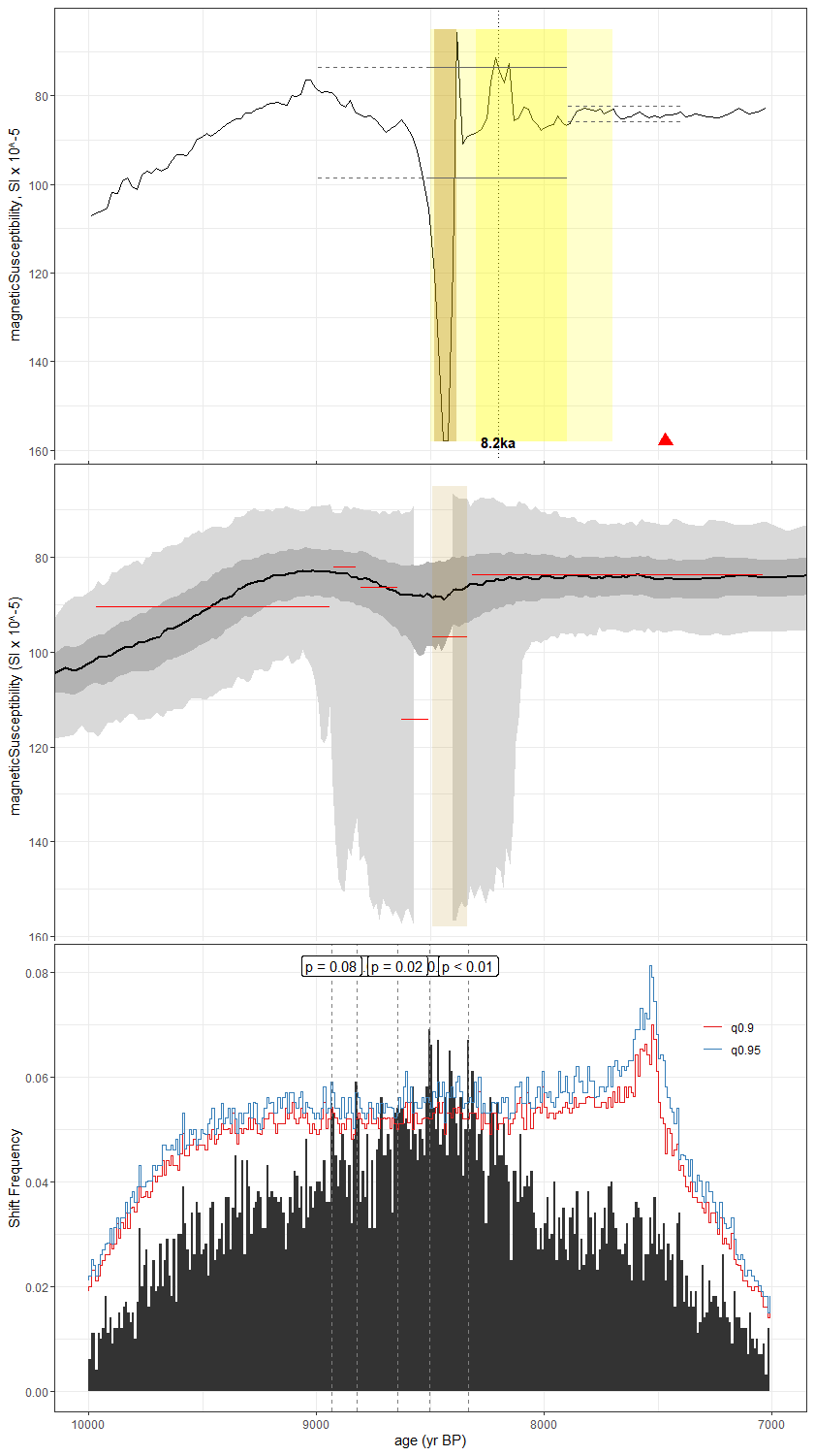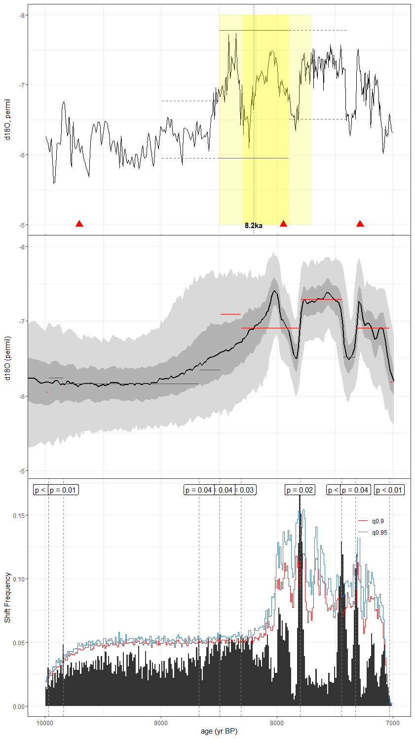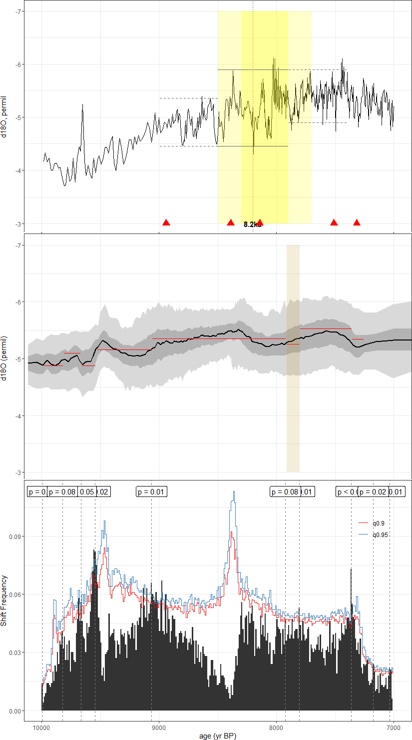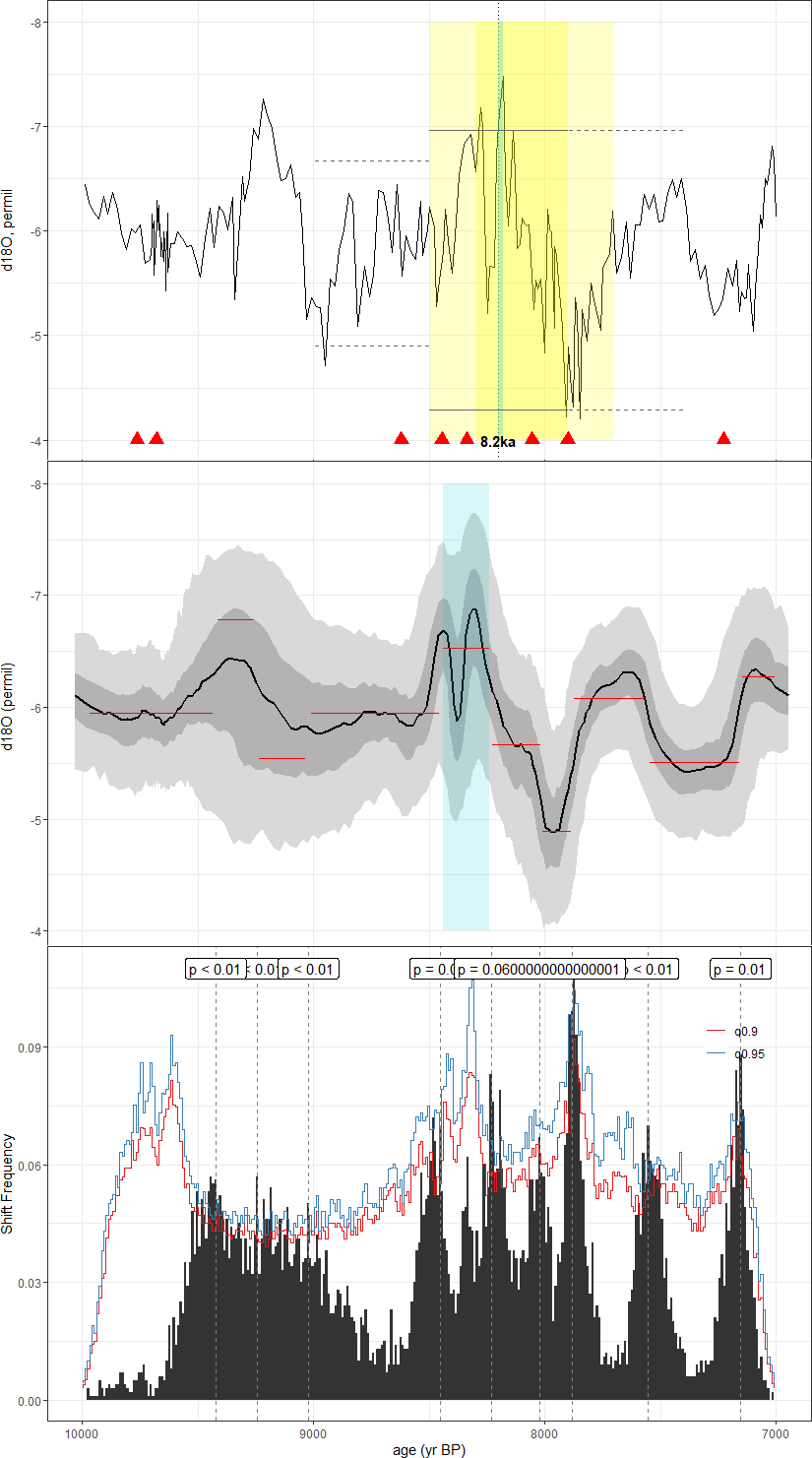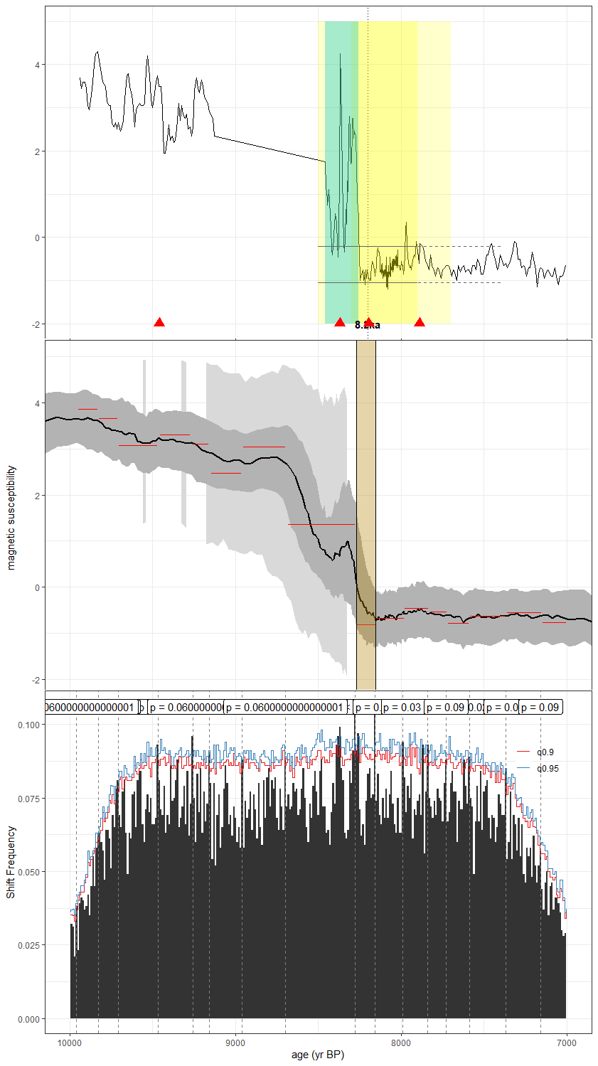 Two types of events were characterized based on the actR results. “Significant events” are defined by the presence of two consecutive changepoints with p<0.05 over the 7.9–8.3 ka window (“start” and “end”. If more than two consecutive changepoints exist over that window, the two with the lowest p-values and highest probability are used. The difference between “start” and “end” dates is used to calculate event duration, which we assume to be between a minimum of 20 and a maximum of 300 years. The magnitude of “events” is determined by the greatest absolute value z-score in each record's median age ensemble time series between the actR-derived “start” and “end” dates, with interpretation based on the sign of the z-score corresponding to the interpretation direction of the original authors. “Tentative events” are defined by the presence of two consecutive changepoints with p<0.1 over an extended 7.7–8.5 ka window. Events lasting more than 300 years are removed from consideration. If more than two events are detected within that window, the event with the start date closer to 8.2 ka is chosen as the final 8.2 ka Event.