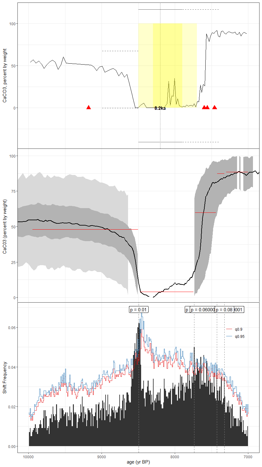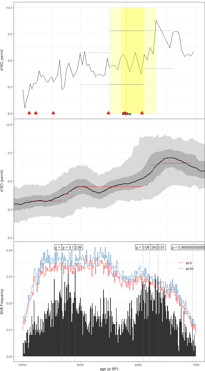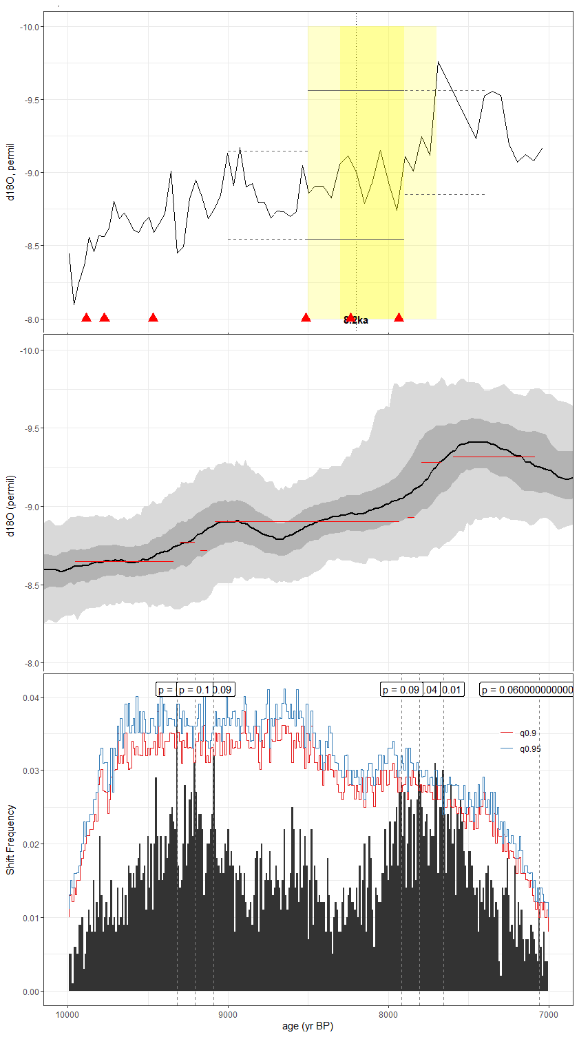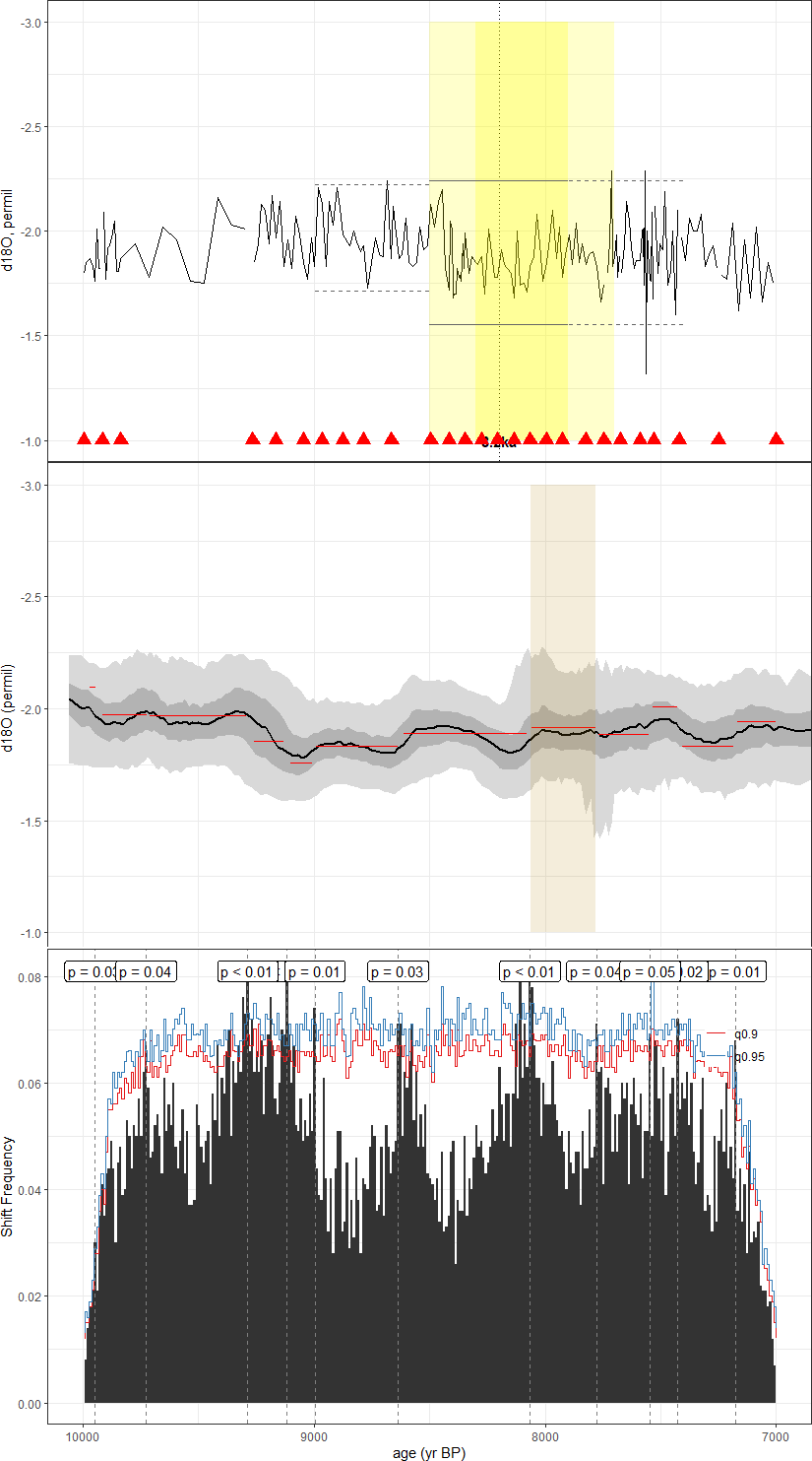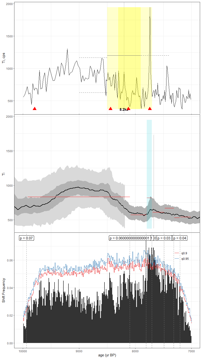 Two types of events were characterized based on the actR results. “Significant events” are defined by the presence of two consecutive changepoints with p<0.05 over the 7.9–8.3 ka window (“start” and “end”. If more than two consecutive changepoints exist over that window, the two with the lowest p-values and highest probability are used. The difference between “start” and “end” dates is used to calculate event duration, which we assume to be between a minimum of 20 and a maximum of 300 years. The magnitude of “events” is determined by the greatest absolute value z-score in each record's median age ensemble time series between the actR-derived “start” and “end” dates, with interpretation based on the sign of the z-score corresponding to the interpretation direction of the original authors. “Tentative events” are defined by the presence of two consecutive changepoints with p<0.1 over an extended 7.7–8.5 ka window. Events lasting more than 300 years are removed from consideration. If more than two events are detected within that window, the event with the start date closer to 8.2 ka is chosen as the final 8.2 ka Event.