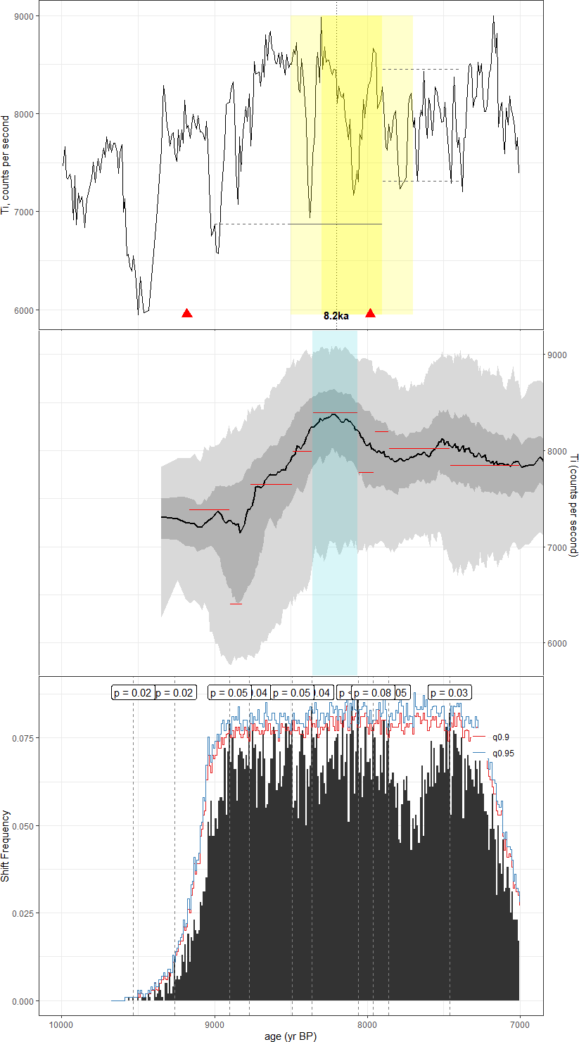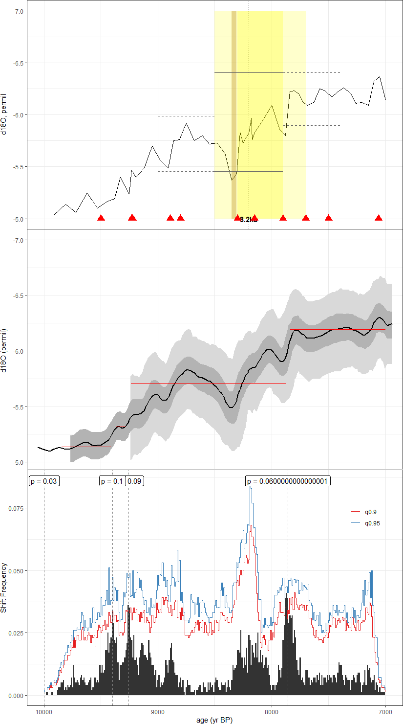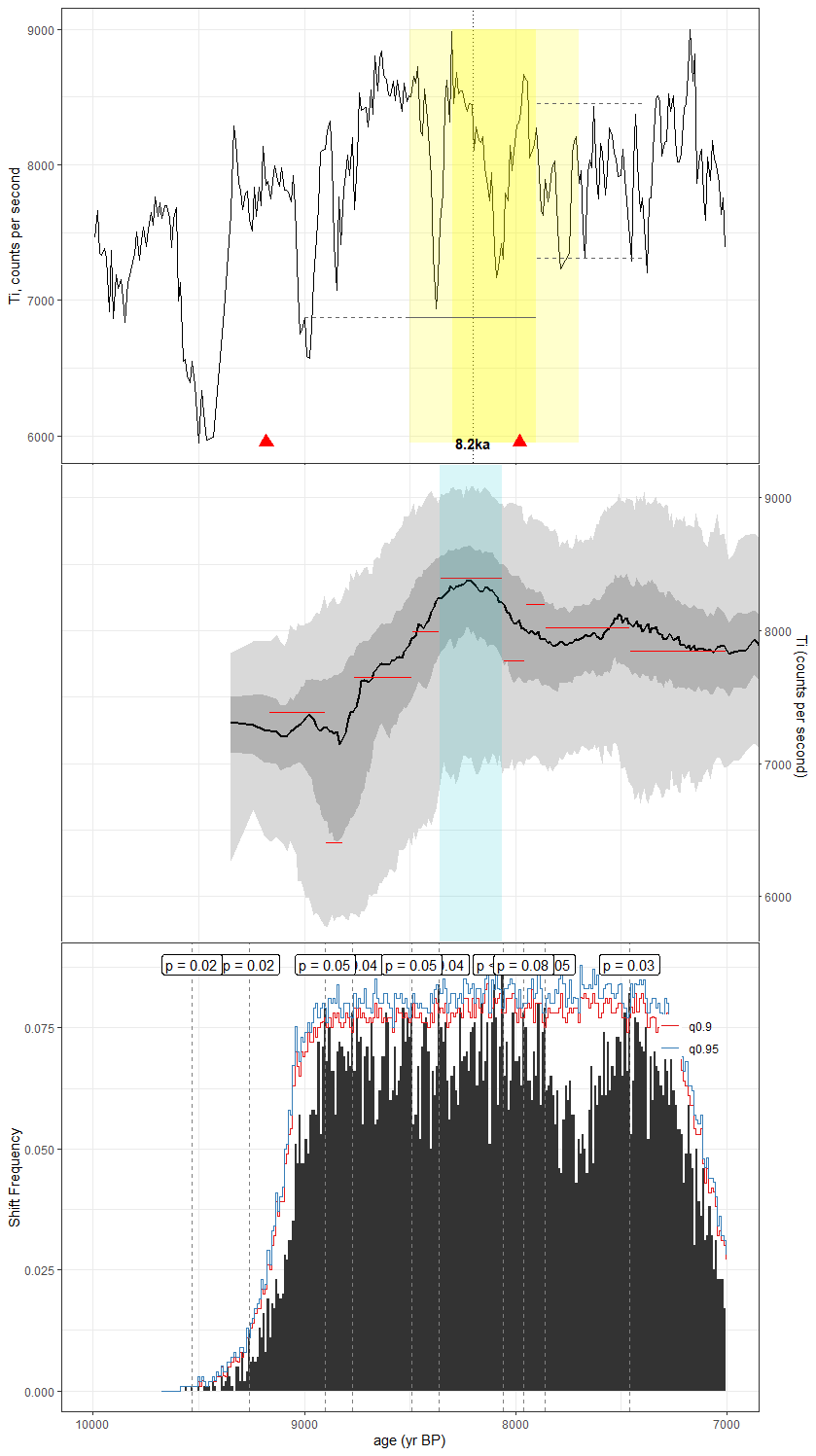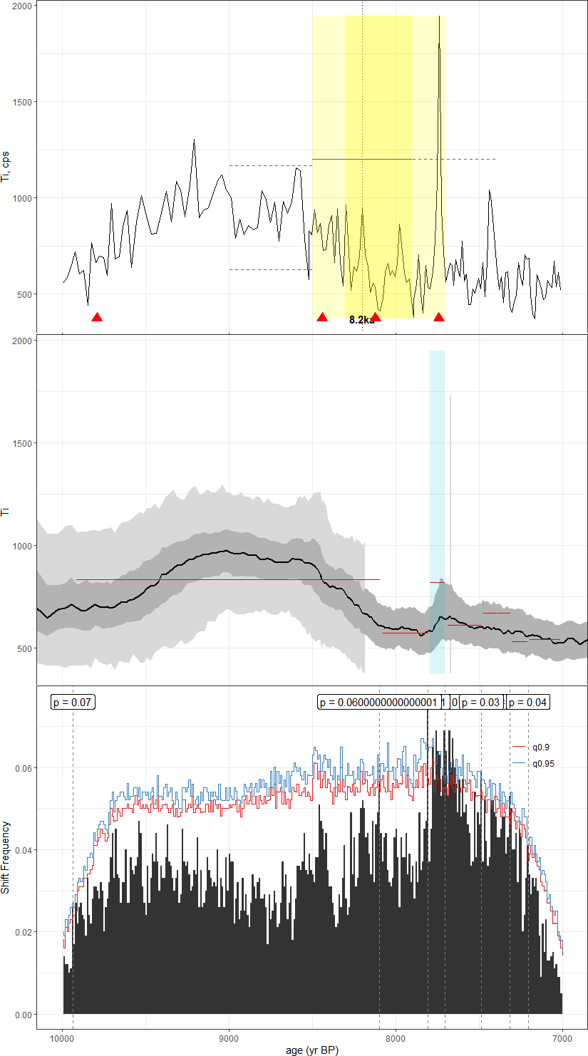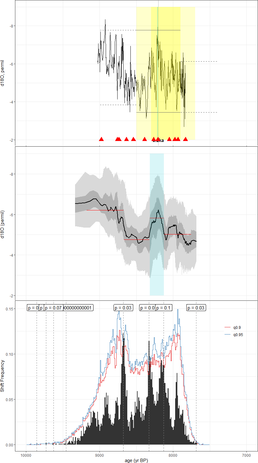Two types of events were characterized based on the actR results. “Significant events” are defined by the presence of two consecutive changepoints with p<0.05 over the 7.9–8.3 ka window (“start” and “end”. If more than two consecutive changepoints exist over that window, the two with the lowest p-values and highest probability are used. The difference between “start” and “end” dates is used to calculate event duration, which we assume to be between a minimum of 20 and a maximum of 300 years. The magnitude of “events” is determined by the greatest absolute value z-score in each record's median age ensemble time series between the actR-derived “start” and “end” dates, with interpretation based on the sign of the z-score corresponding to the interpretation direction of the original authors. “Tentative events” are defined by the presence of two consecutive changepoints with p<0.1 over an extended 7.7–8.5 ka window. Events lasting more than 300 years are removed from consideration. If more than two events are detected within that window, the event with the start date closer to 8.2 ka is chosen as the final 8.2 ka Event.