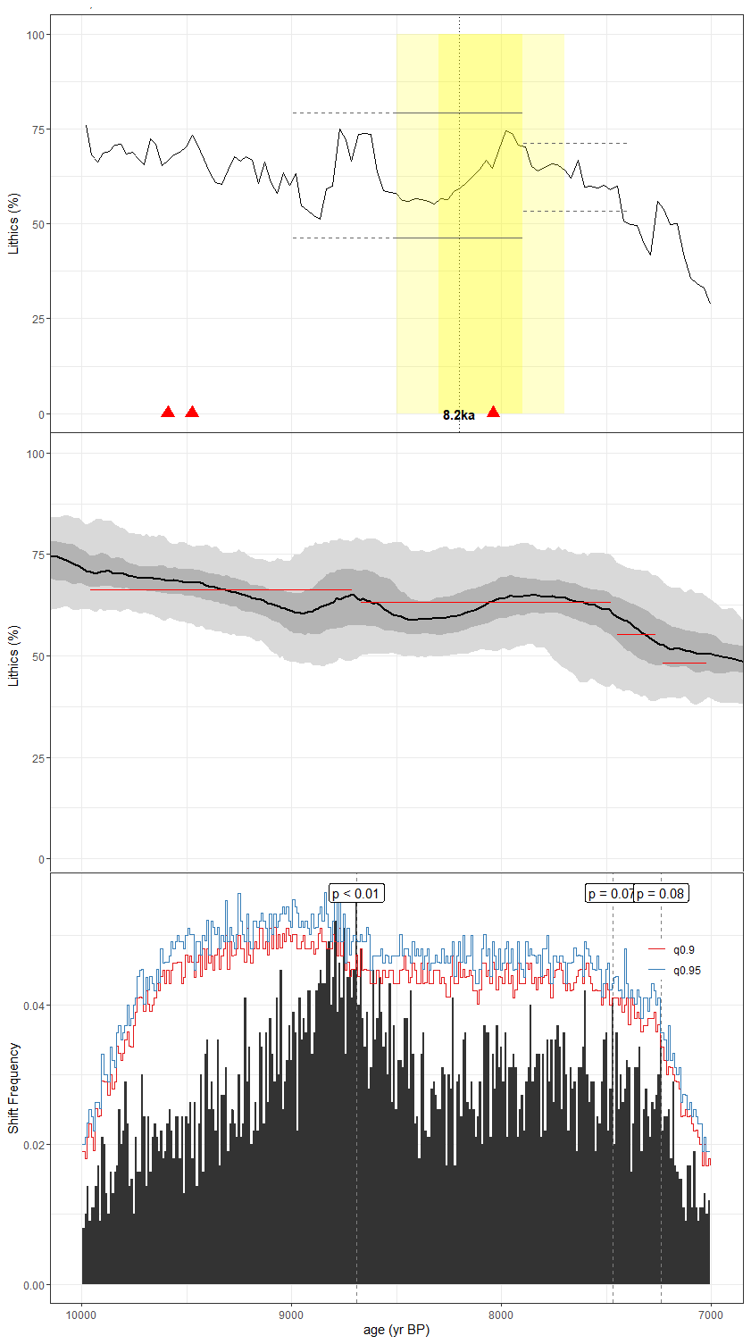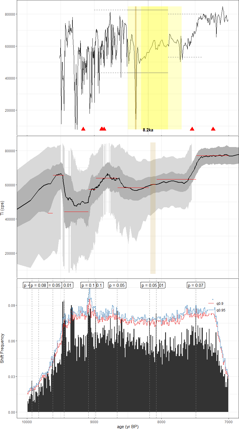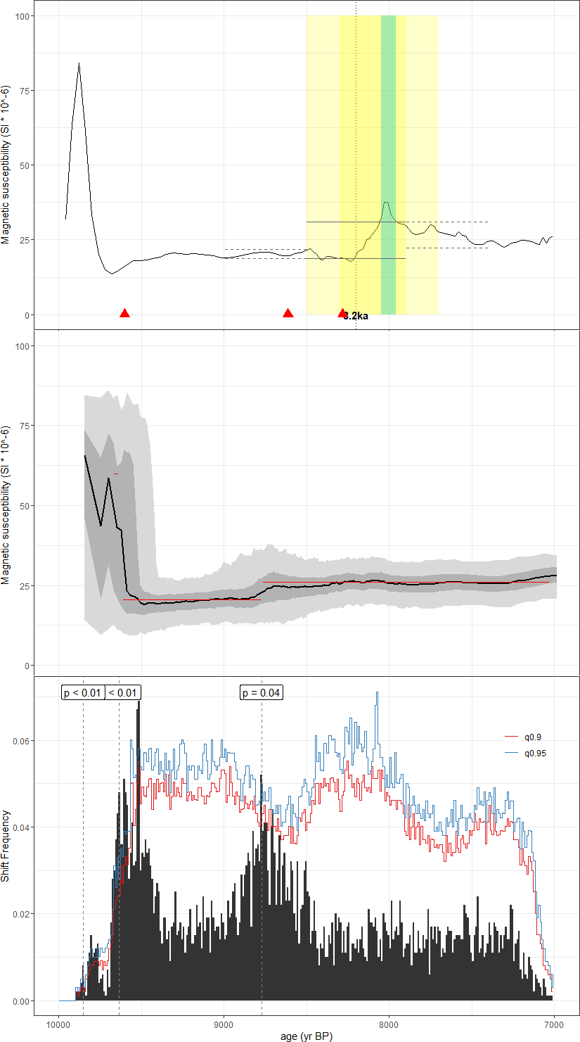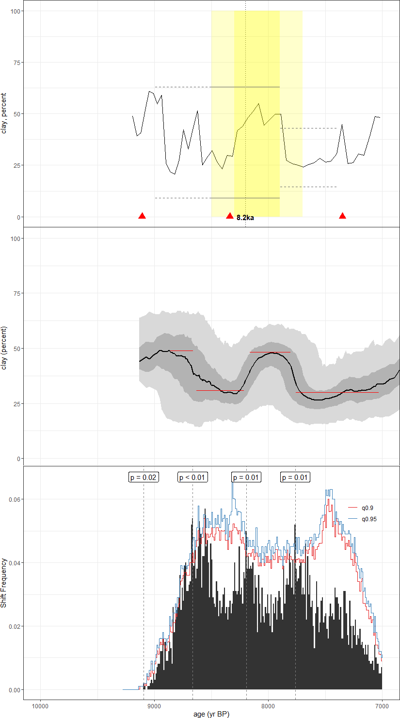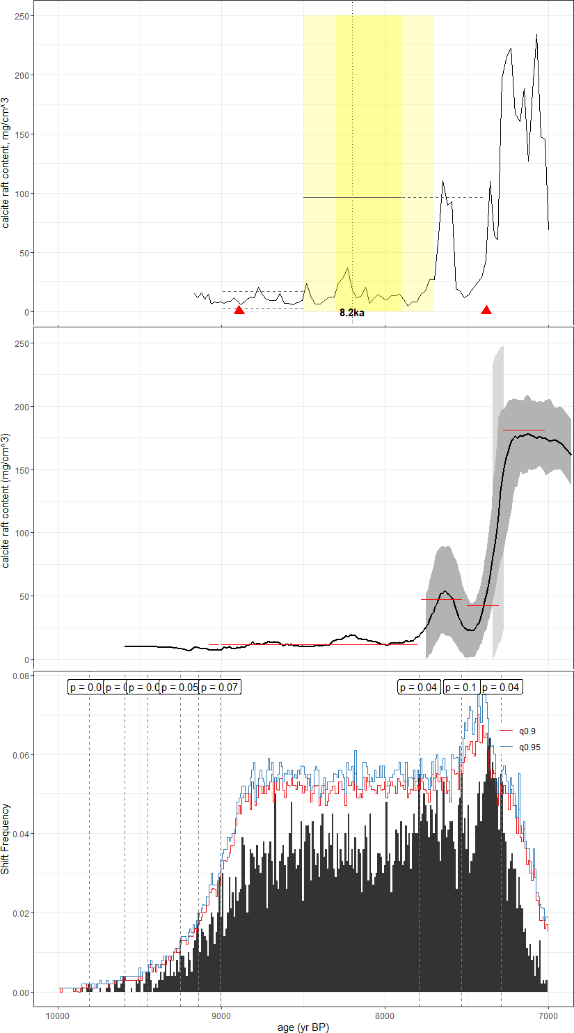 Two types of events were characterized based on the actR results. “Significant events” are defined by the presence of two consecutive changepoints with p<0.05 over the 7.9–8.3 ka window (“start” and “end”. If more than two consecutive changepoints exist over that window, the two with the lowest p-values and highest probability are used. The difference between “start” and “end” dates is used to calculate event duration, which we assume to be between a minimum of 20 and a maximum of 300 years. The magnitude of “events” is determined by the greatest absolute value z-score in each record's median age ensemble time series between the actR-derived “start” and “end” dates, with interpretation based on the sign of the z-score corresponding to the interpretation direction of the original authors. “Tentative events” are defined by the presence of two consecutive changepoints with p<0.1 over an extended 7.7–8.5 ka window. Events lasting more than 300 years are removed from consideration. If more than two events are detected within that window, the event with the start date closer to 8.2 ka is chosen as the final 8.2 ka Event.