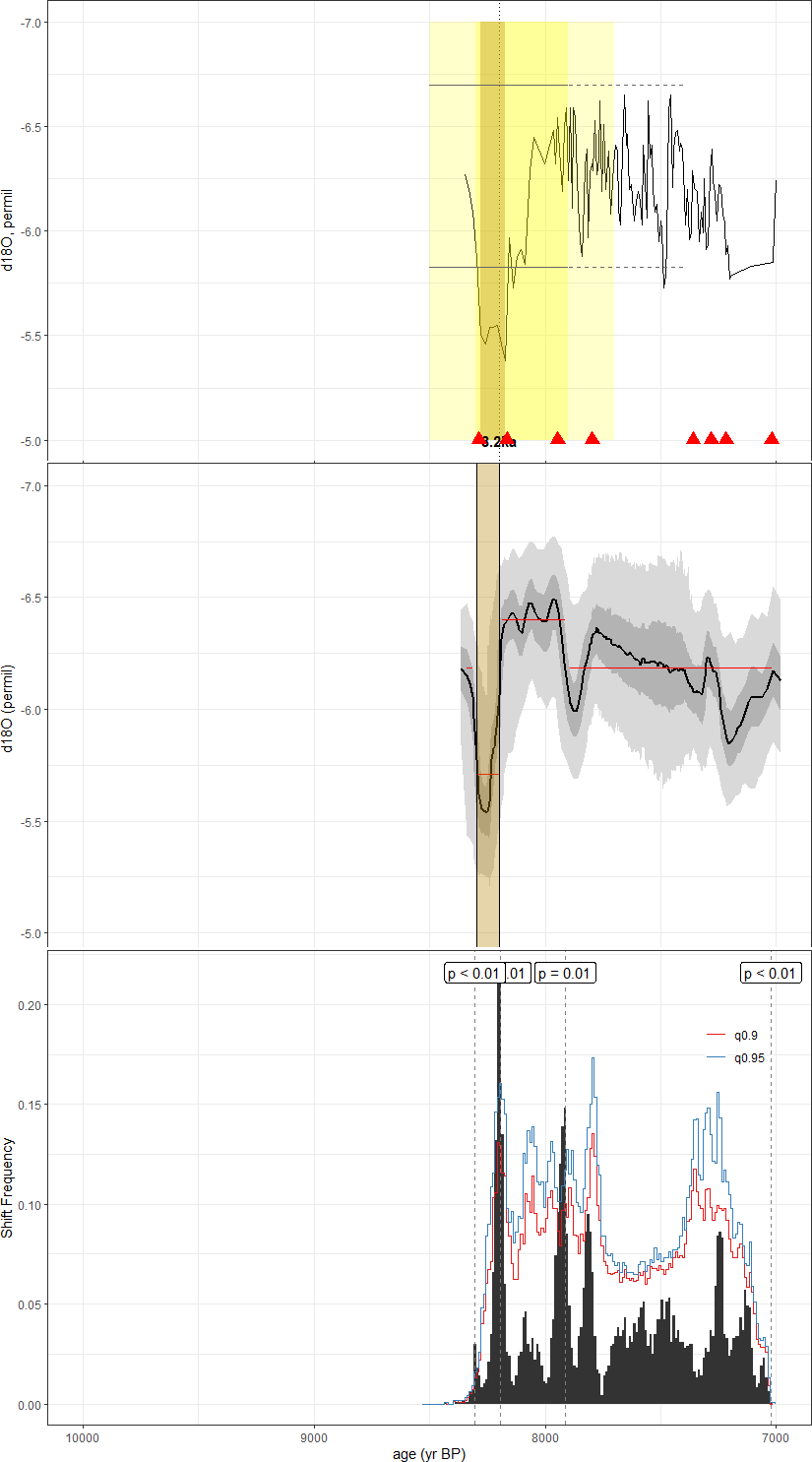 Two event detection methods were used in this study, as detailed below. The start, end, and duration of hydroclimate anomalies associated with the 8.2 ka Event were calculated for all records where both methods detected events of the same sign. This was done to leverage the strengths of each detection method and provide a more robust reconstruction of the hydroclimate response to the 8.2 ka Event.
