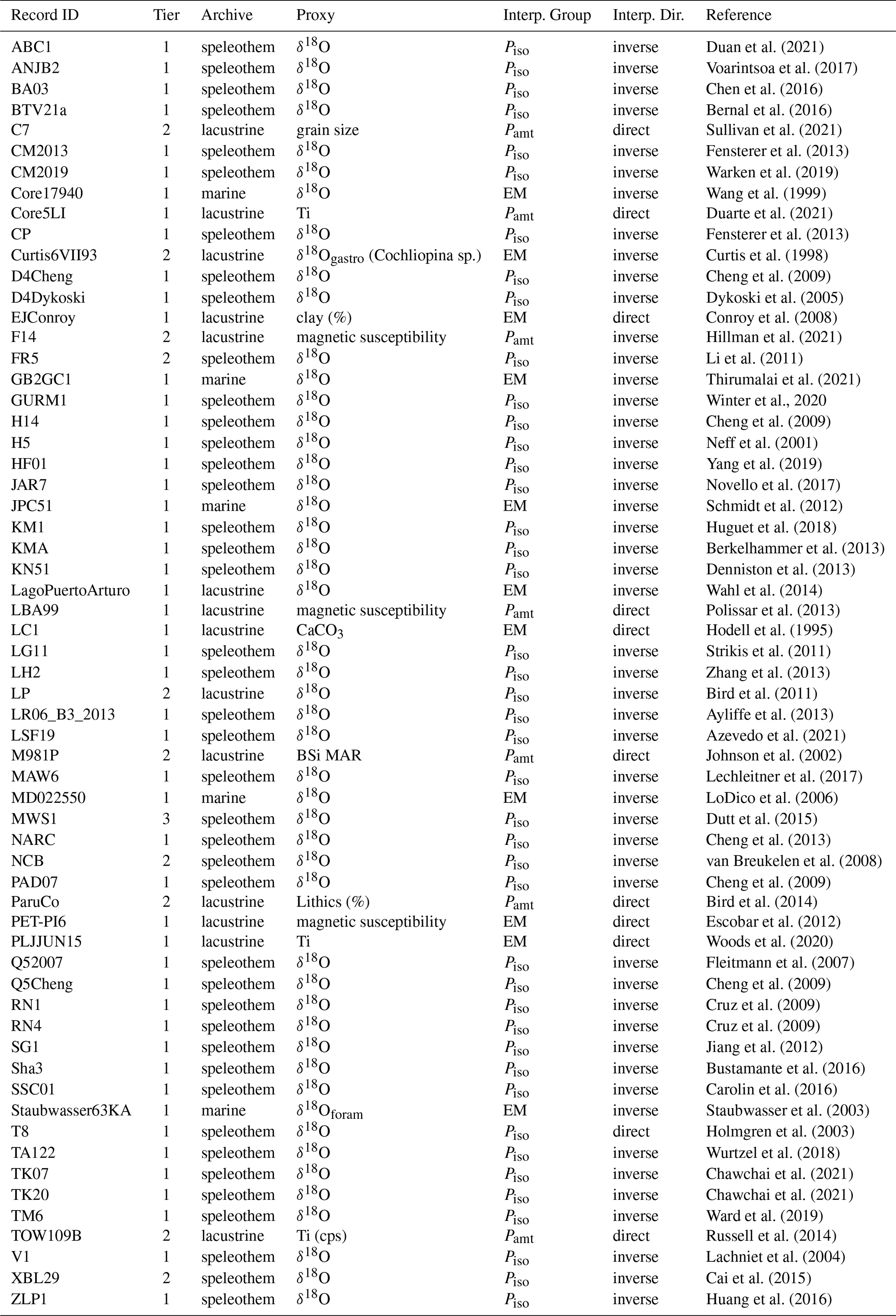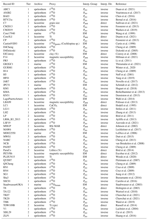 This study compiled 61 tropical hydroclimate proxy records covering 17 IPCC-designated climate regions (Fig. B2; Iturbide et al., 2020). Compared to Morrill et al. (2013), our compilation substantially improves hydroclimate proxy data coverage across the Caribbean, Central America, South America, South and East Asia, and the Maritime Continent. The compilation comprises 42 speleothem records (∼ 69 %), 14 lacustrine records (∼ 23 %), and 5 marine records (∼ 8 %; Table 2). When categorized by hydroclimate interpretation, the compilation includes 43 Piso records (70.5 %), 11 EM records (18 %), and 7 Pamt records (11.5 %; Fig. 1; Table 2). For the purpose of this study, records which fully meet all inclusion criteria are designated as Tier 1 records (n=50, 82 %), forming the basis for the data-model intercomparison. Records which fail to meet either the minimum paleodata resolution or radiometric date requirements are classified as Tier 2 records and are included as supporting datasets (n=10, 16 %). One record (MWS1; Dutt et al., 2015) failed to meet both requirements, thus it is designated as a Tier 3 record, and has been excluded from further analysis.