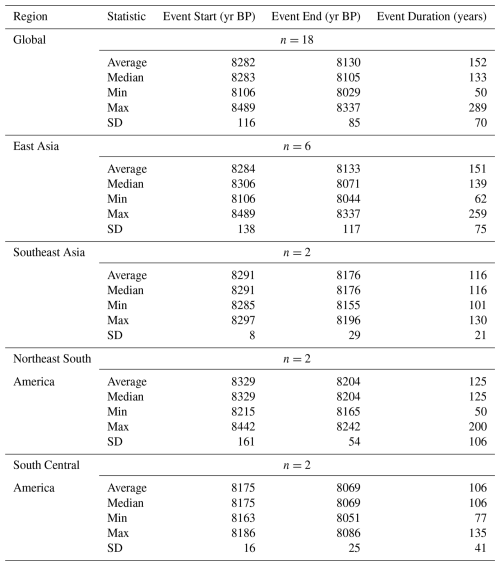 Table 3Start, end, and duration of the 8.2 ka Event in the global compilation and the four regions discussed in this study.