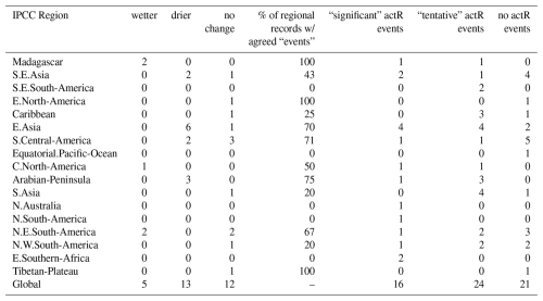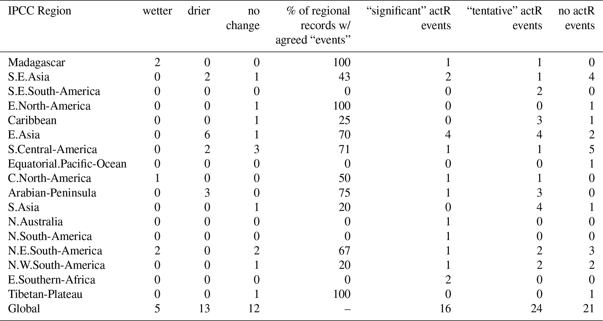 Table 4Regional and global summary of 8.2 ka events detected by actR and our MM classification methods, separated by the sign of the anomaly (“wetter”, “drier”, and “no change”).