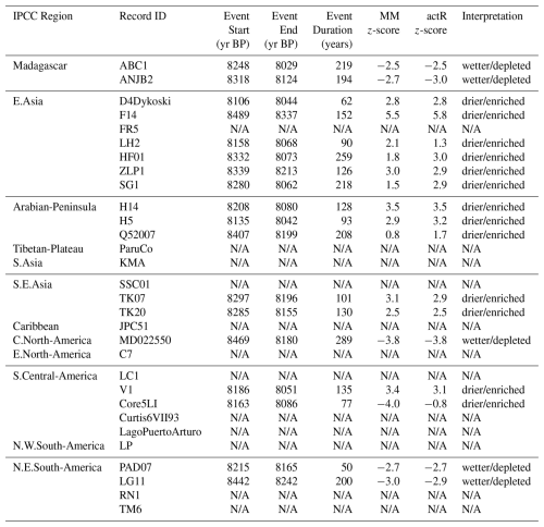 Wetter and/or isotopically depleted events were detected in five of the 30 records in the final compilation. Namely, the Madagascar speleothem records of Voarintsoa et al. (2017; ANJB2; Fig. C2) and Duan et al. (2021; ABC1; Fig. C1) showed negative isotopic excursions of −3.0σ and −2.5σ, respectively, while the two Brazilian speleothem records from Lapa Grande Cave (Strikis et al., 2011; LG11; Fig. C3) and Padre Cave (Cheng et al., 2009; PAD07; Fig. C5) exhibited negative isotopic excursions of −2.9σ and −2.7σ, respectively (Table 5). In addition, a large isotopic depletion event (−3.8σ) was detected in the foraminifera δ18O record from the Gulf of Mexico (LoDico et al., 2006; MD022550; Fig. C4).