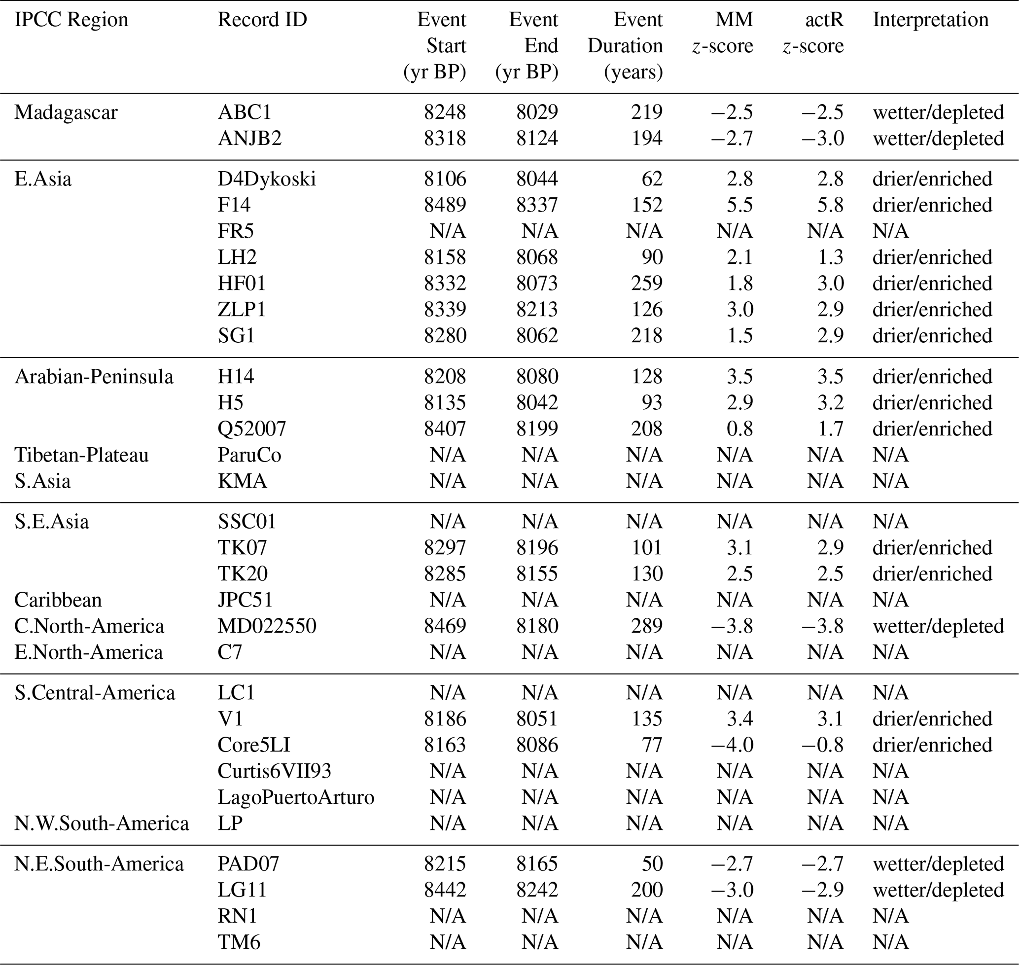 Table 5The timing, duration, magnitude, and interpretation of the 8.2 ka Event for records with agreement between MM and actR methods. “N/A” signifies that we detected no event in the associated record using either method.