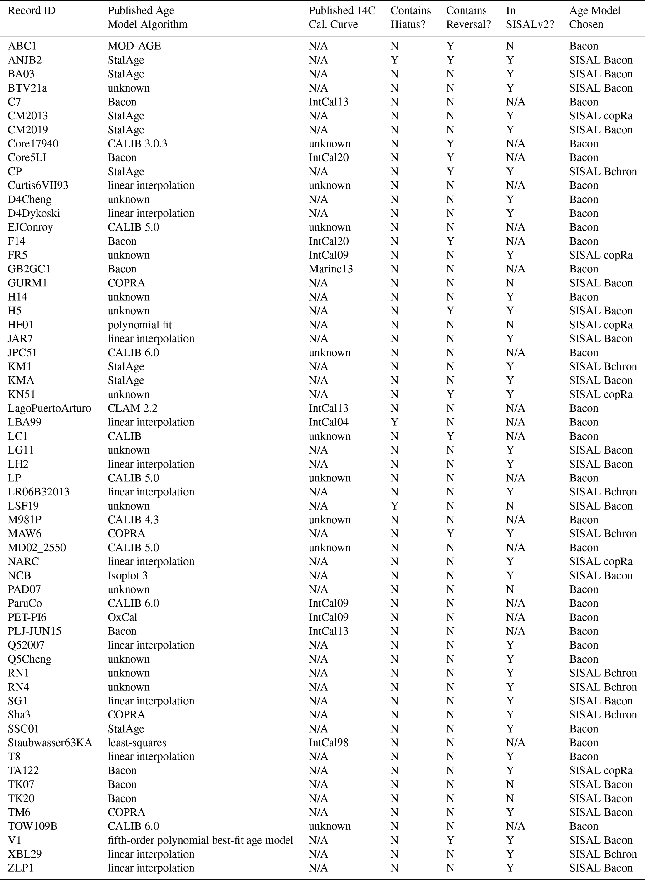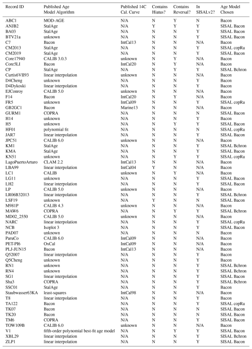 To reduce uncertainty arising from the differences in age modeling algorithms offered through geoChronR, we prioritized the use of BACON (Blaauw and Christen, 2011) across our records, including those in the SISALv2 database, where available. If a BACON age ensemble was not constructed for a SISALv2 dataset, we employed the Bchron (Haslett and Parnel, 2008) or copRA (Breitenbach et al., 2012) ensembles instead.