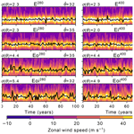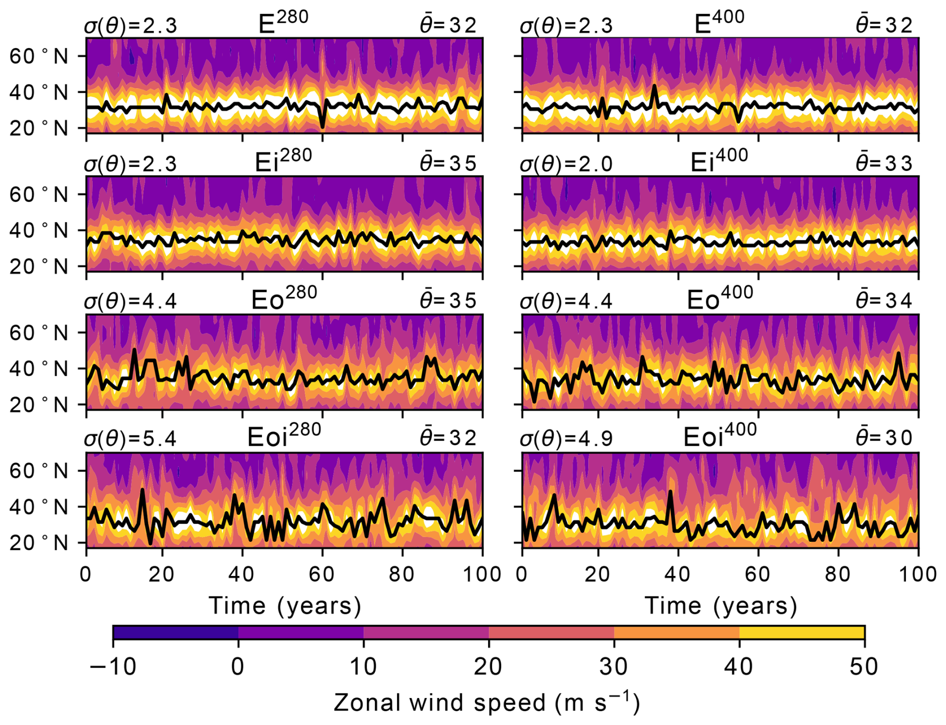 Figure 10Hovmöller diagrams for the zonal mean wind speed at 200 hPa for 100 Januaries for the North Pacific from the eight HadCM3 experiments. The black line indicates the latitude of maximum zonal wind speed. The mean latitude of the jet (), and the standard deviation in the latitude (σ(θ)) are shown for each experiment.