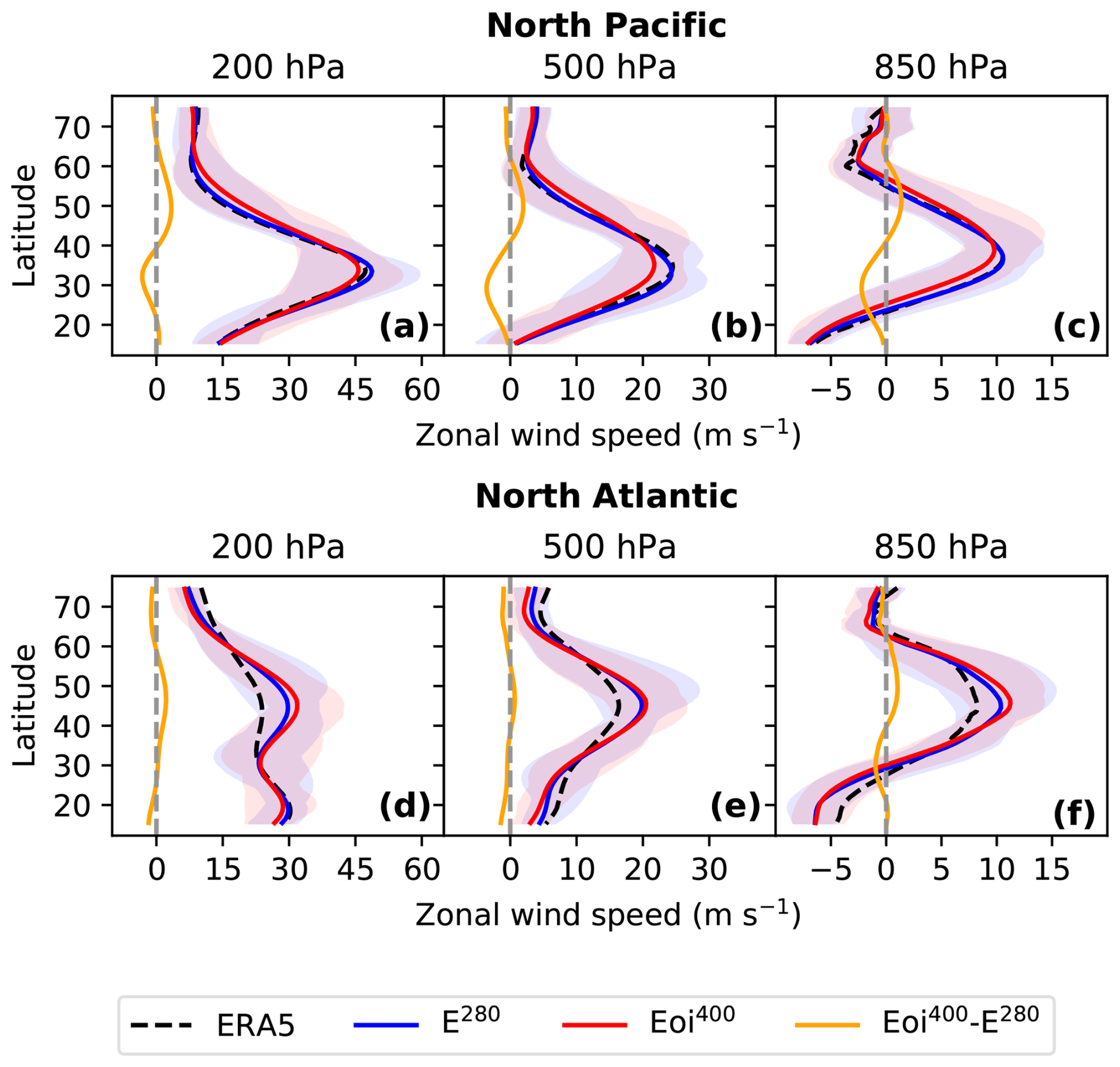 Figure 1Boreal winter (DJF), multi-model mean zonal wind speeds for the pre-industrial (E280), Late Pliocene (Eoi400) and the anomaly (Eoi400–E280). ERA5 reanalysis data is shown in the dashed black line. (a–c) is for the North Pacific region and (d–f) is for the North Atlantic. Shading represents the multi model range.