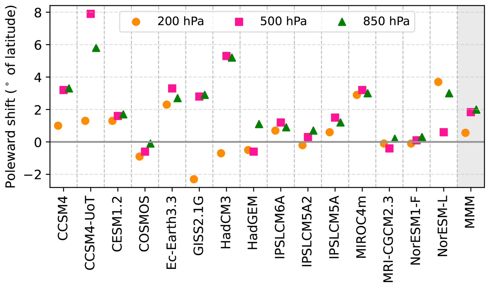 Figure 2Poleward shift of the latitude of maximum zonal wind in the North Pacific region in boreal winter (DJF) at three pressure levels across all the models and the multi-model mean (MMM). Positive values indicated the jet is poleward in the Late Pliocene experiments compared to the pre-industrial control simulations.