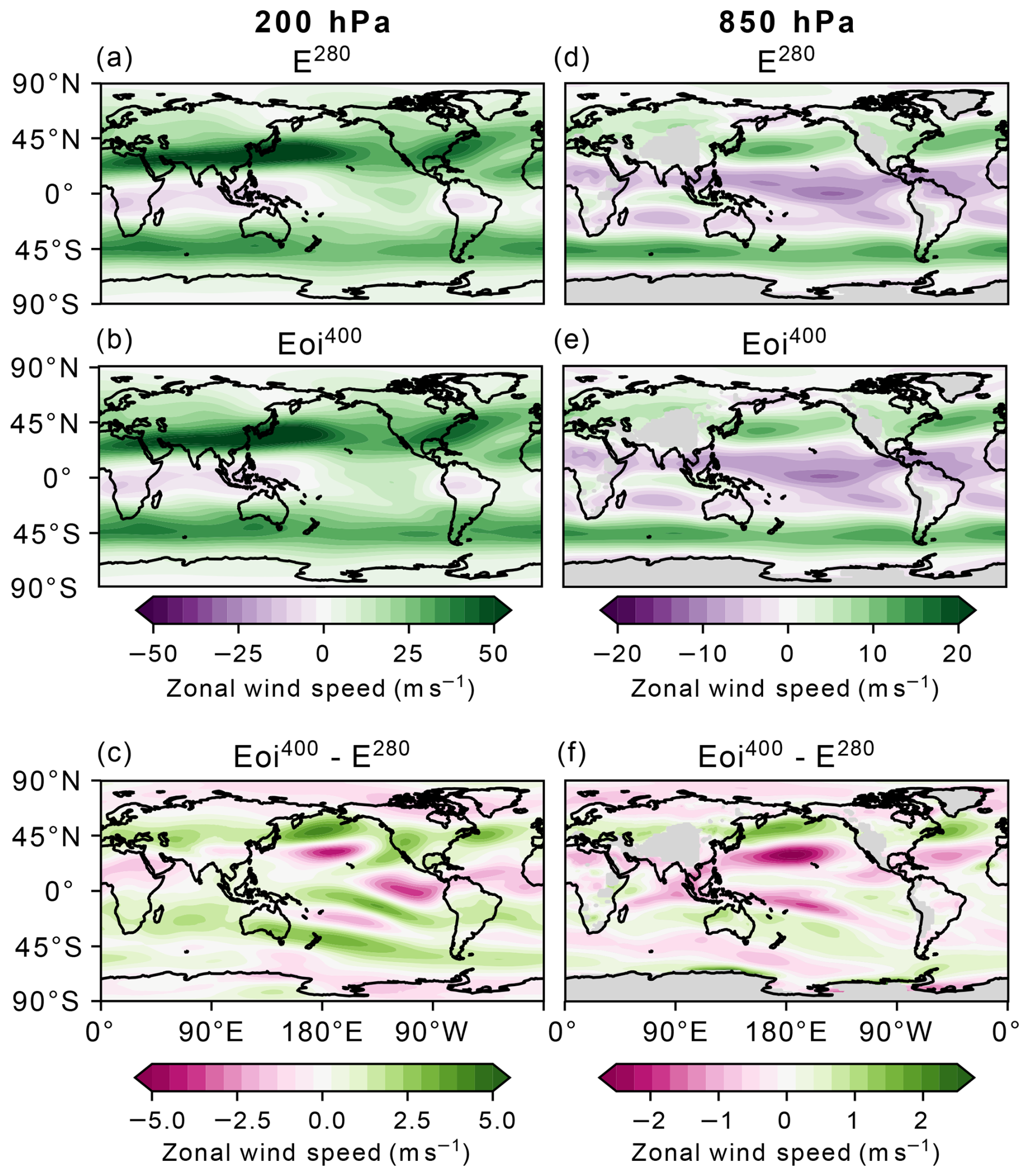 Figure 3Multi-model mean zonal wind speeds for 200 hPa (a–c) and 850 hPa (d–f). The lower plots show the difference between the Late Pliocene (Eoi400) and the Pre-Industrial (E280). Note the difference in scales between the two pressure levels.