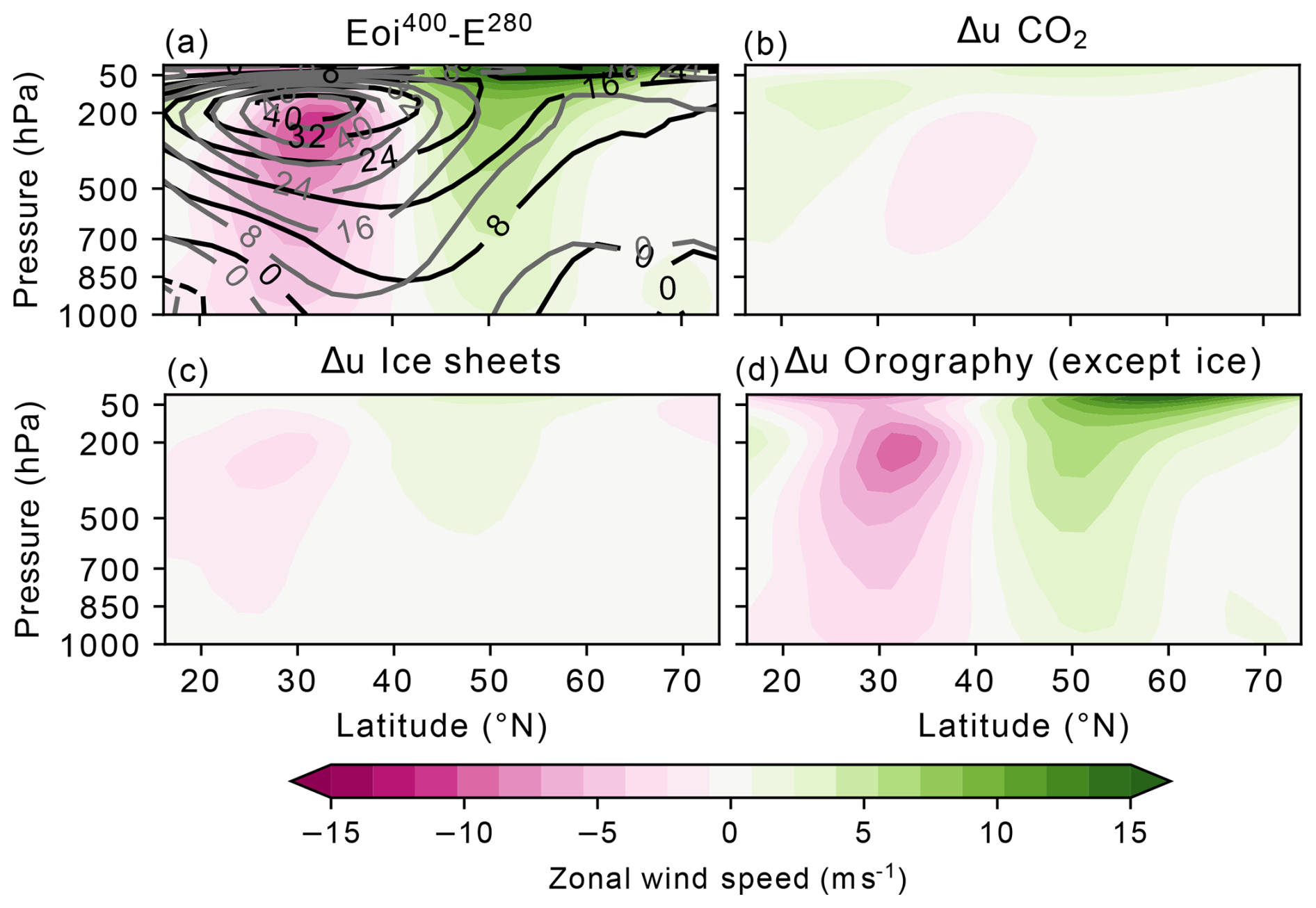 Figure 4Change in boreal winter (DJF) 200 hPa zonal wind speed between the Late Pliocene (Eoi400) and the Pre-industrial (E280) in HadCM3 and the contribution of the change from CO2, ice sheet and orography forcing to the total change. In plot (a) the grey contours show the 30 m s−1 value in the E280 experiment.